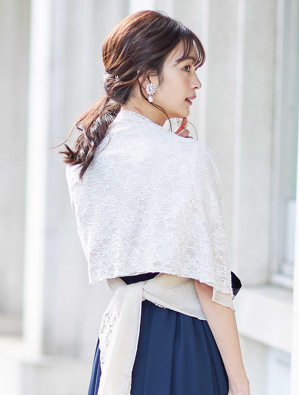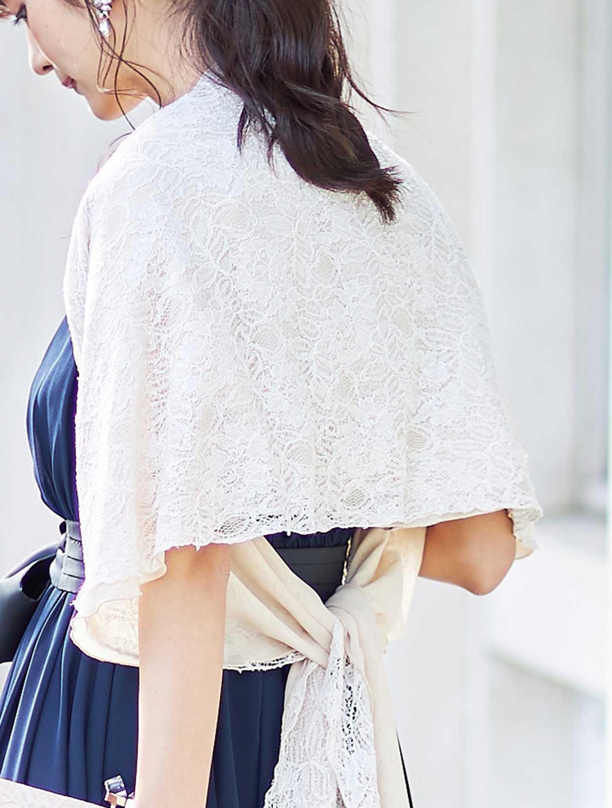 レースをあしらったショールは、嬉しい袖通し付き。肩からずれ落ちる心配なくノンストレスで着られる優れもの。