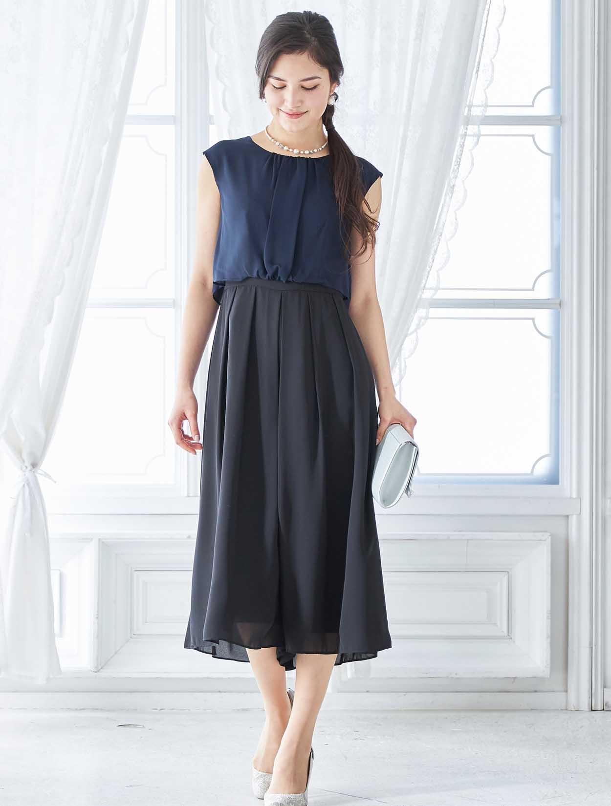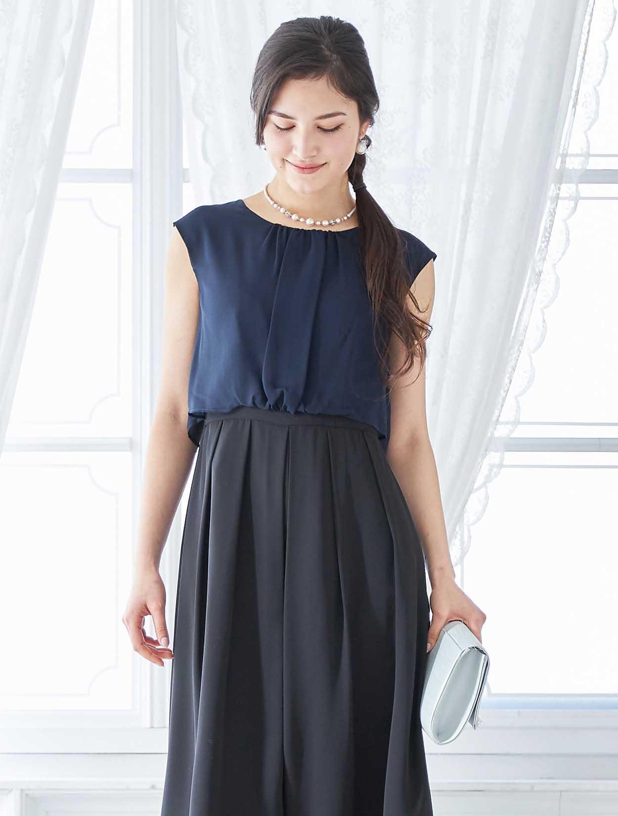 ダークカラーのコンビネーションが落ち着きを纏うパンツドレス