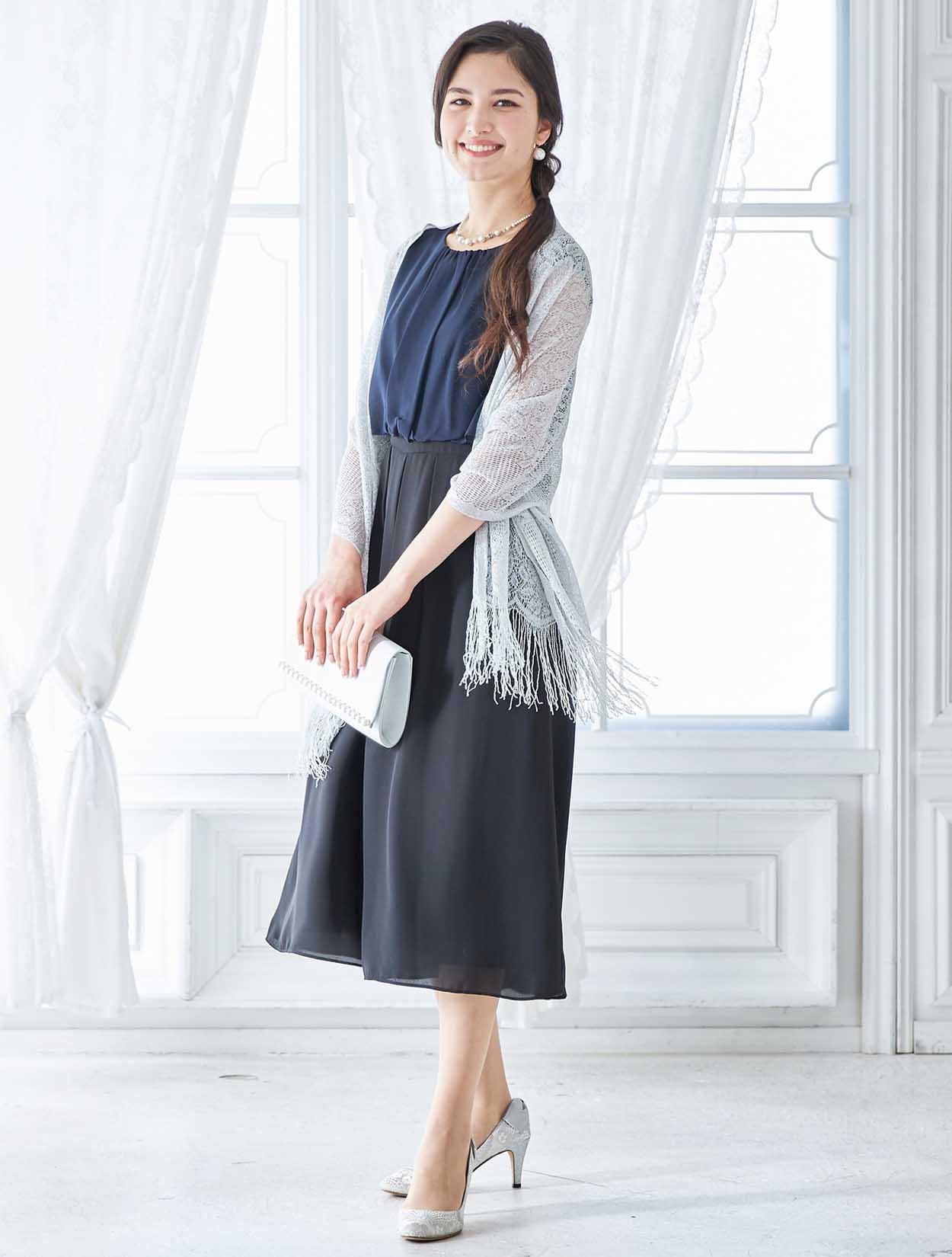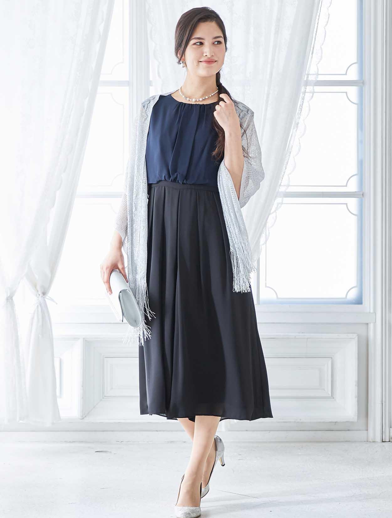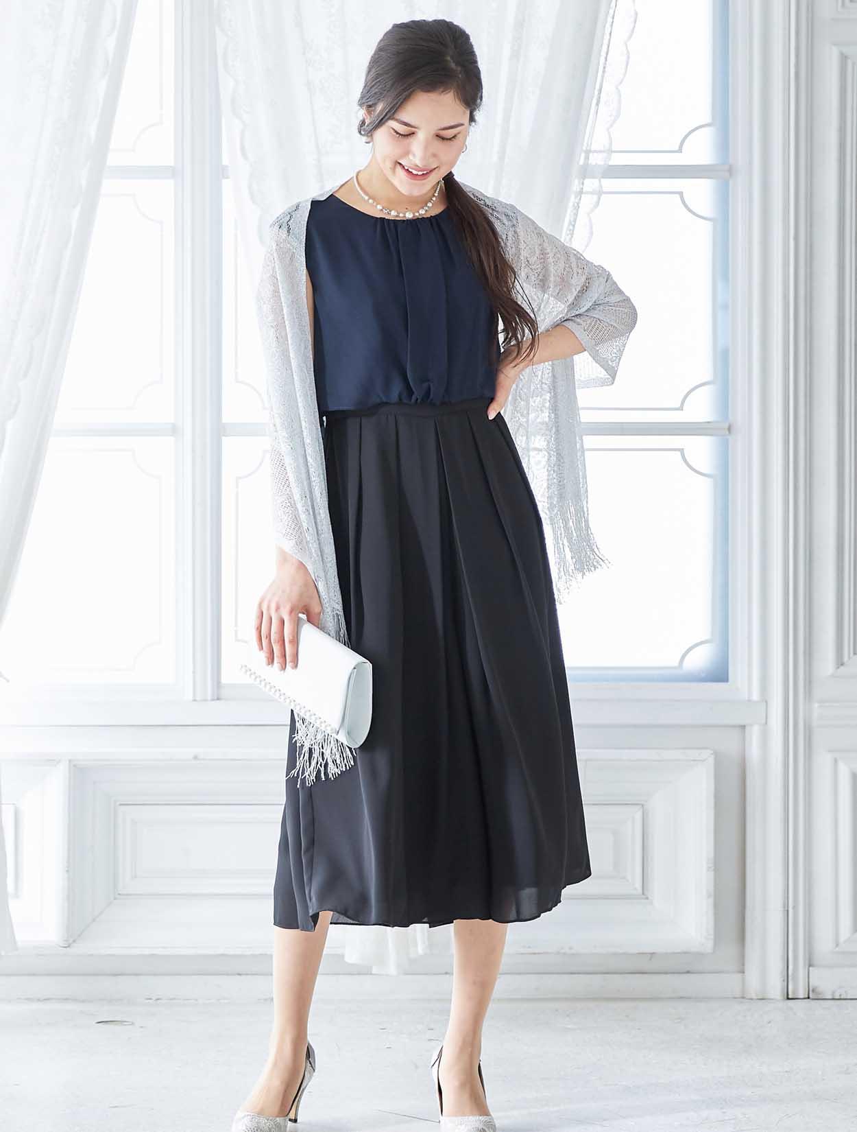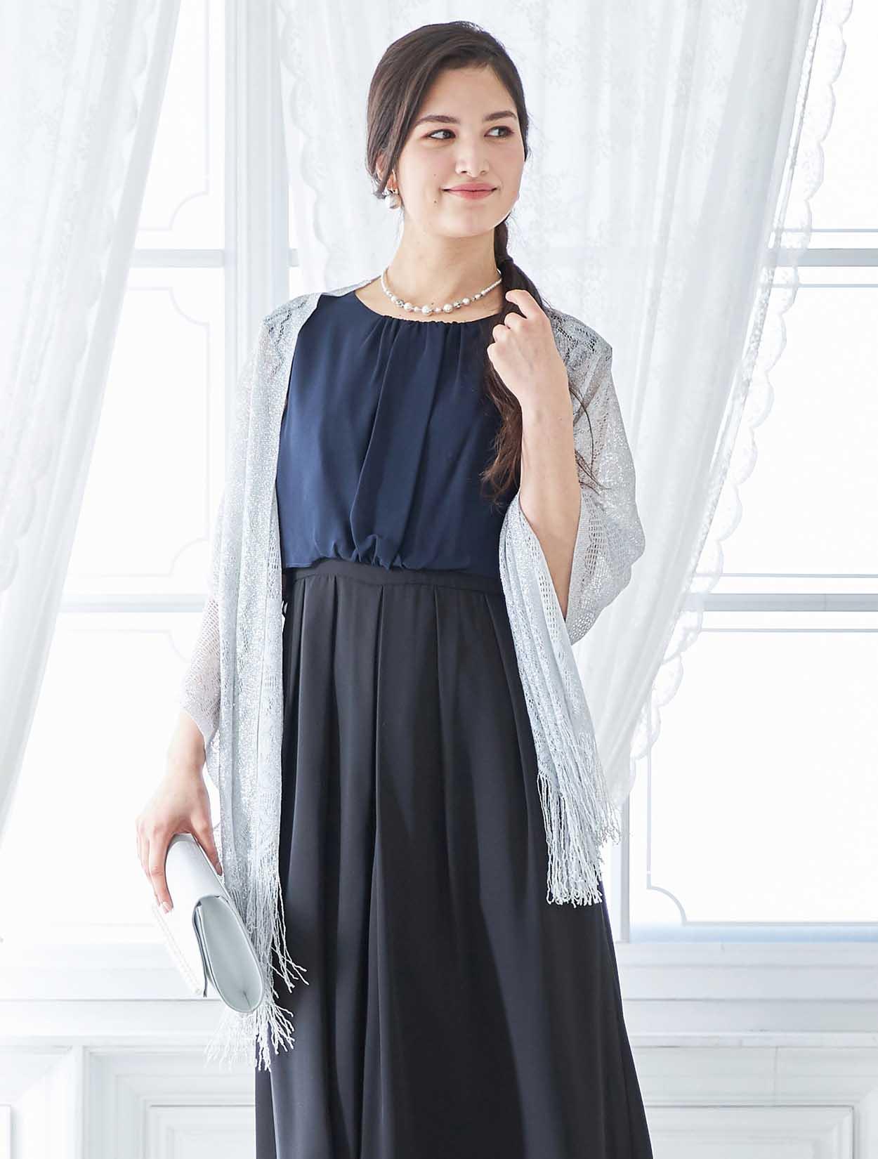 バイカラーのドレスをシルバーの小物で揃えて統一感のある大人のスタイリングに。