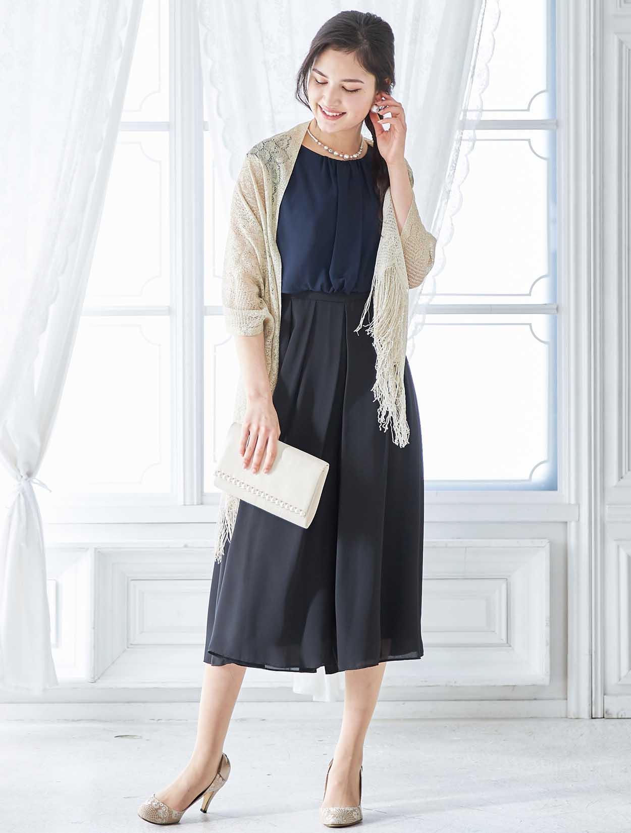 ダークカラーのコンビネーションが落ち着きを纏うパンツドレス
