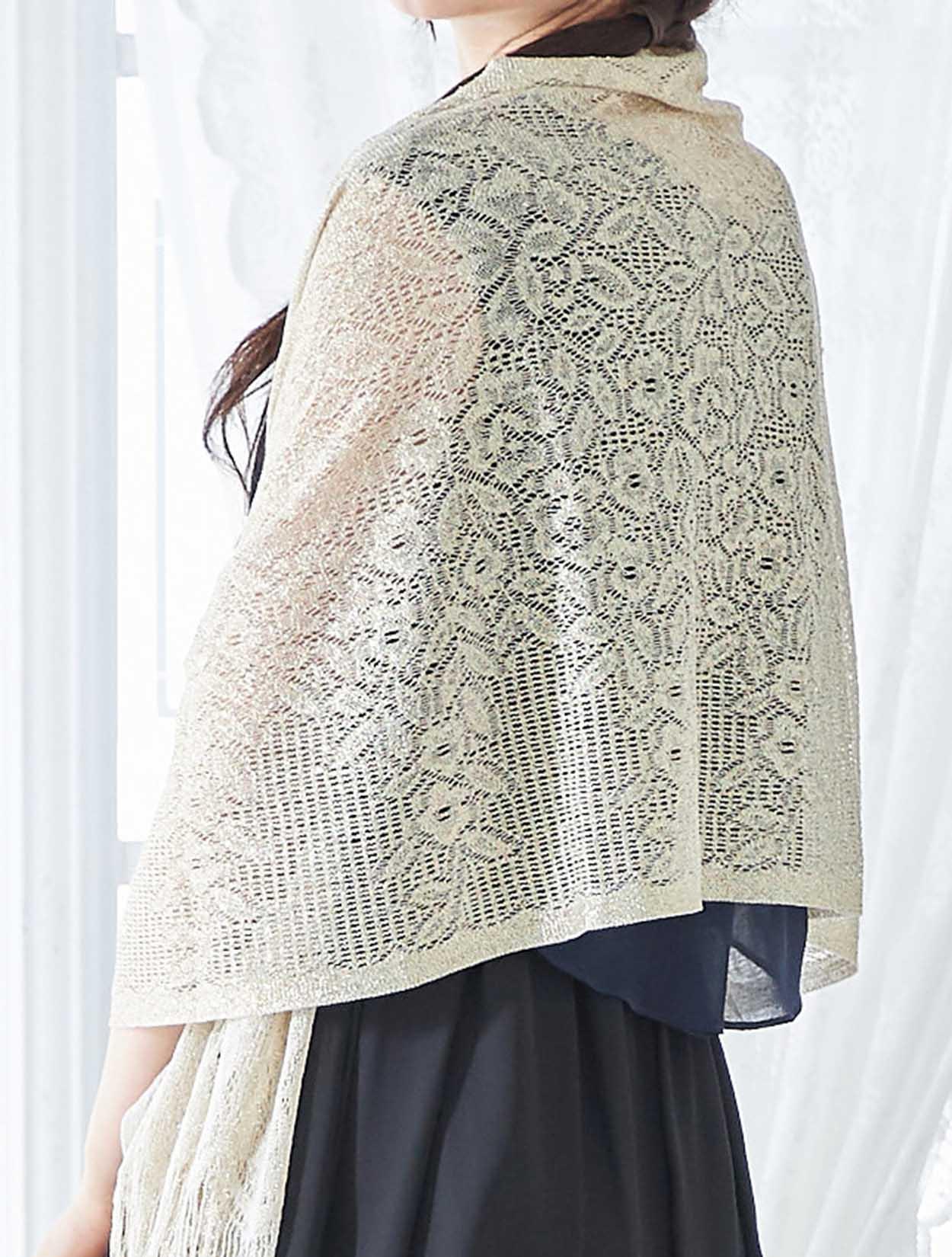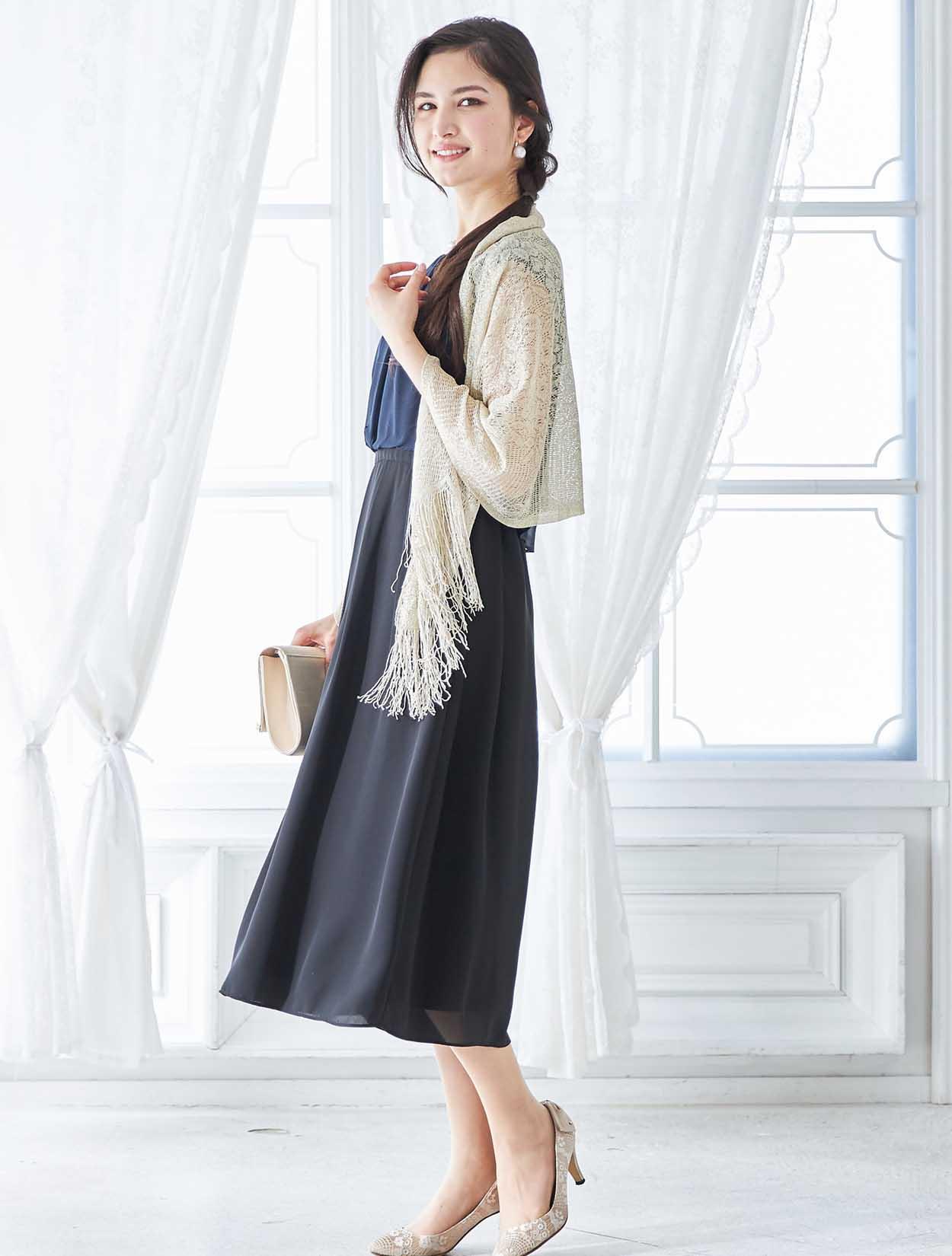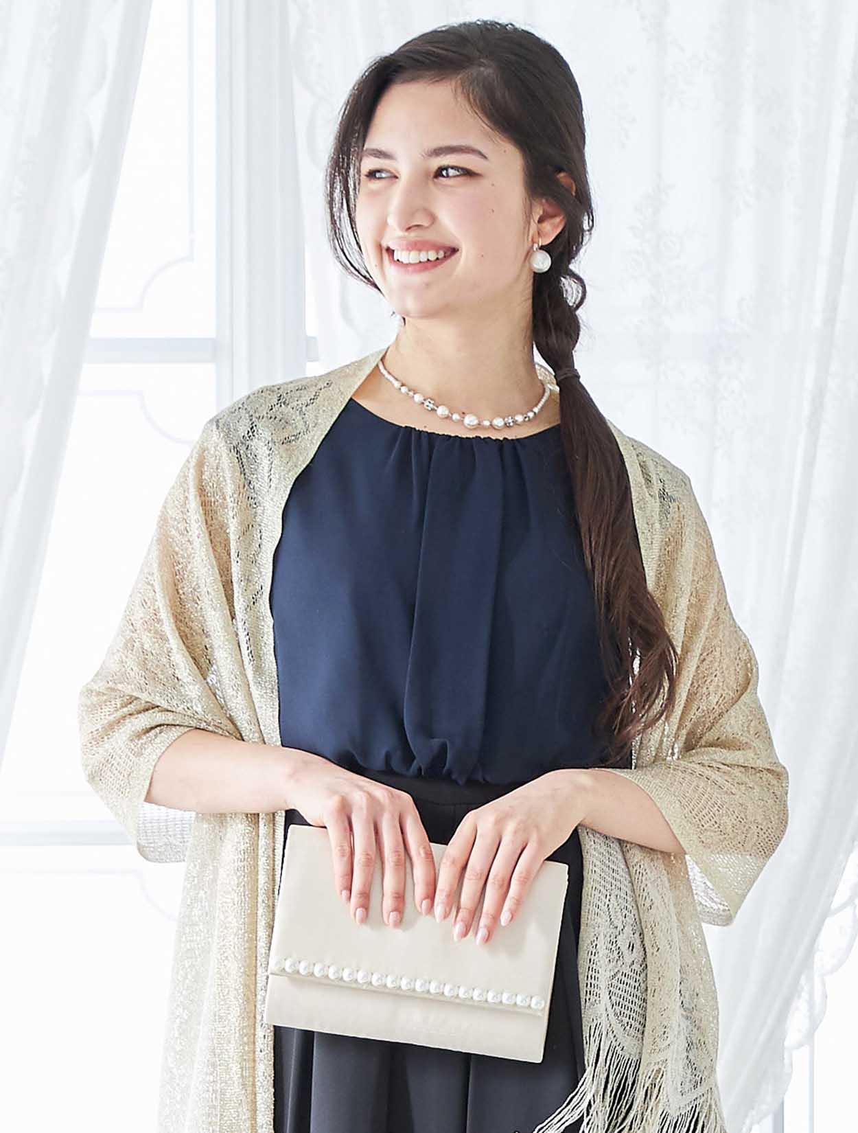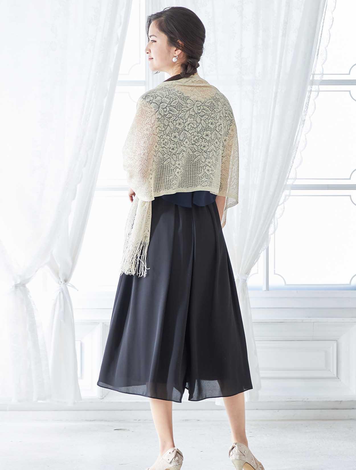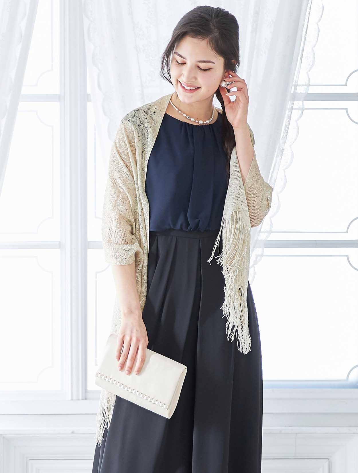 落ち着いたカラーのドレスもゴールドのショールで一気に華やかなパーティースタイルに。