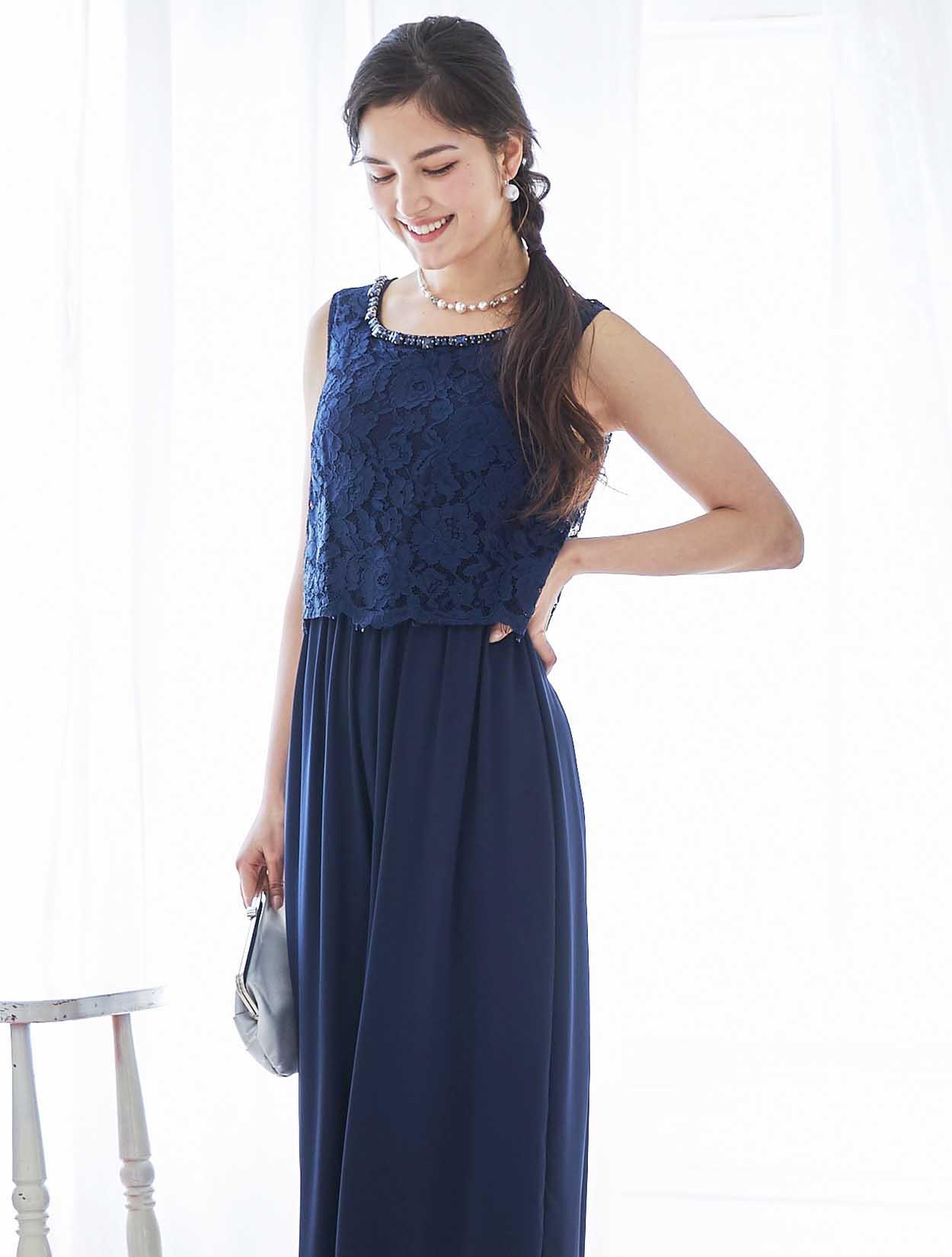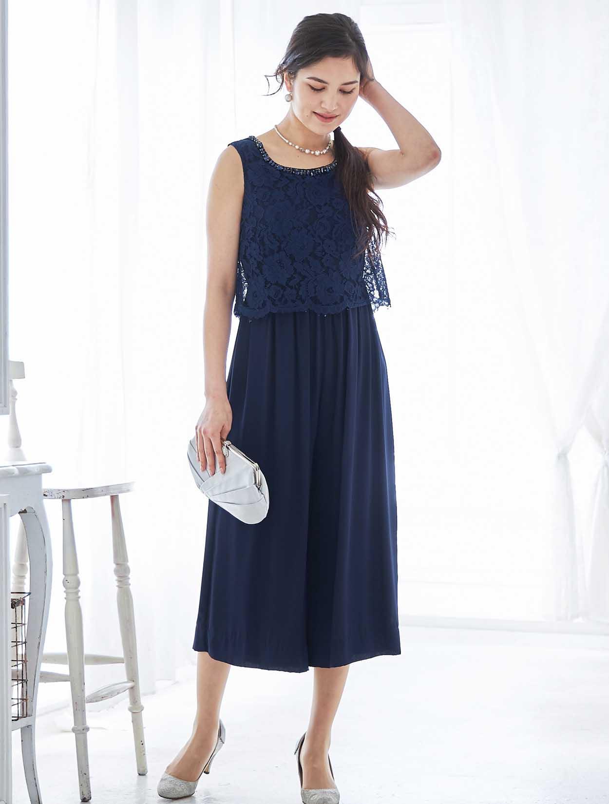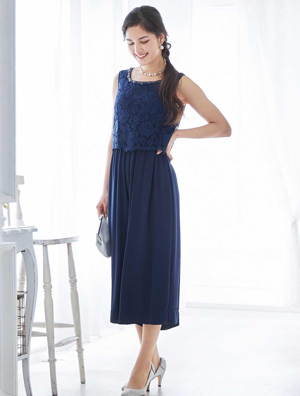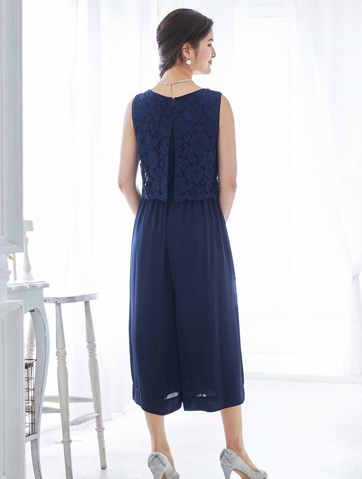 鮮やかなネイビーが映える端正なパンツドレス