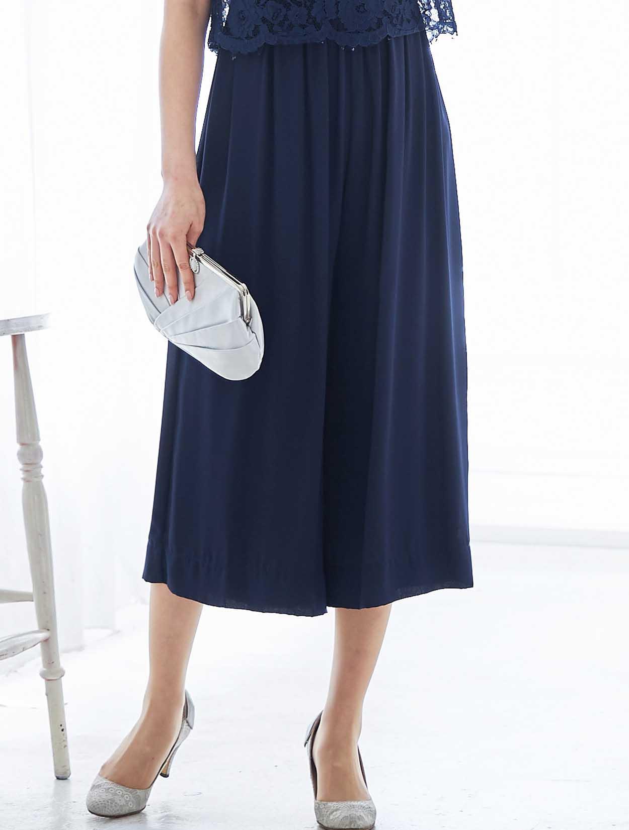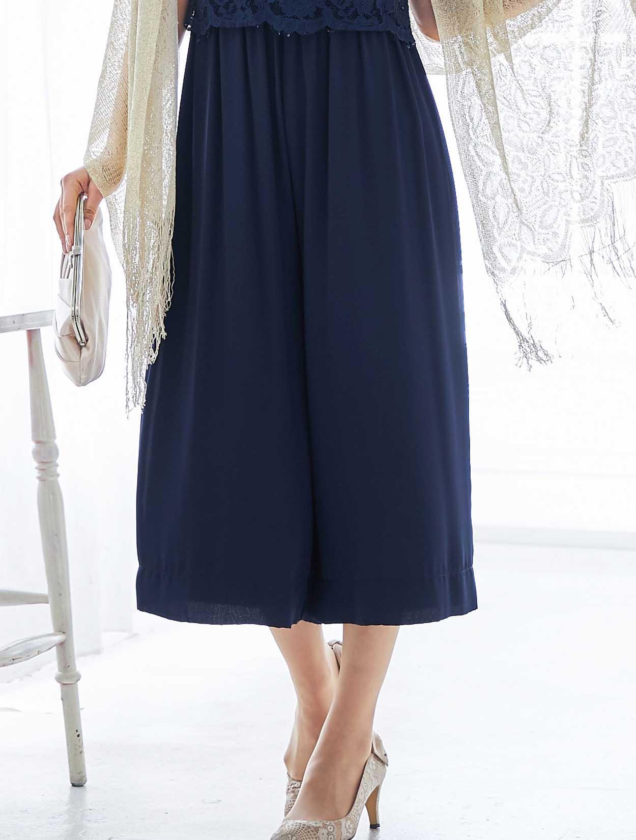 広がらないワイドパンツは一見スカートの様なデザイン。初めてのパンツドレスにもおすすめの一着です。トップスをレイヤードしたようなデザインは、ウエスト周りもさり気なくカバー。