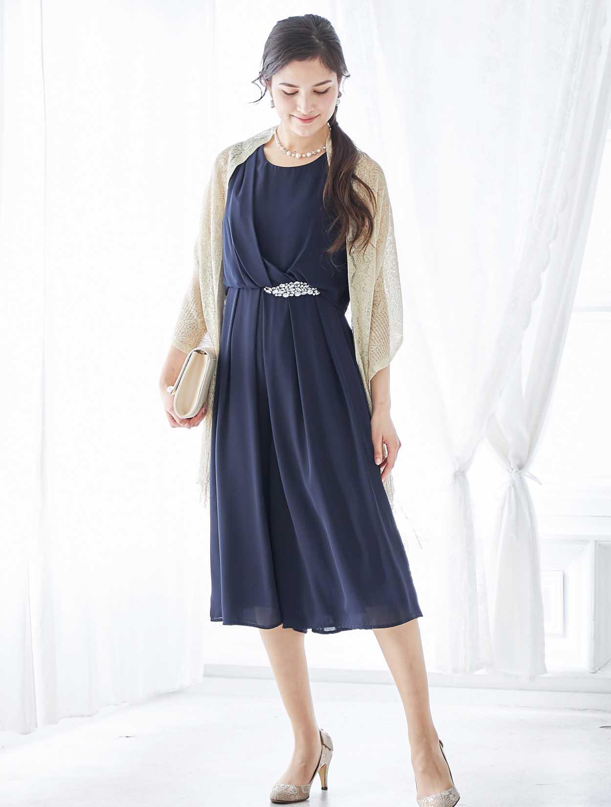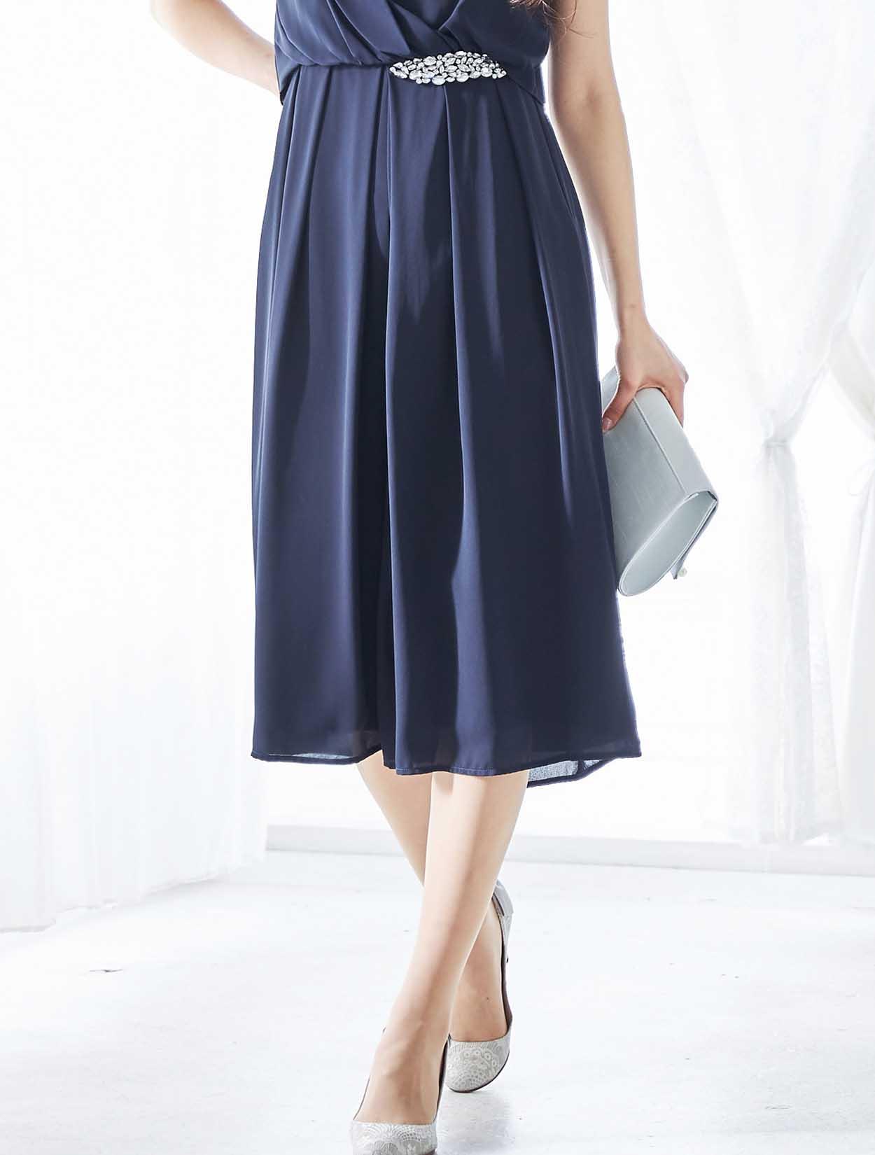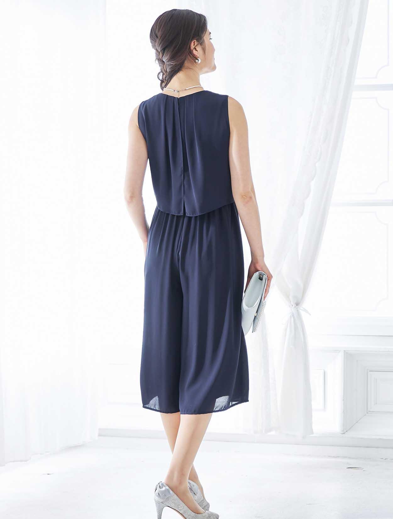 ビジューが輝くアクセントの上品なカラーのパンツドレス
