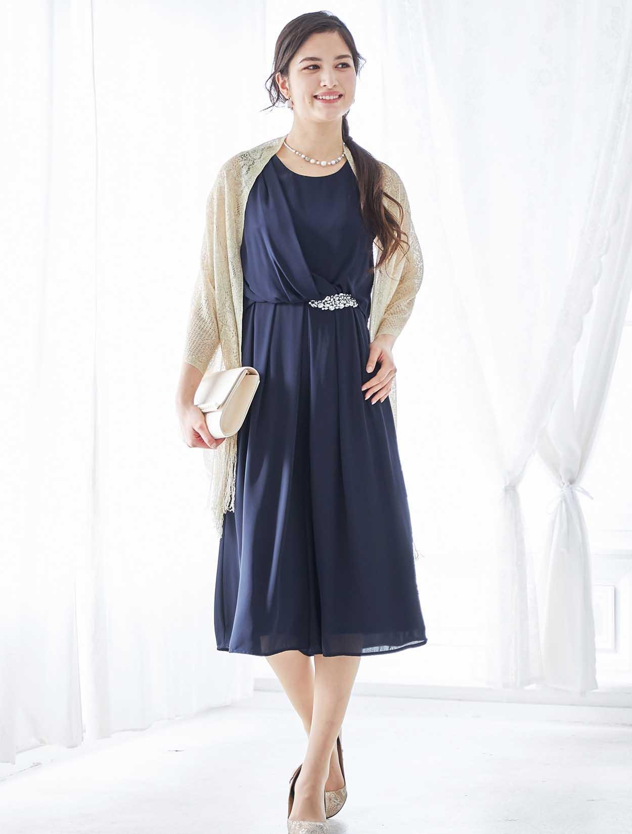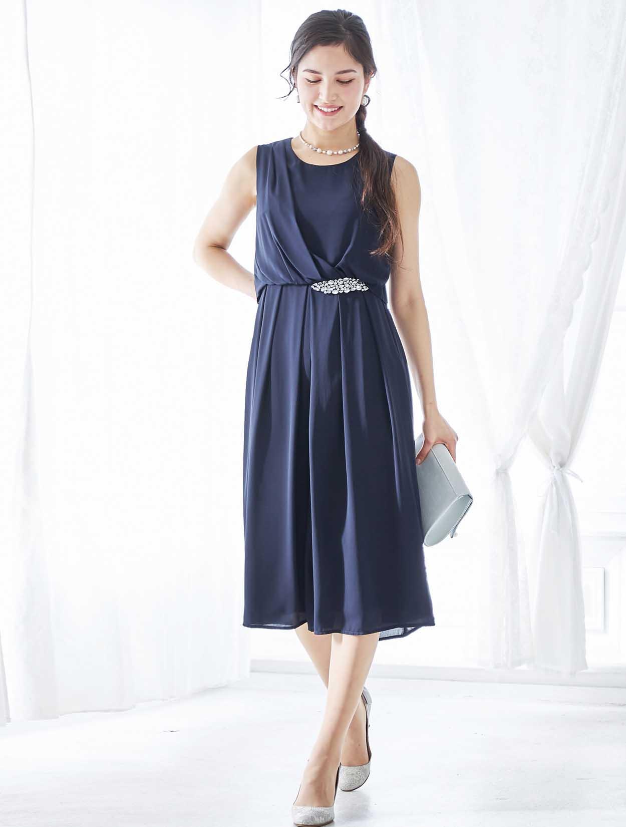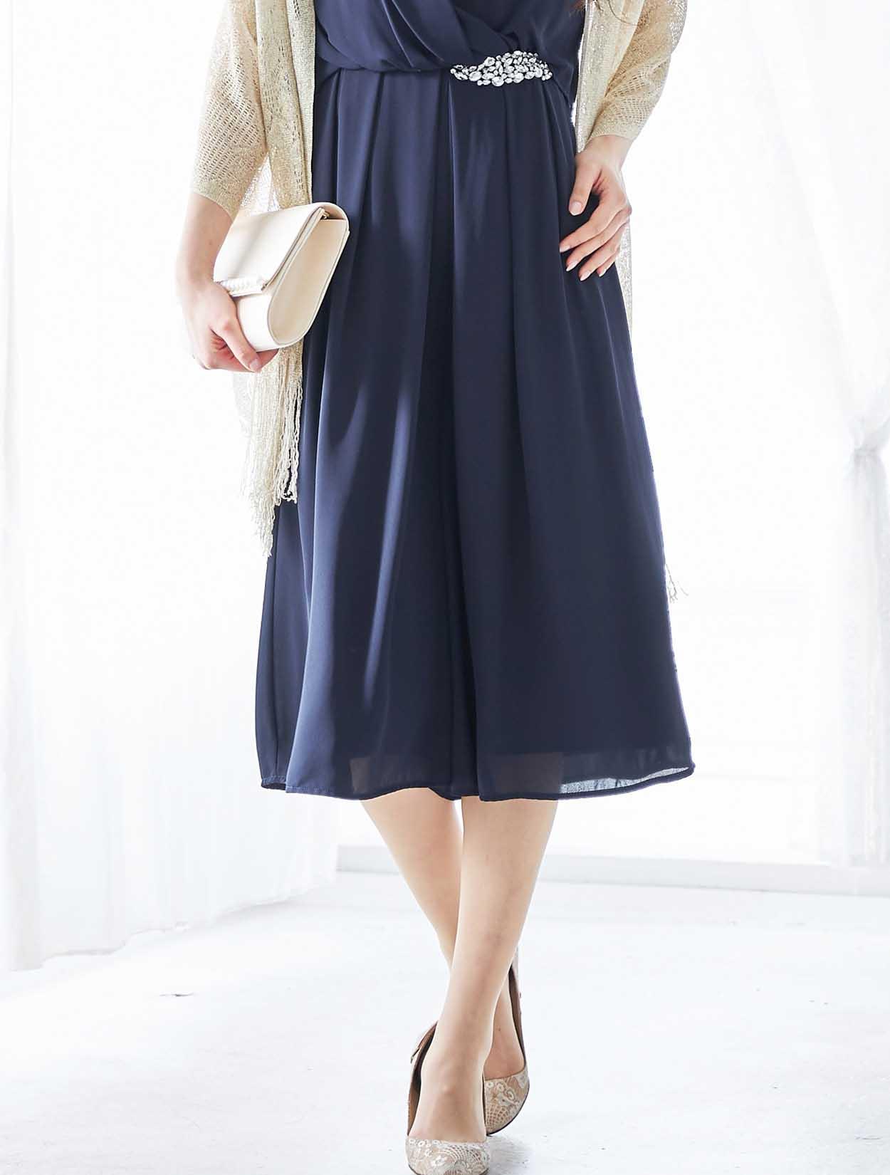 ビジューが輝くアクセントの上品なカラーのパンツドレス