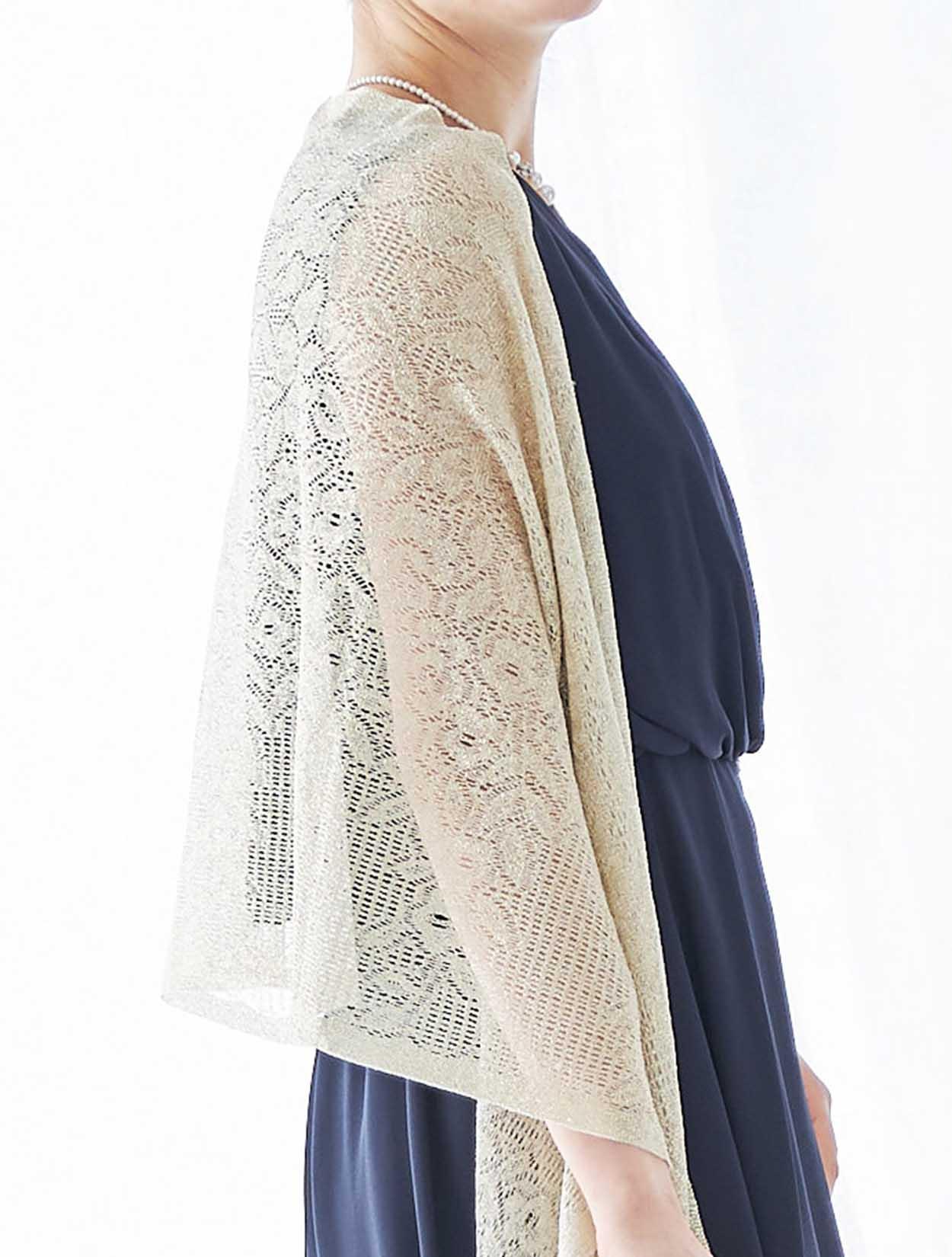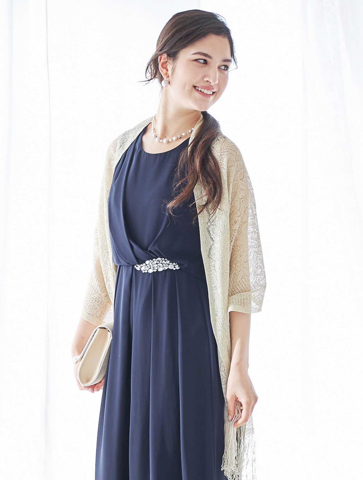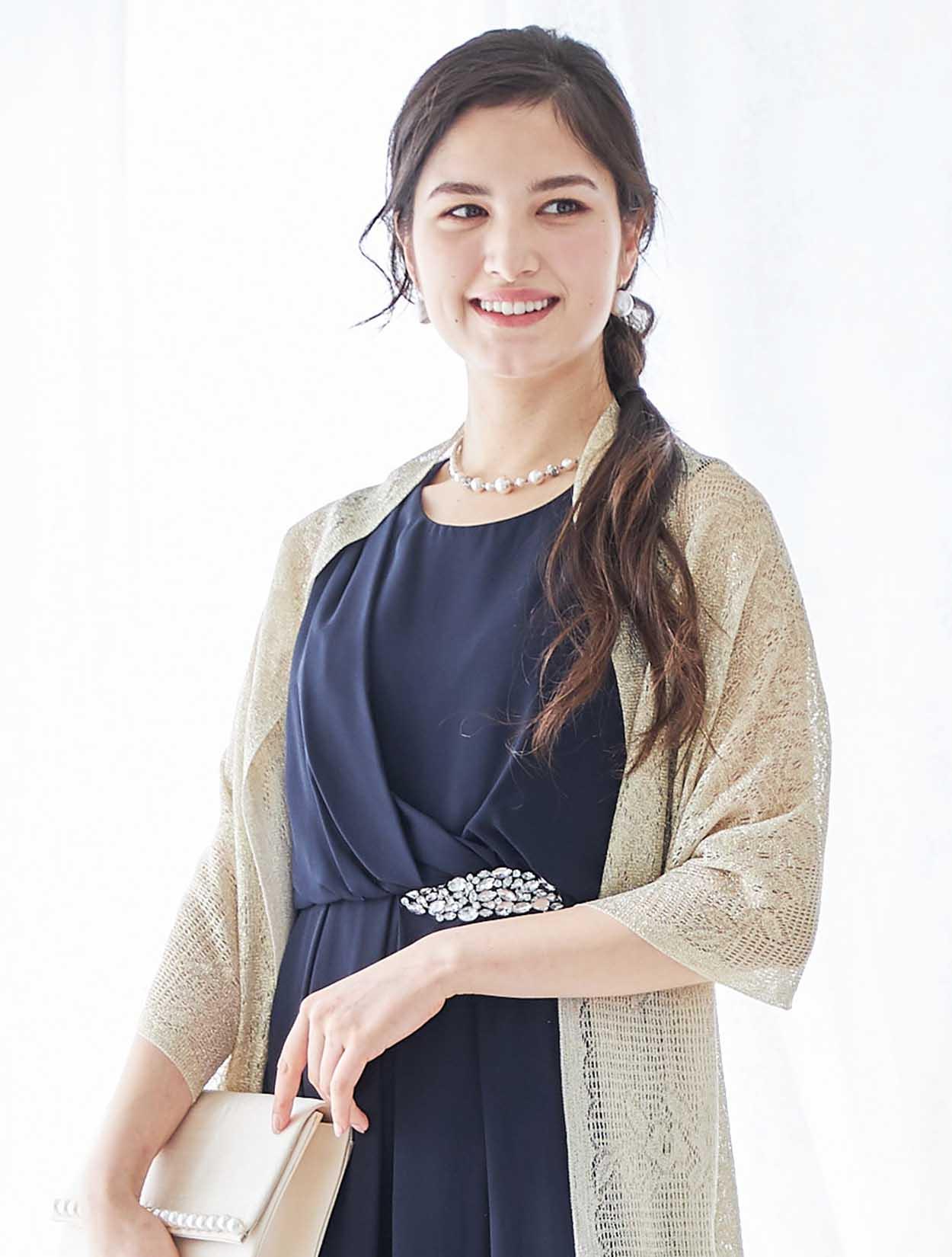 ゴールドのショールがアクセントになった華やかなパーティースタイルのコーディネート。