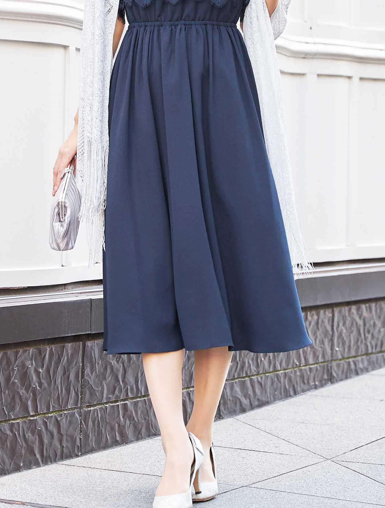ハイウエストでカットされたオーバーブラウスがスッキリ見せてくれるデザインのドレス。切り口はスカラップレースになっていて華やかさをアップ。レースには程よい厚みがあり透け過ぎず上品です。ふわっとした五分袖のフレアスリーブは、二の腕カバーにもなります。人気の袖ありドレスなので、結婚式でも一枚で安心して着られます。ハイウエストで切り替えられているので、スタイルアップ効果も◎。丈も長すぎないミモレ丈で、小柄な方でも着こなしやすい丈感です。