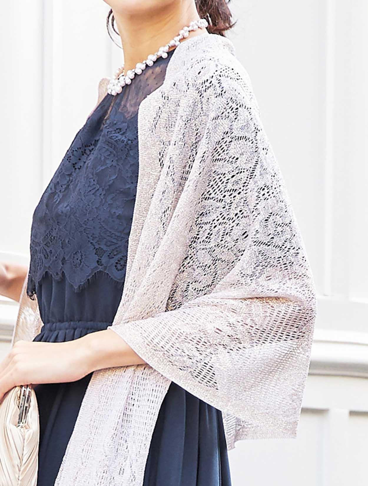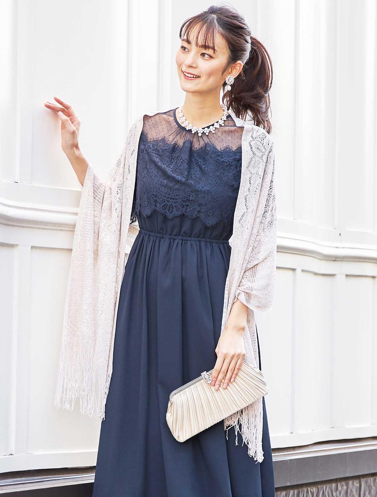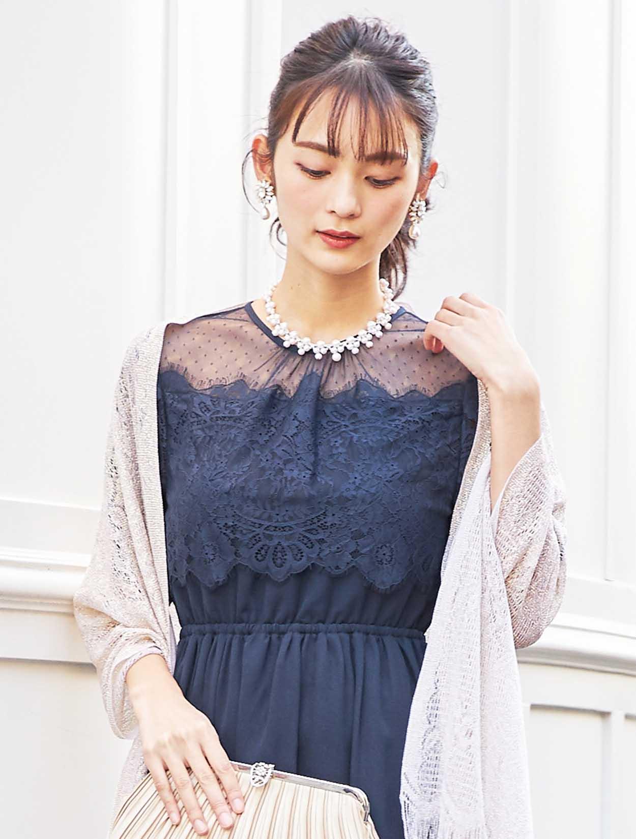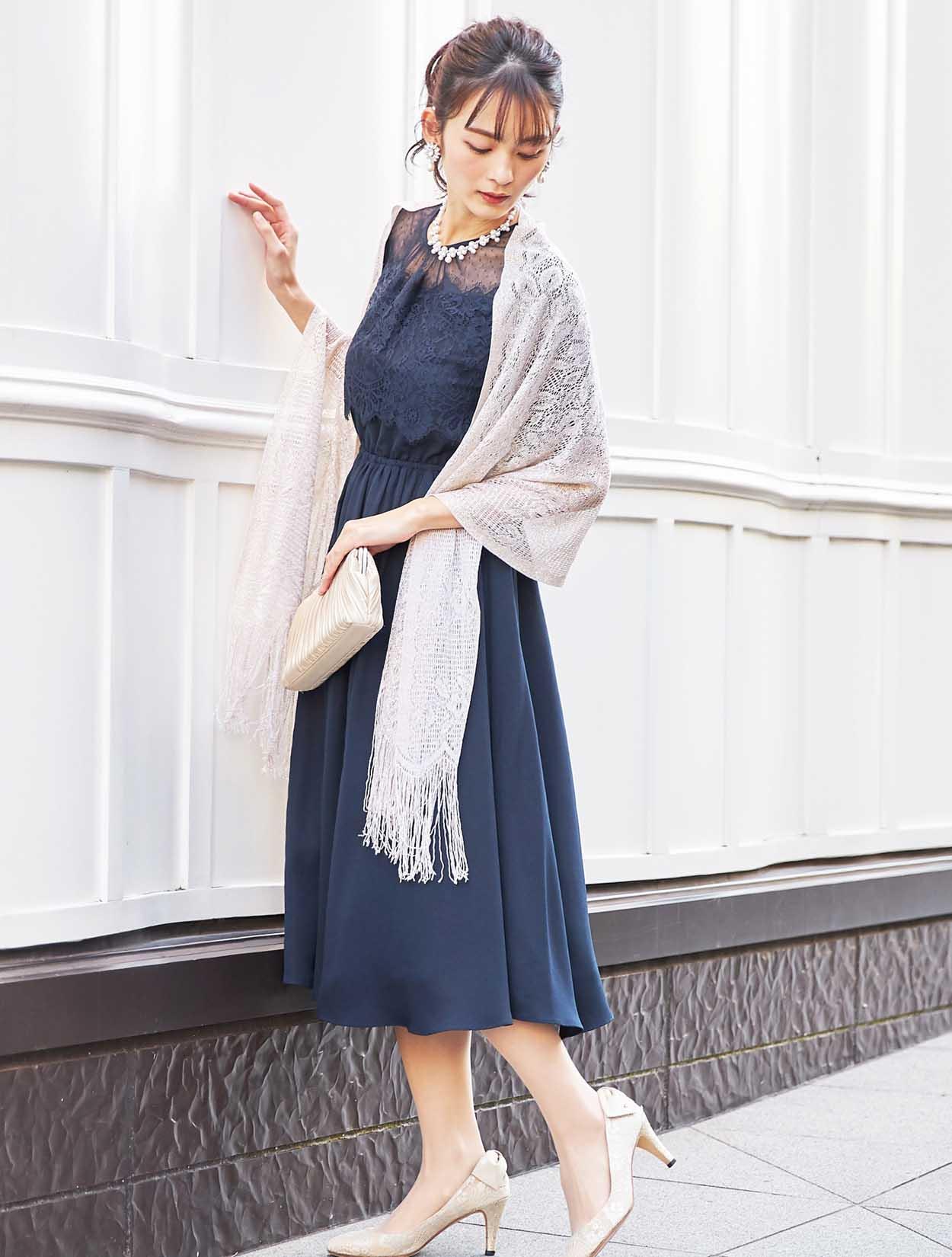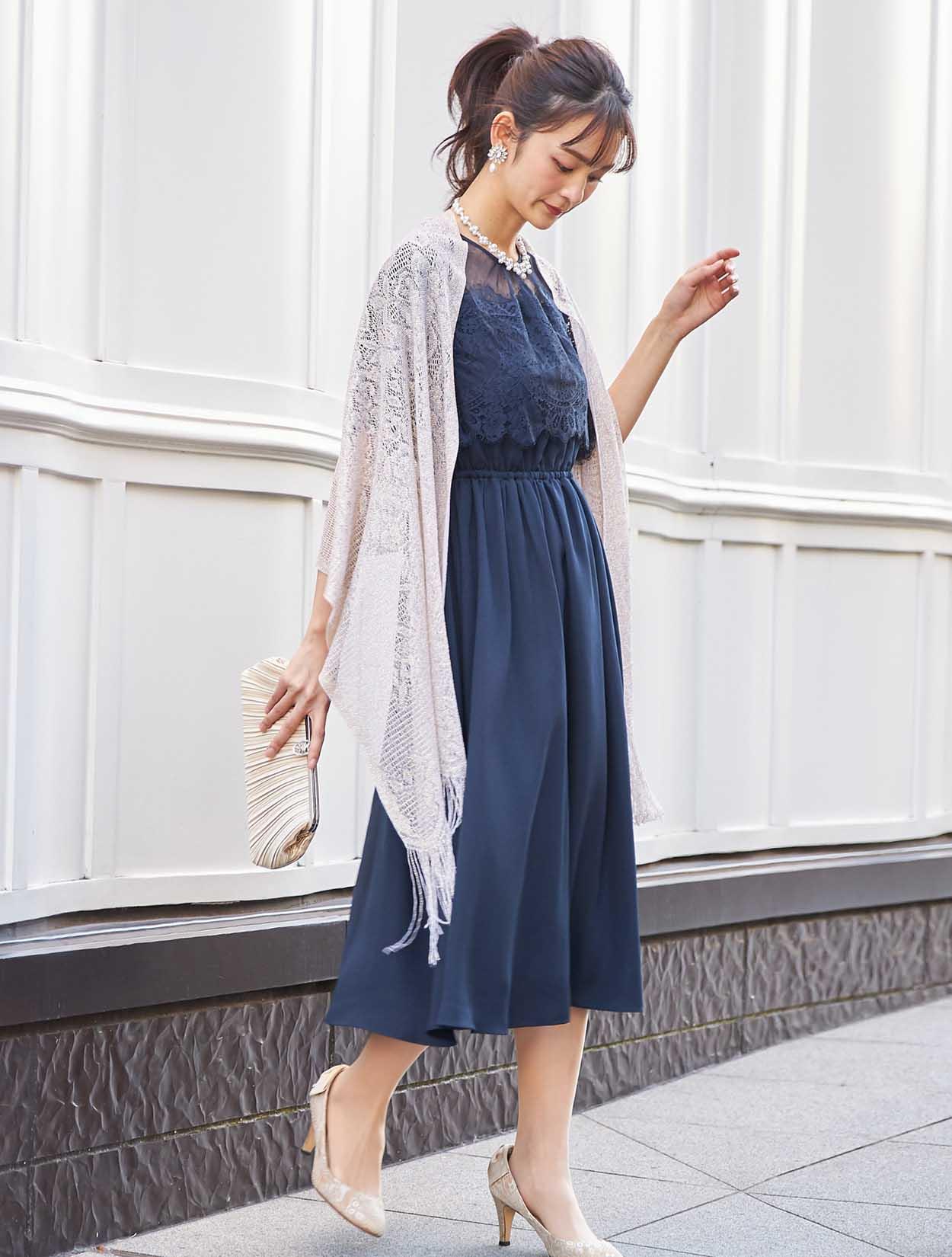 清楚なネイビーのドレスにゴールドのショールを合わせた華やかコーディネート。薄手の素材で程よく柄が透けるショールは上品な印象を与えてくれます。