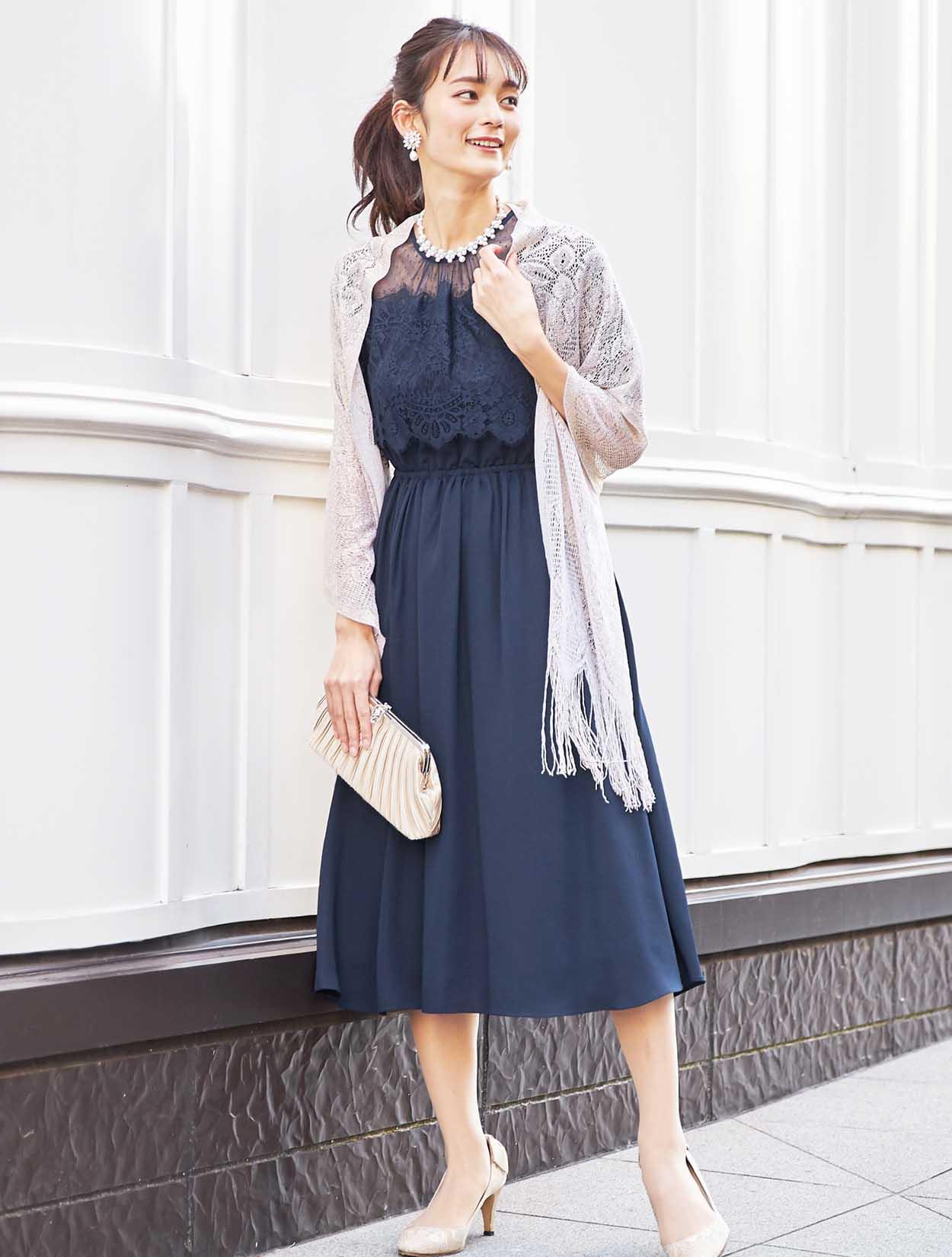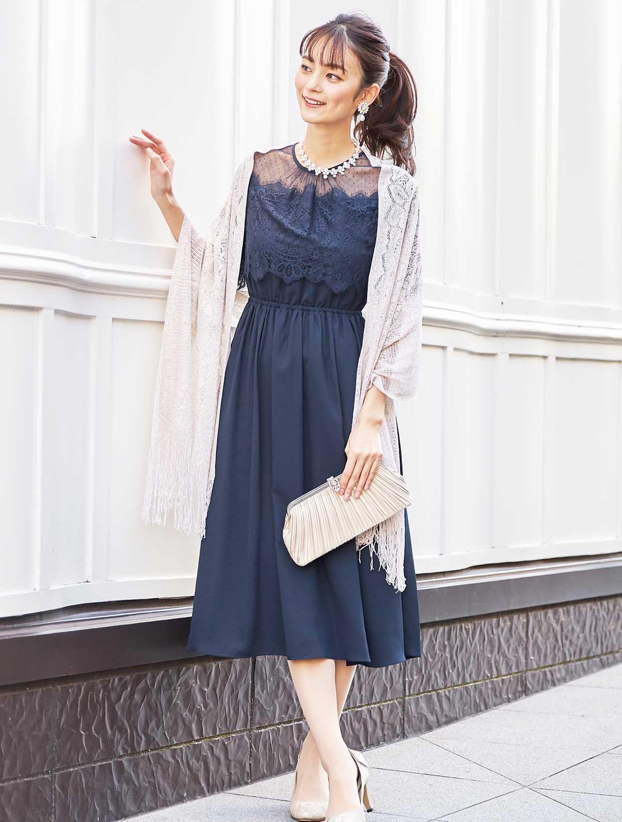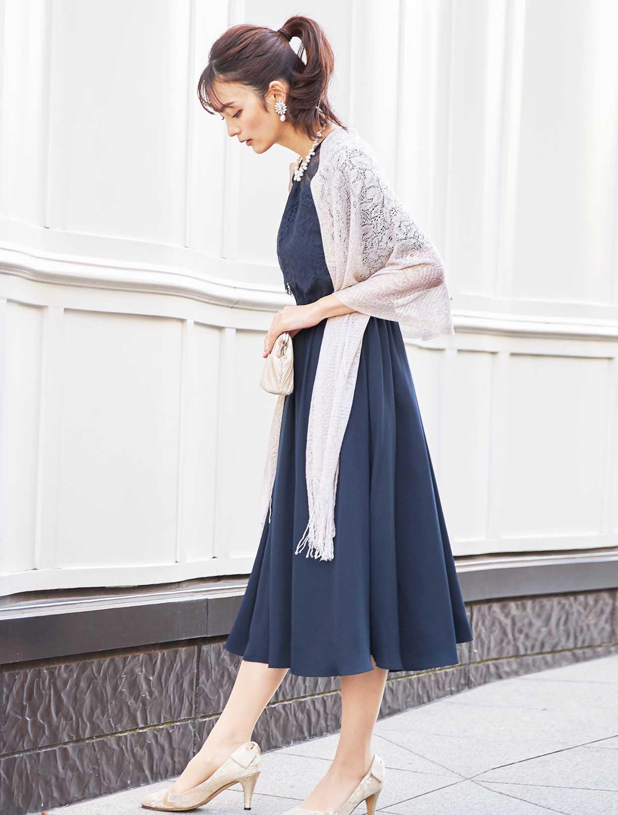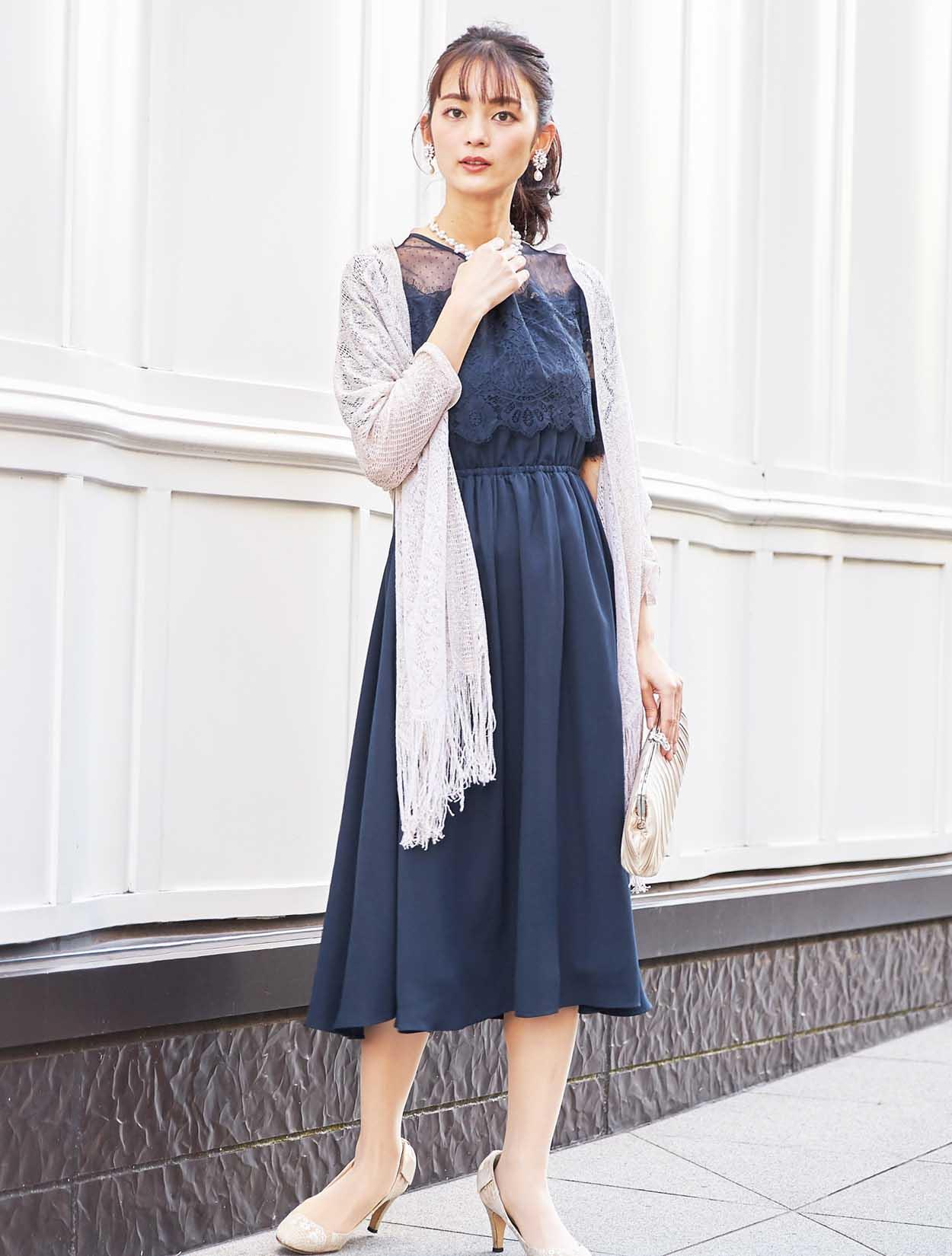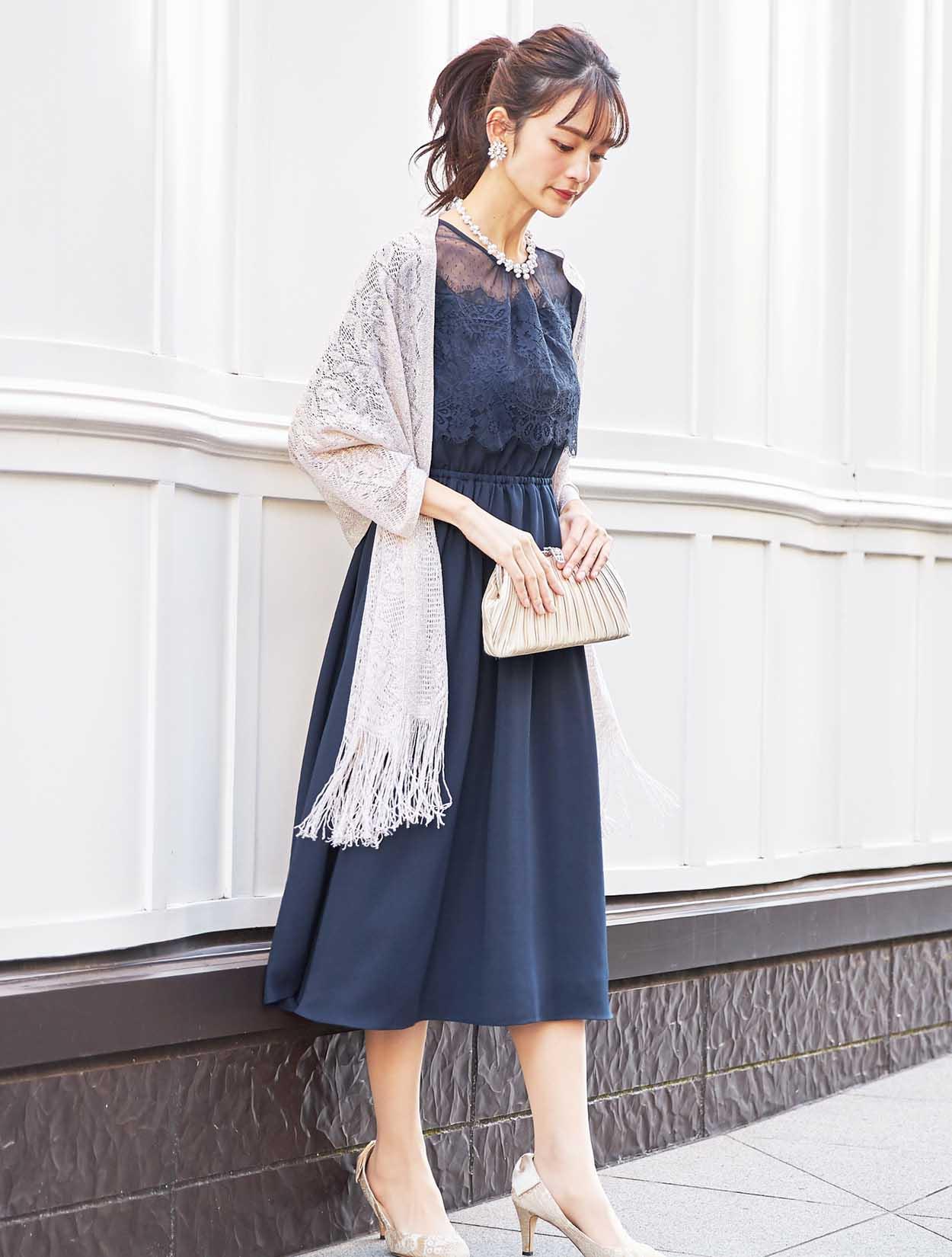 清楚なネイビーのドレスにゴールドのショールを合わせた華やかコーディネート。薄手の素材で程よく柄が透けるショールは上品な印象を与えてくれます。