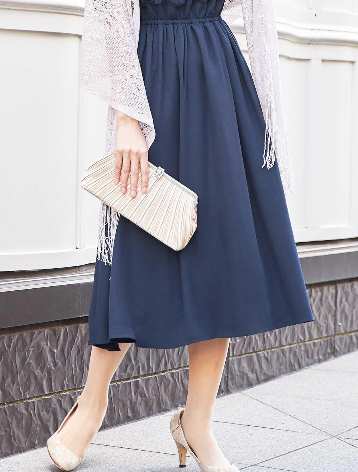 濃いめのダークネイビー。派手すぎず上品に着こなせる定番カラーです。全体を引き締めてくれるカラーでもあるネイビーのドレスは、着痩せして見えるカラーでもあり人気です。
