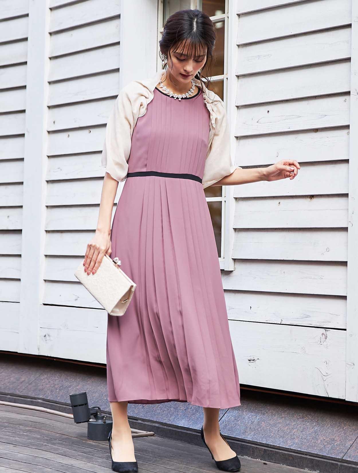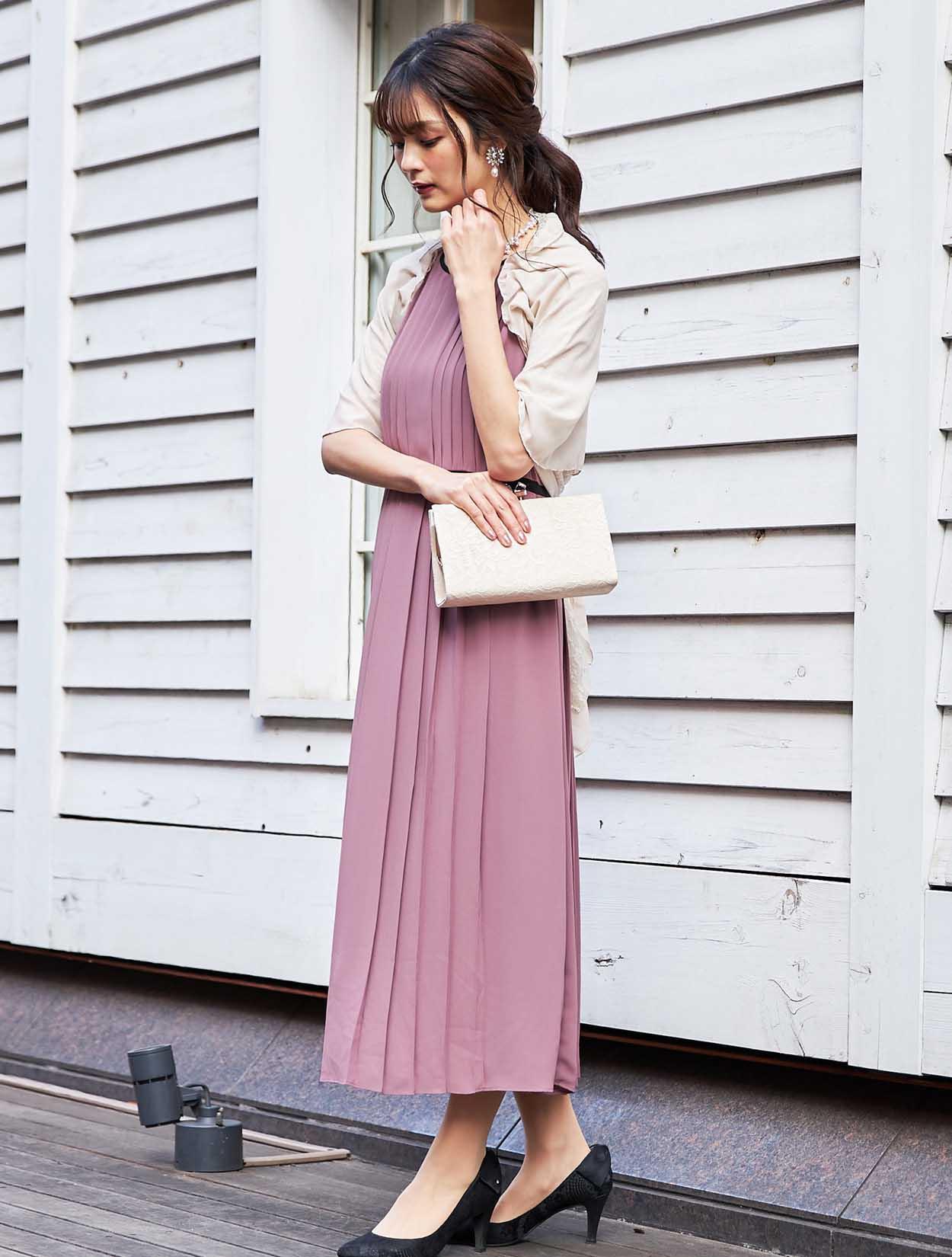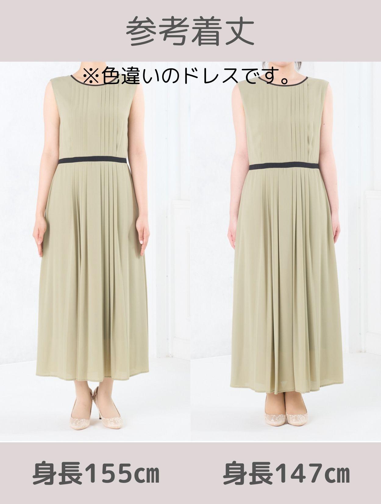 シンプルなデザインながら、縦にすっきり入ったプリーツがエレガントなドレス。襟元とウエストに入ったブラックのラインがメリハリを効かせています。締め付けのないストレスフリーなドレスですが、スタイル良く見えるのが嬉しいポイントです。首元は詰まり過ぎず開き過ぎないデザインで、上品で女性らしい着こなしができます。着丈は長過ぎないので、長身でなくても着用しやすいロングドレスです。また、背中ファスナーが上半身を程よくメイクアップしてくれるので、上半身が華奢な方でも着用しやすいドレスです。