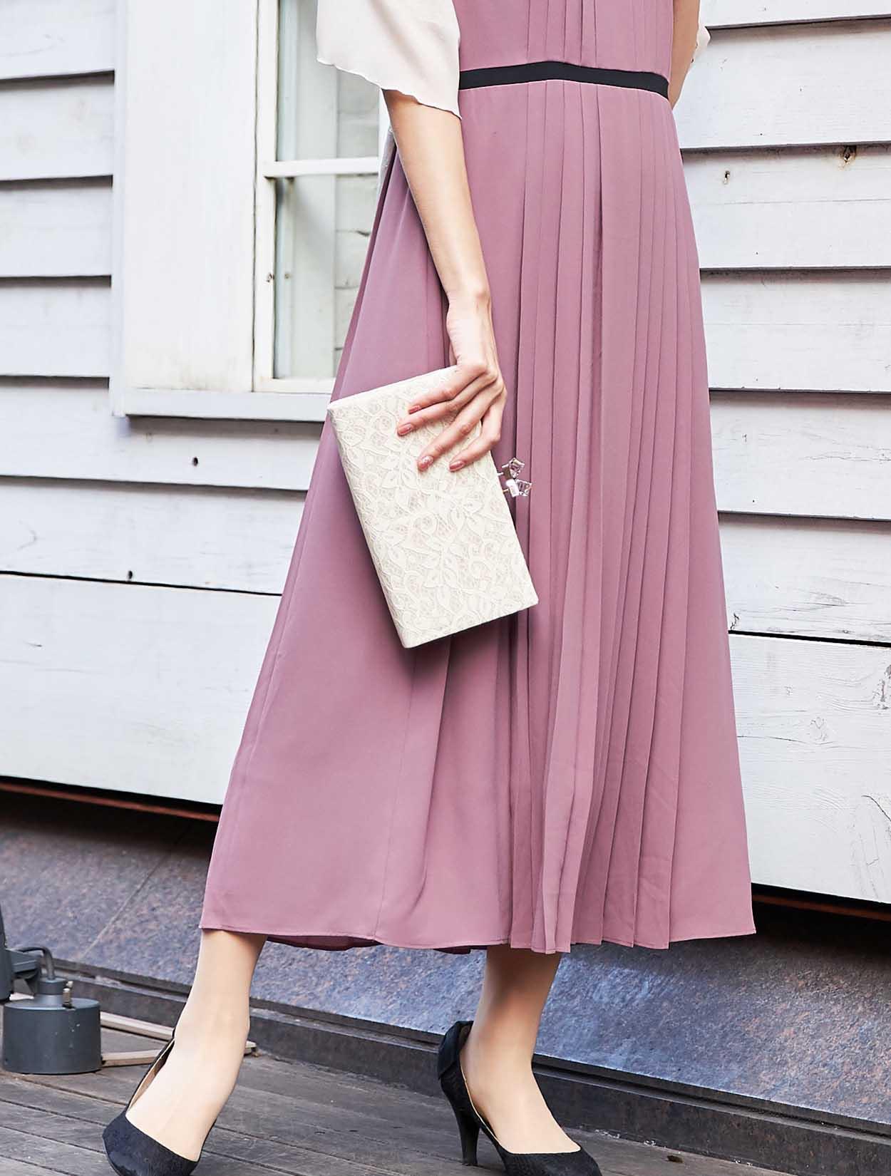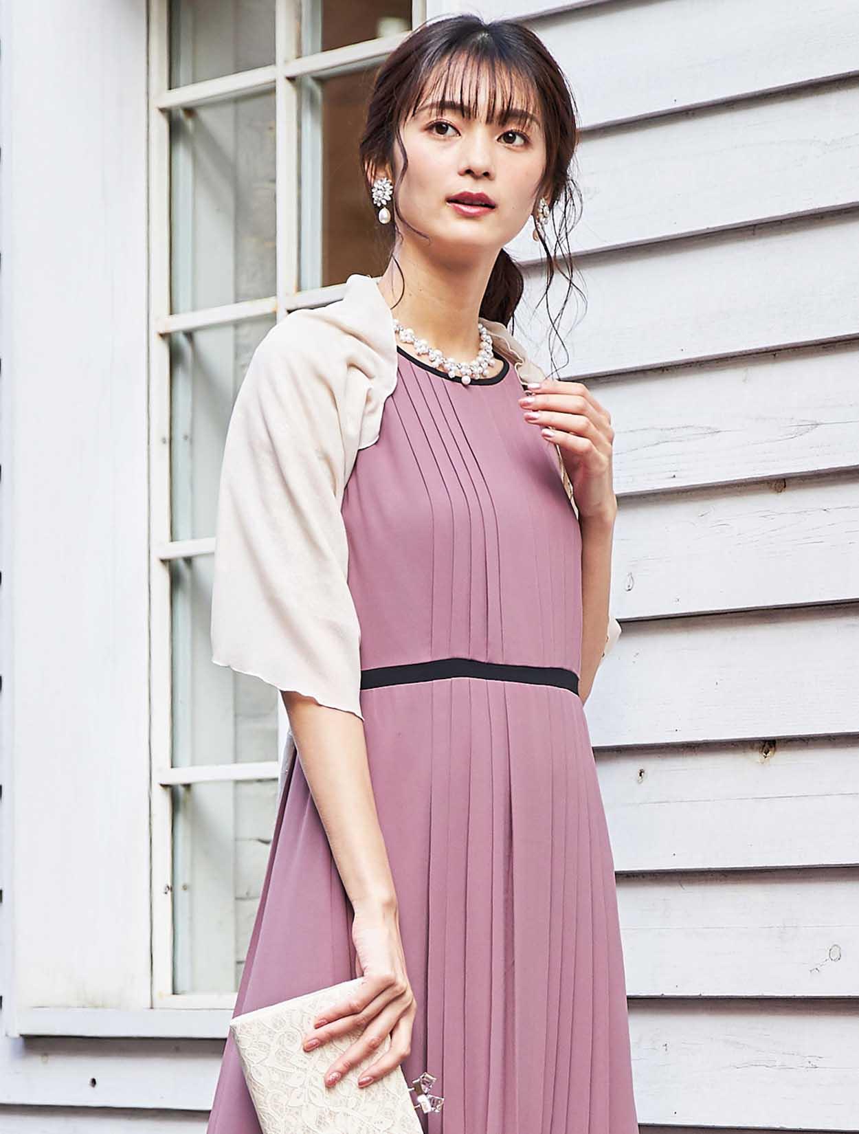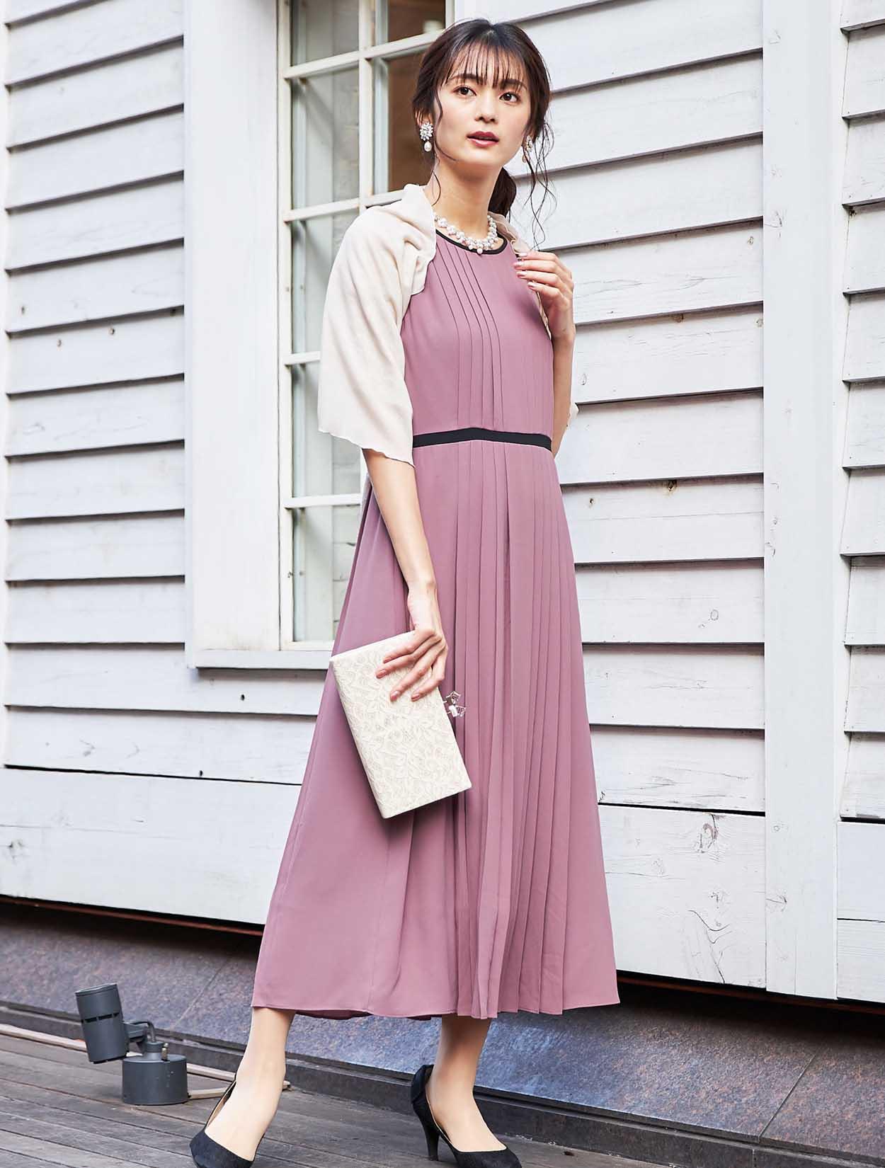 シンプルなデザインながら、縦にすっきり入ったプリーツがエレガントなドレス。襟元とウエストに入ったブラックのラインがメリハリを効かせています。締め付けのないストレスフリーなドレスですが、スタイル良く見えるのが嬉しいポイントです。首元は詰まり過ぎず開き過ぎないデザインで、上品で女性らしい着こなしができます。着丈は長過ぎないので、長身でなくても着用しやすいロングドレスです。また、背中ファスナーが上半身を程よくメイクアップしてくれるので、上半身が華奢な方でも着用しやすいドレスです。