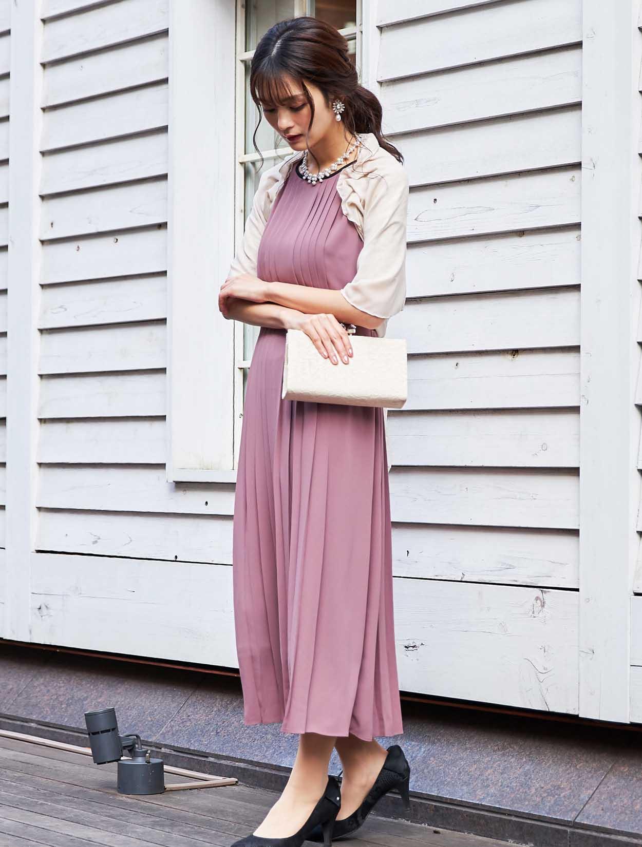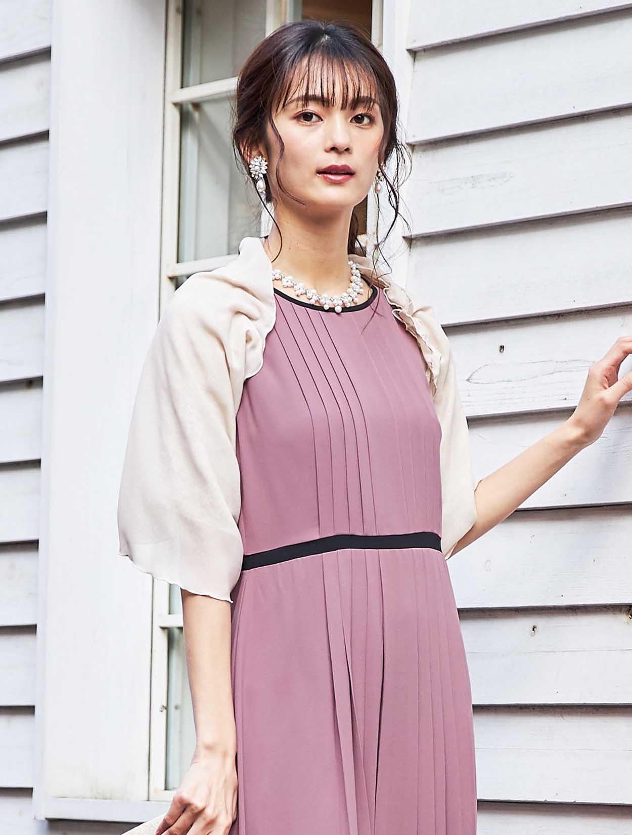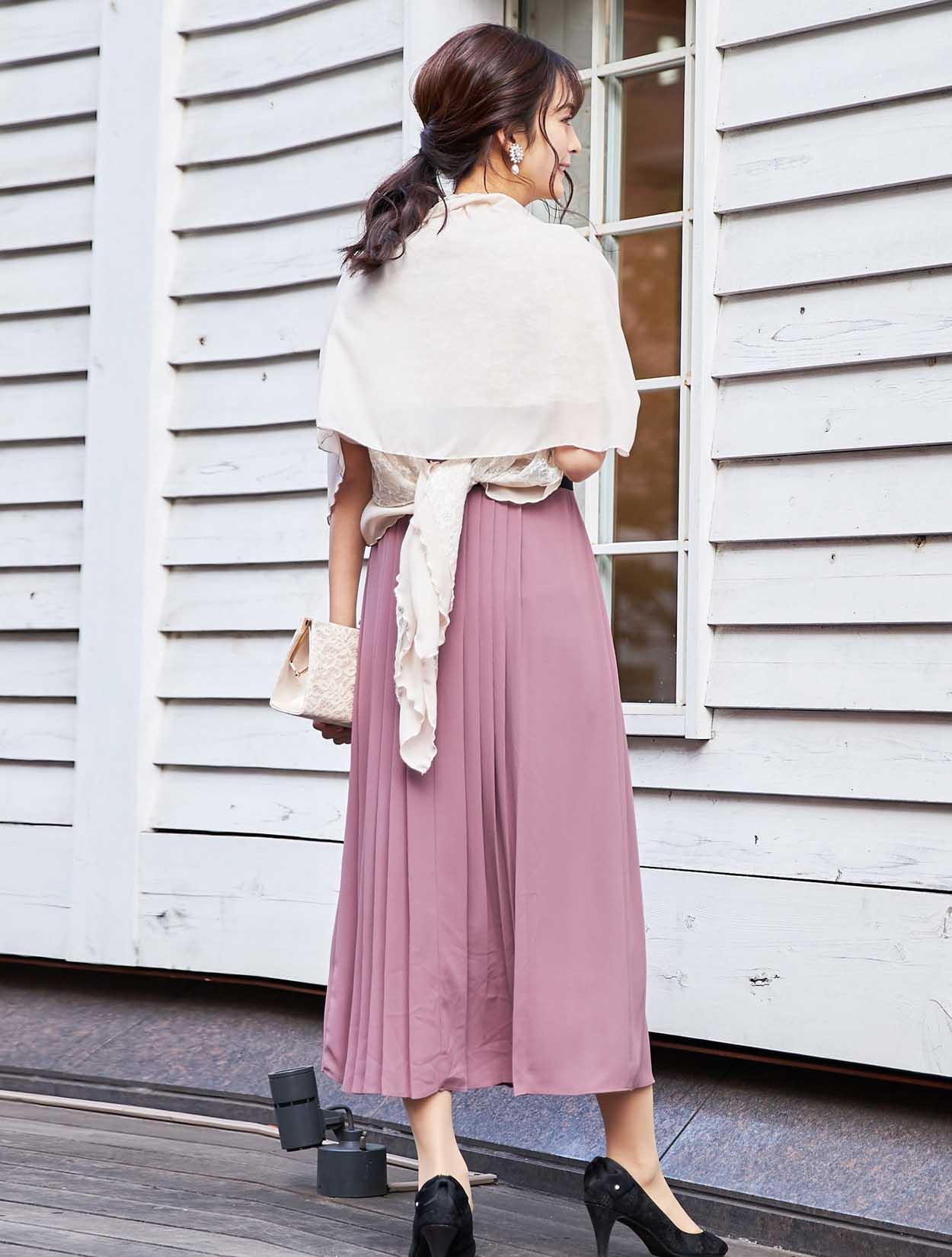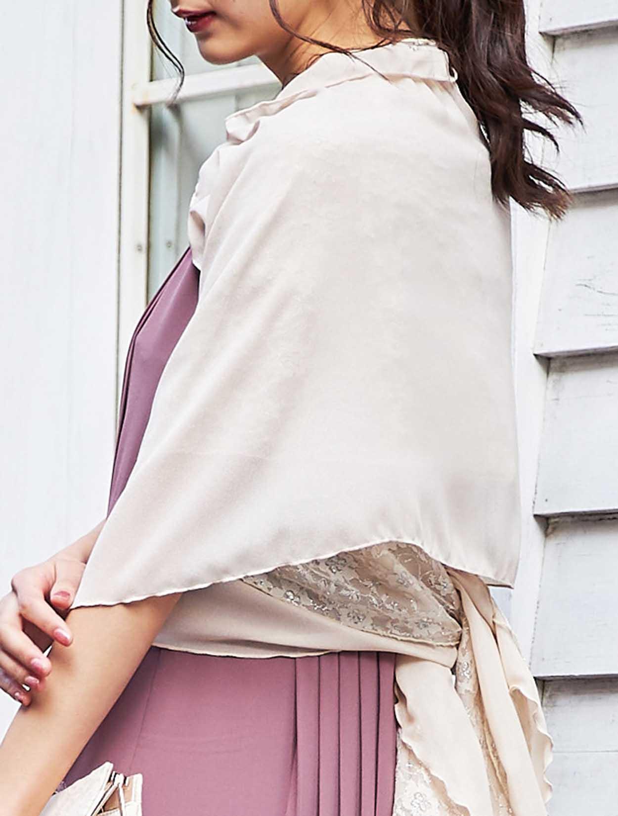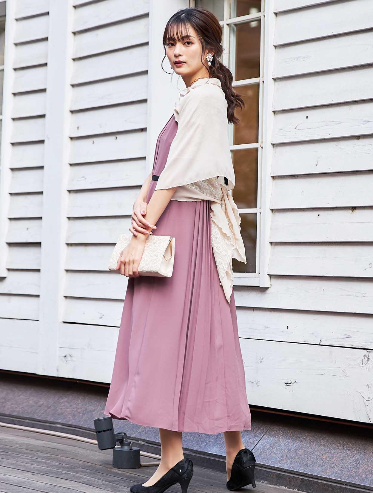 シフォンとラメレースを組み合わせたショールが落ち着いた華やかさのあるコーディネート。袖通し付きのショールなので、ずり落ちる心配のない優れもの◎ピンクとベージュのカラーでまとめた、女性らしいスタイルです。