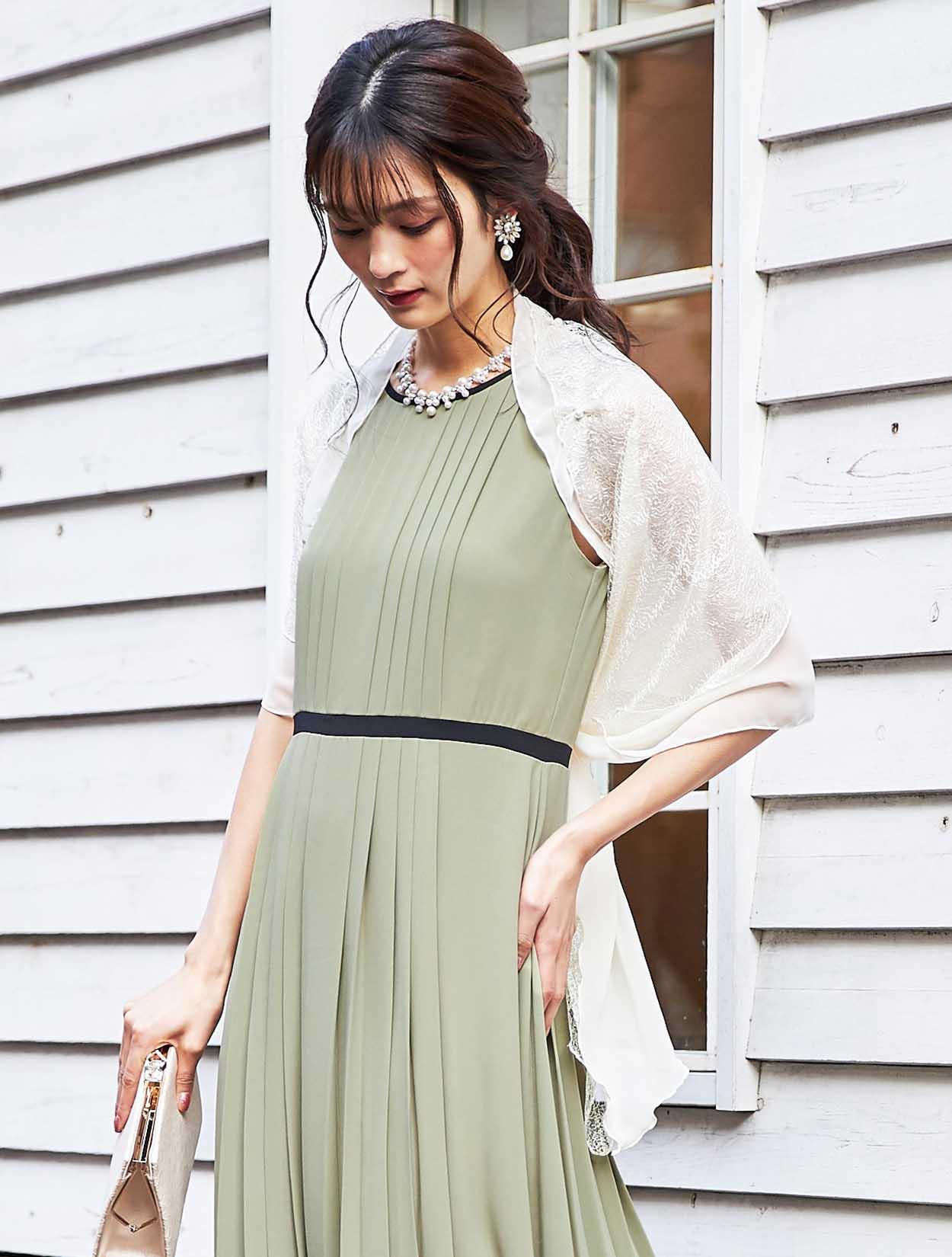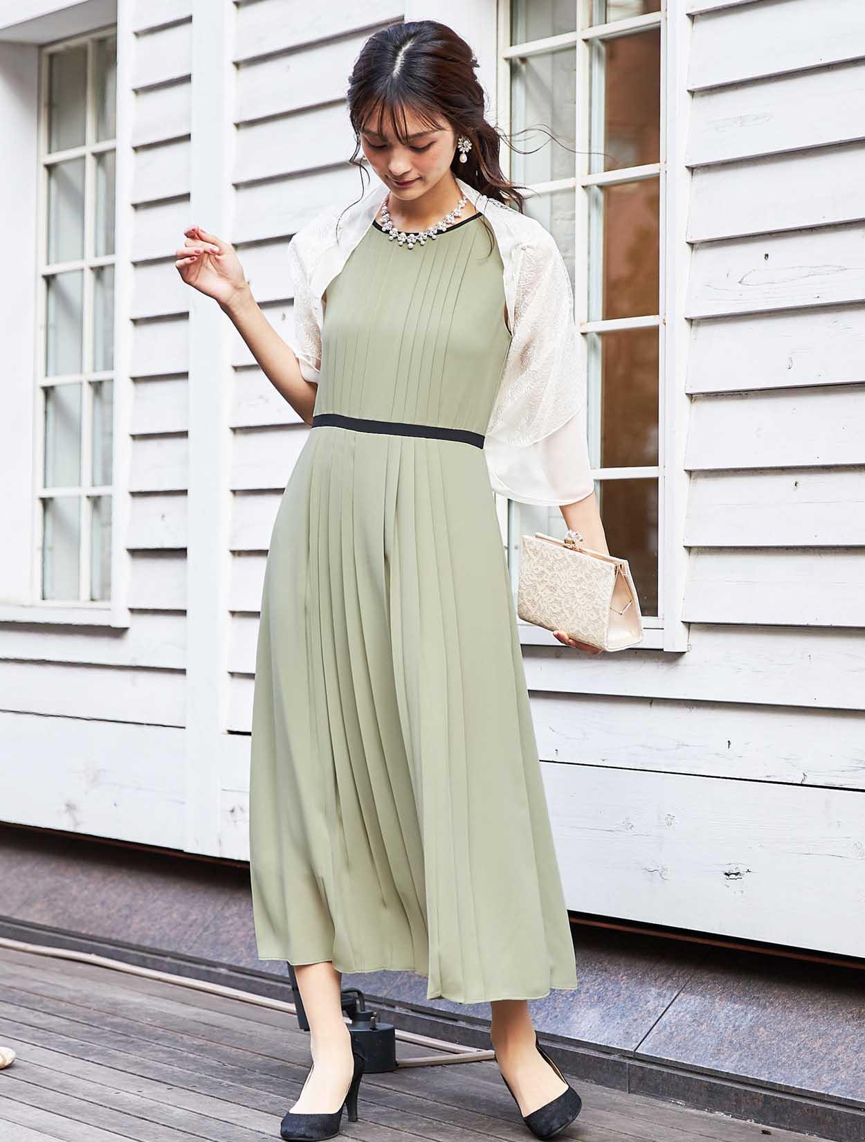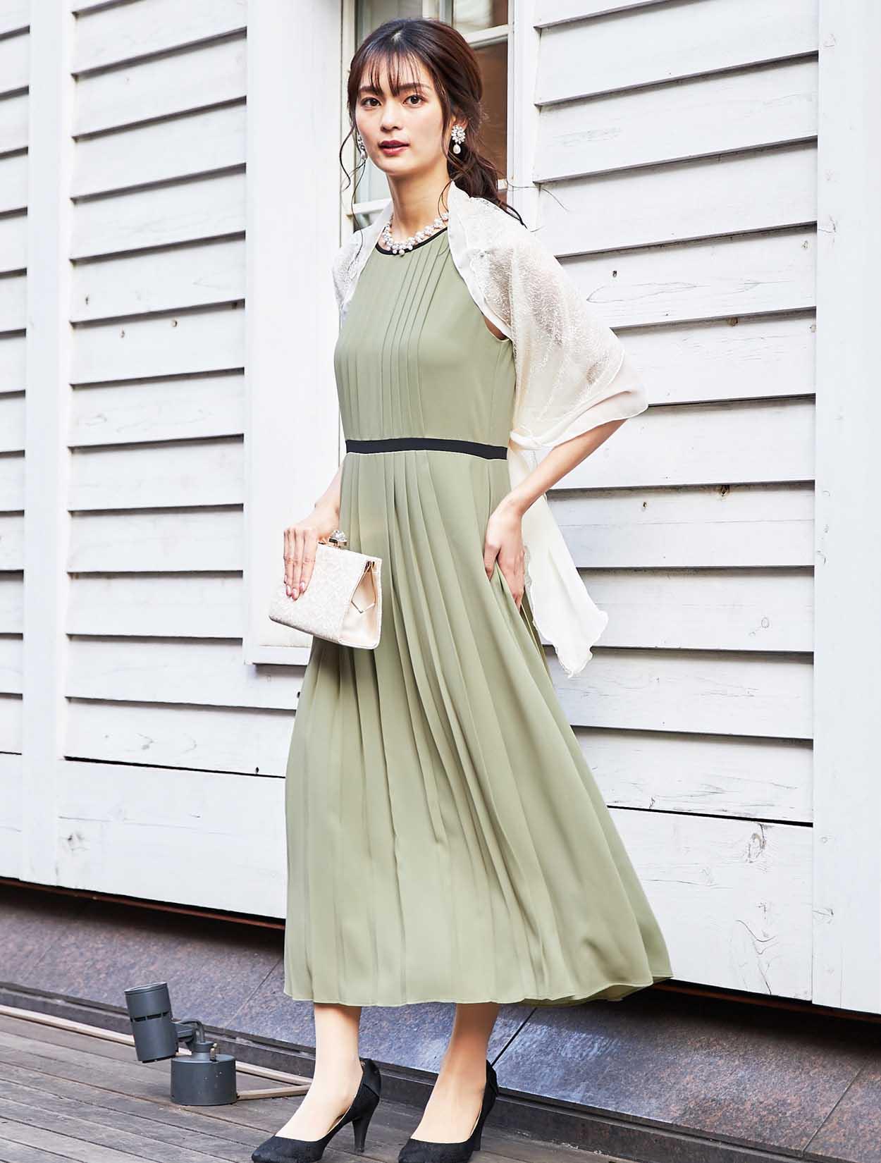 シンプルなデザインながら、縦にすっきり入ったプリーツがエレガントなドレス。襟元とウエストに入ったブラックのラインがメリハリを効かせています。締め付けのないストレスフリーなドレスですが、スタイル良く見えるのが嬉しいポイントです。首元は詰まり過ぎず開き過ぎないデザインで、上品で女性らしい着こなしができます。着丈は長過ぎないので、長身でなくても着用しやすいロングドレスです。また、背中ファスナーが上半身を程よくメイクアップしてくれるので、上半身が華奢な方でも着用しやすいドレスです。