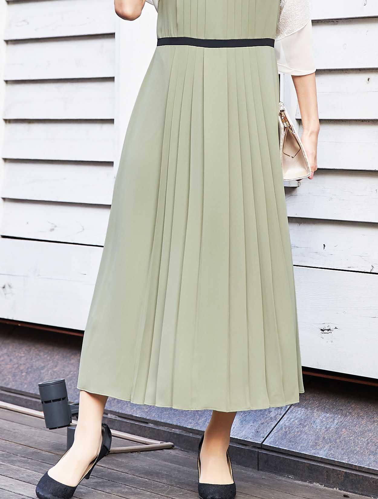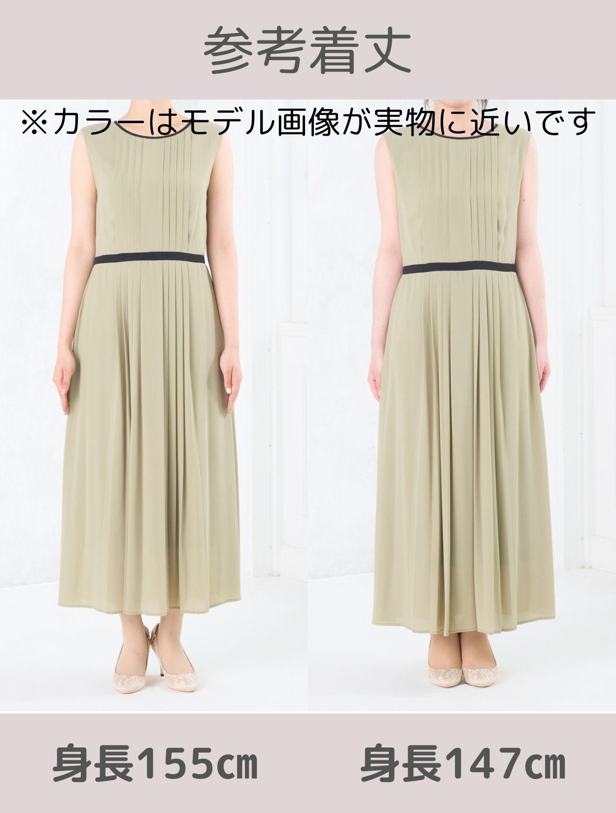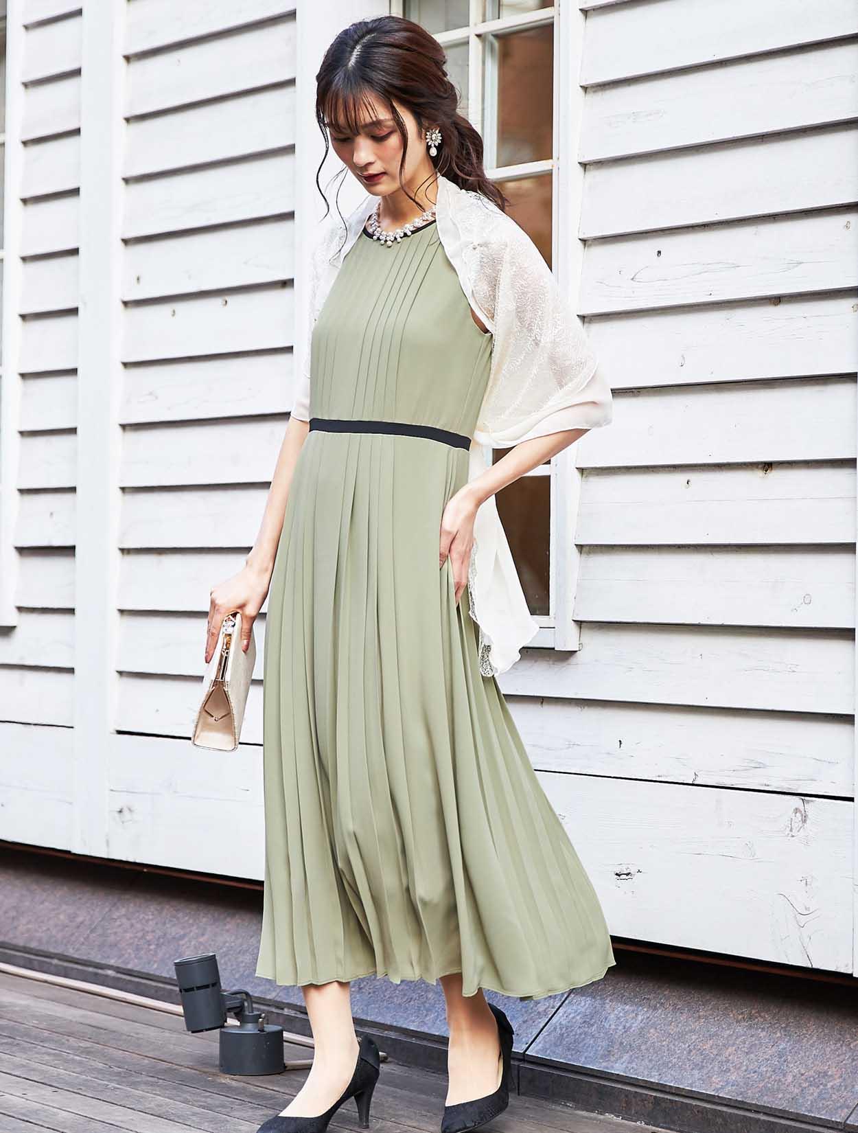 シンプルなデザインながら、縦にすっきり入ったプリーツがエレガントなドレス。襟元とウエストに入ったブラックのラインがメリハリを効かせています。締め付けのないストレスフリーなドレスですが、スタイル良く見えるのが嬉しいポイントです。首元は詰まり過ぎず開き過ぎないデザインで、上品で女性らしい着こなしができます。着丈は長過ぎないので、長身でなくても着用しやすいロングドレスです。また、背中ファスナーが上半身を程よくメイクアップしてくれるので、上半身が華奢な方でも着用しやすいドレスです。