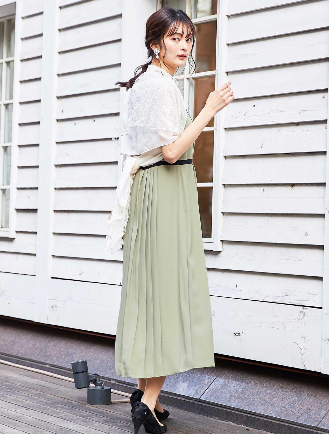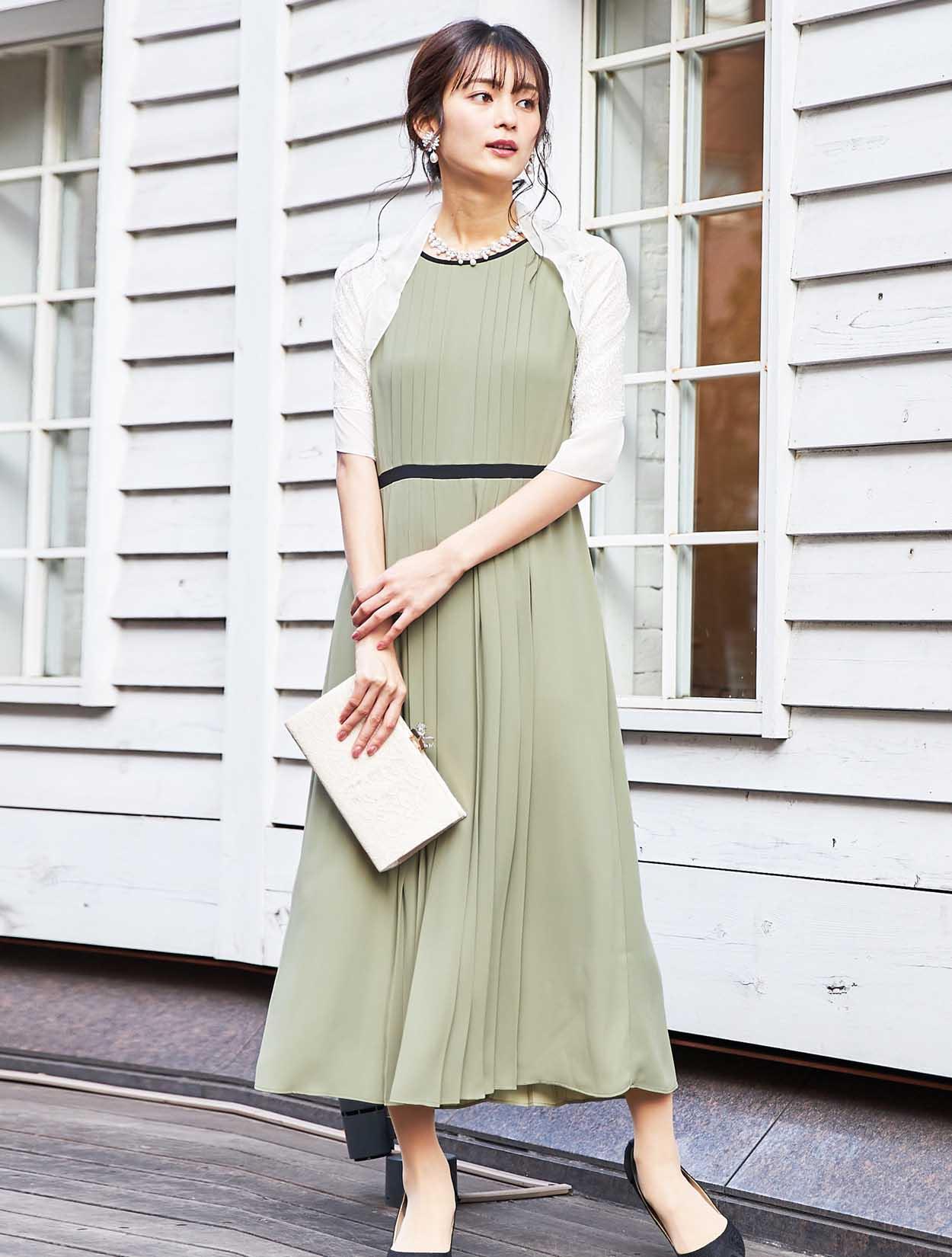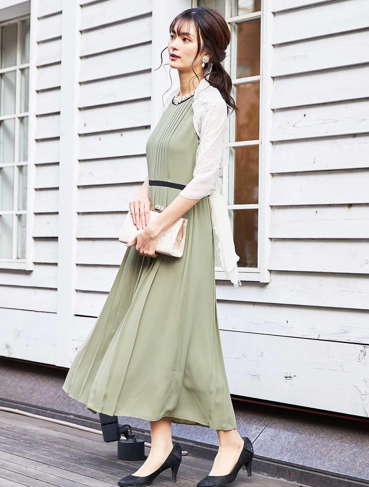 ラメレースの華やかさがドレスの上品さを引き立てるコーディネート。優しいグリーンのドレスとベージュカラーの組み合わせは、柔らかいフェミニンスタイルを叶えてくれます。