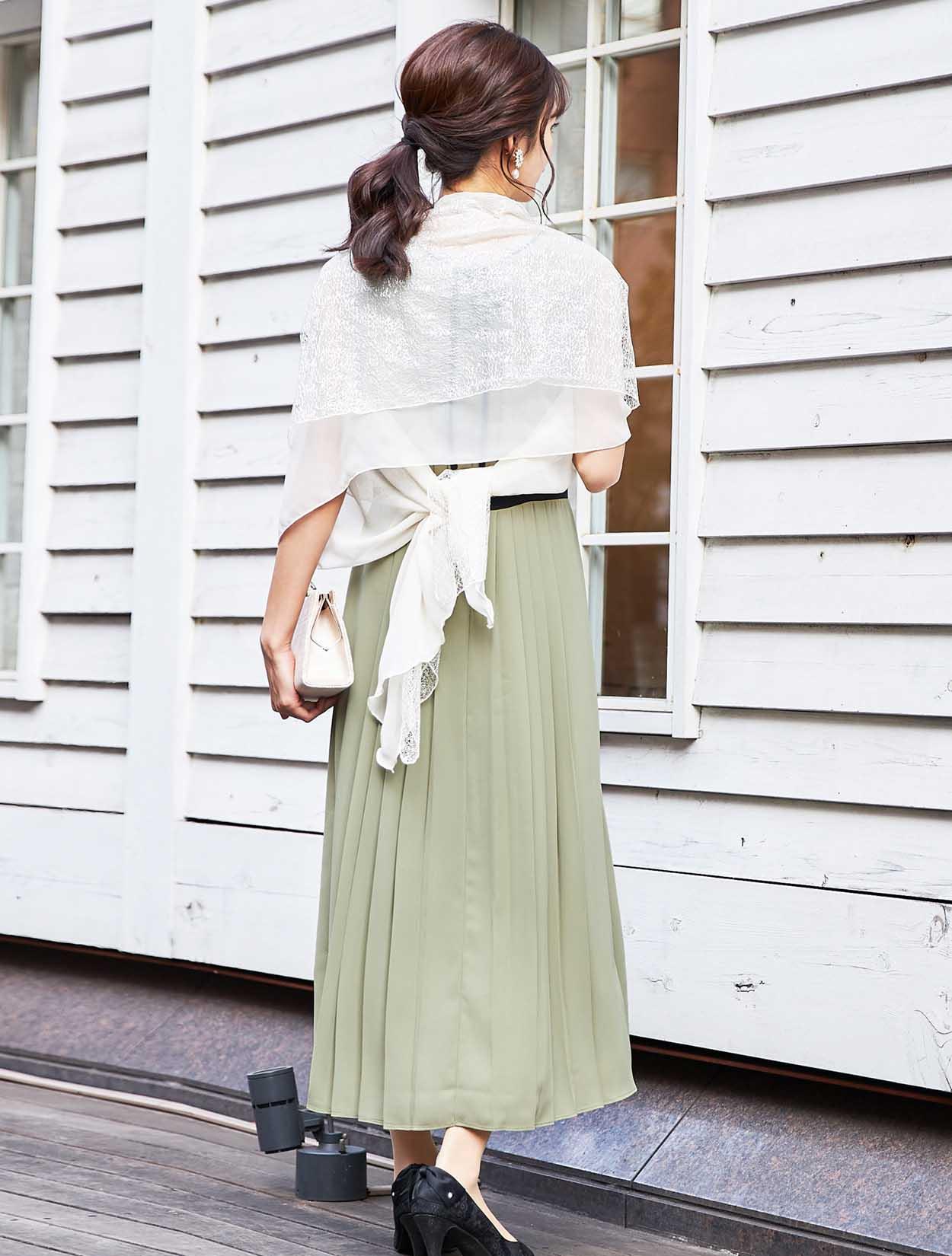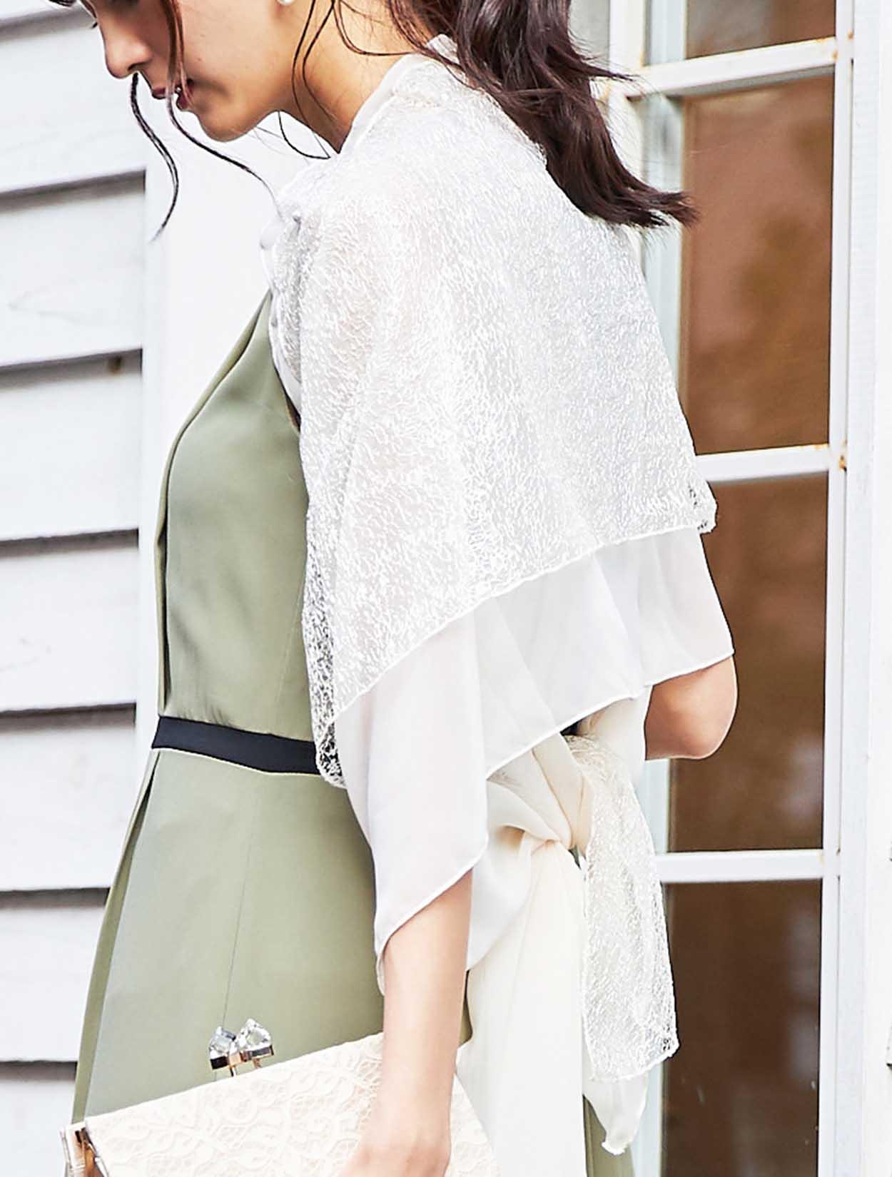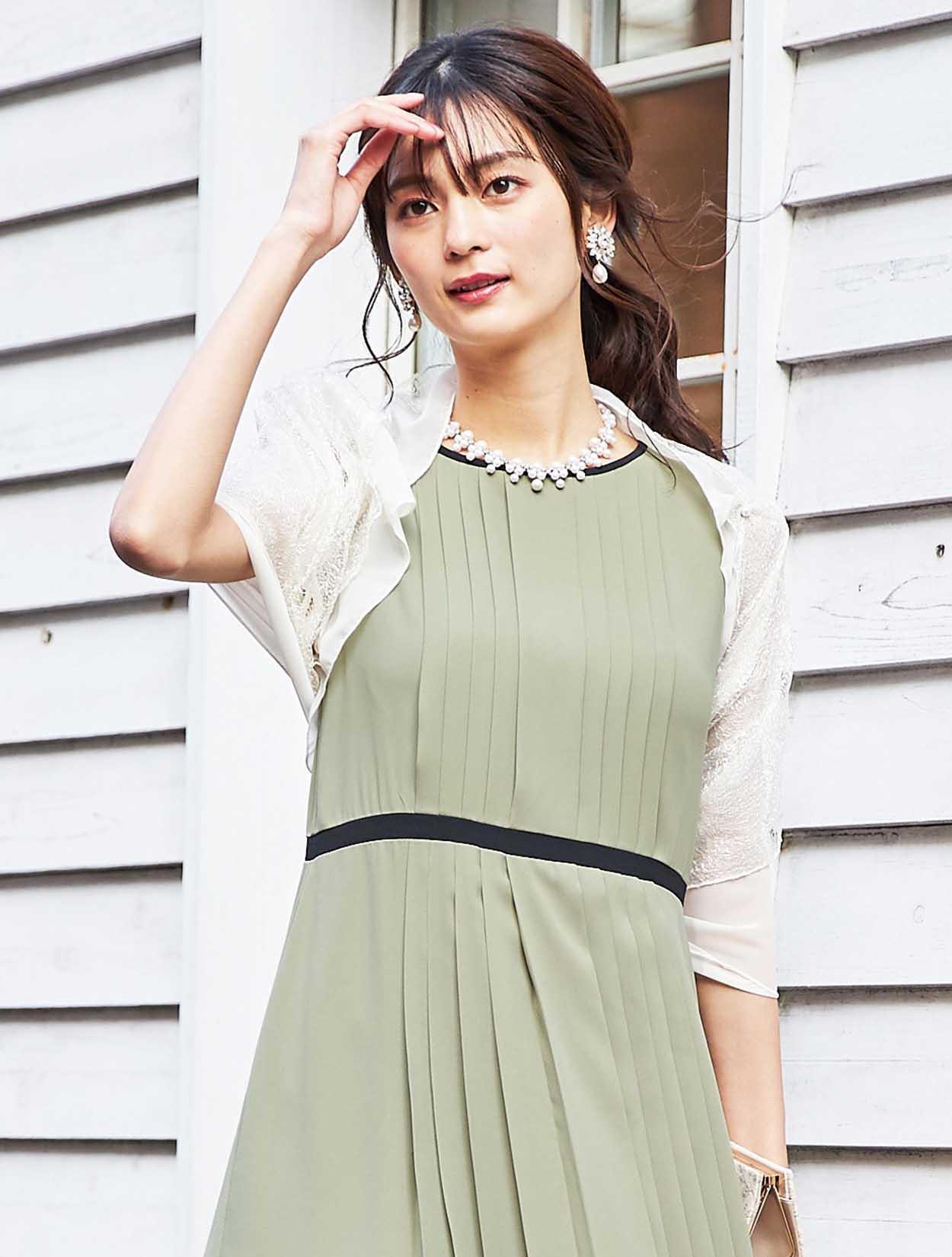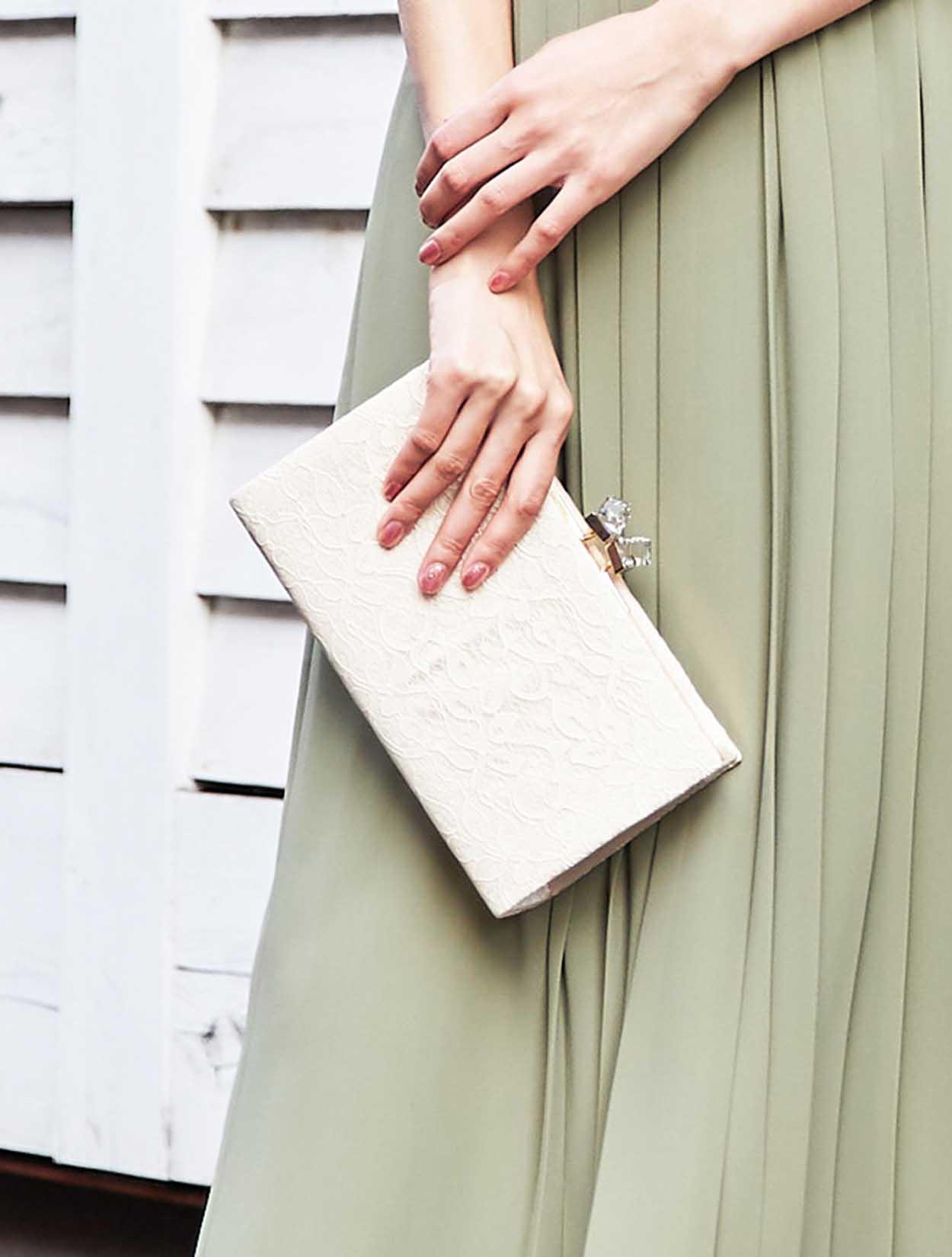 ラメレースの華やかさがドレスの上品さを引き立てるコーディネート。優しいグリーンのドレスとベージュカラーの組み合わせは、柔らかいフェミニンスタイルを叶えてくれます。