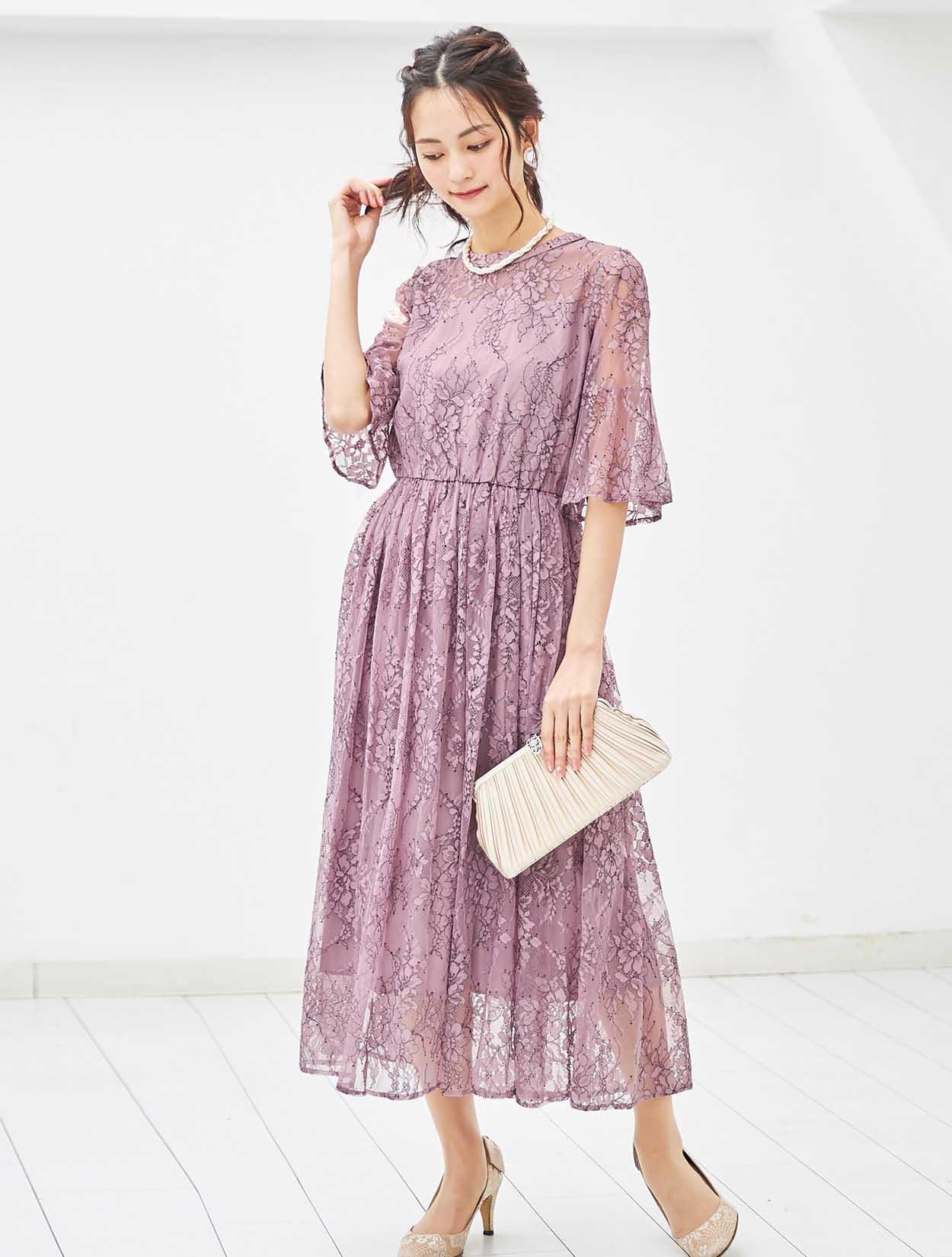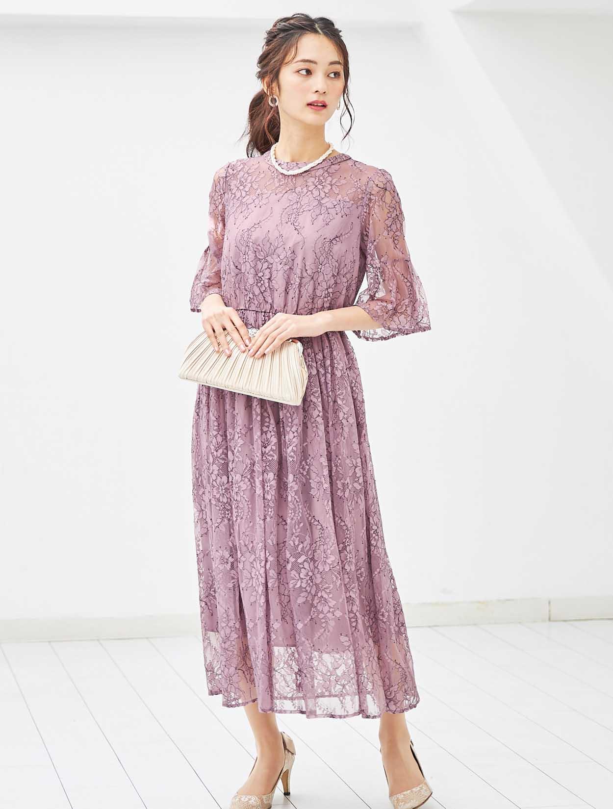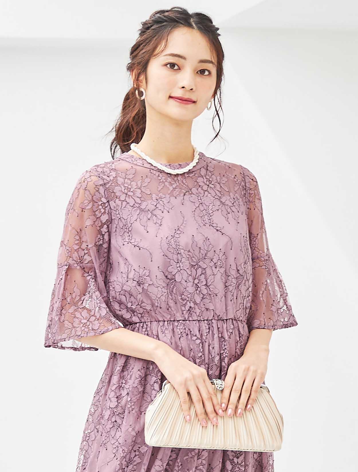 トレンドのレースドレス。立体感のあるレースのフラワー柄がお顔写りをグッと華やかにしてくれます。クルーネックのデザインは、ドレスでも頑張り過ぎない今っぽい着こなしが出来ます。お袖は、二の腕の真ん中ほどから広がるデザインなので、程よく二の腕をカバーしてくれます。トレンドの袖ありドレスは、結婚式でも安心して一枚で着られます。肘下くらいの長さなので、もたつかずお食事などもしやすいです。また、ウエストゴムなので長時間の利用でも楽に着られます。ロングドレスですがスカートの裾がレースで透けているので、足元は軽い印象で長身でなくても着こなしやすいドレスです。