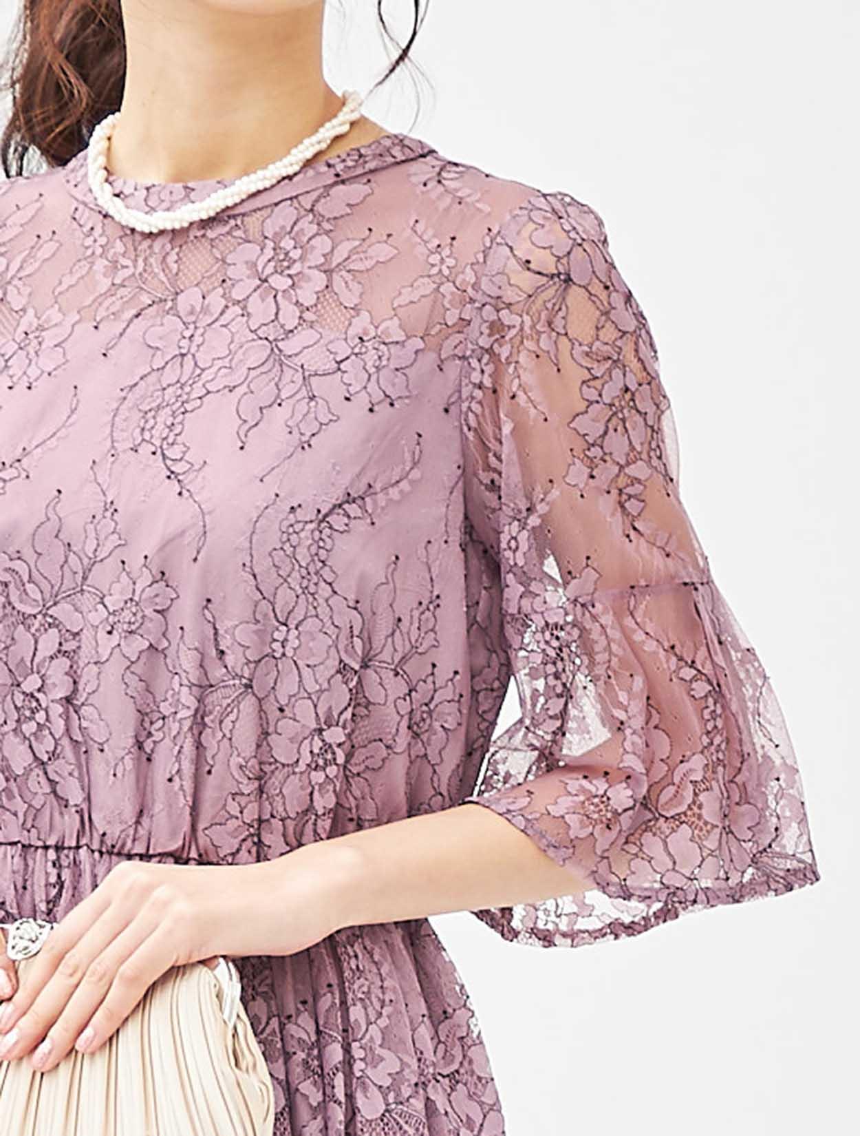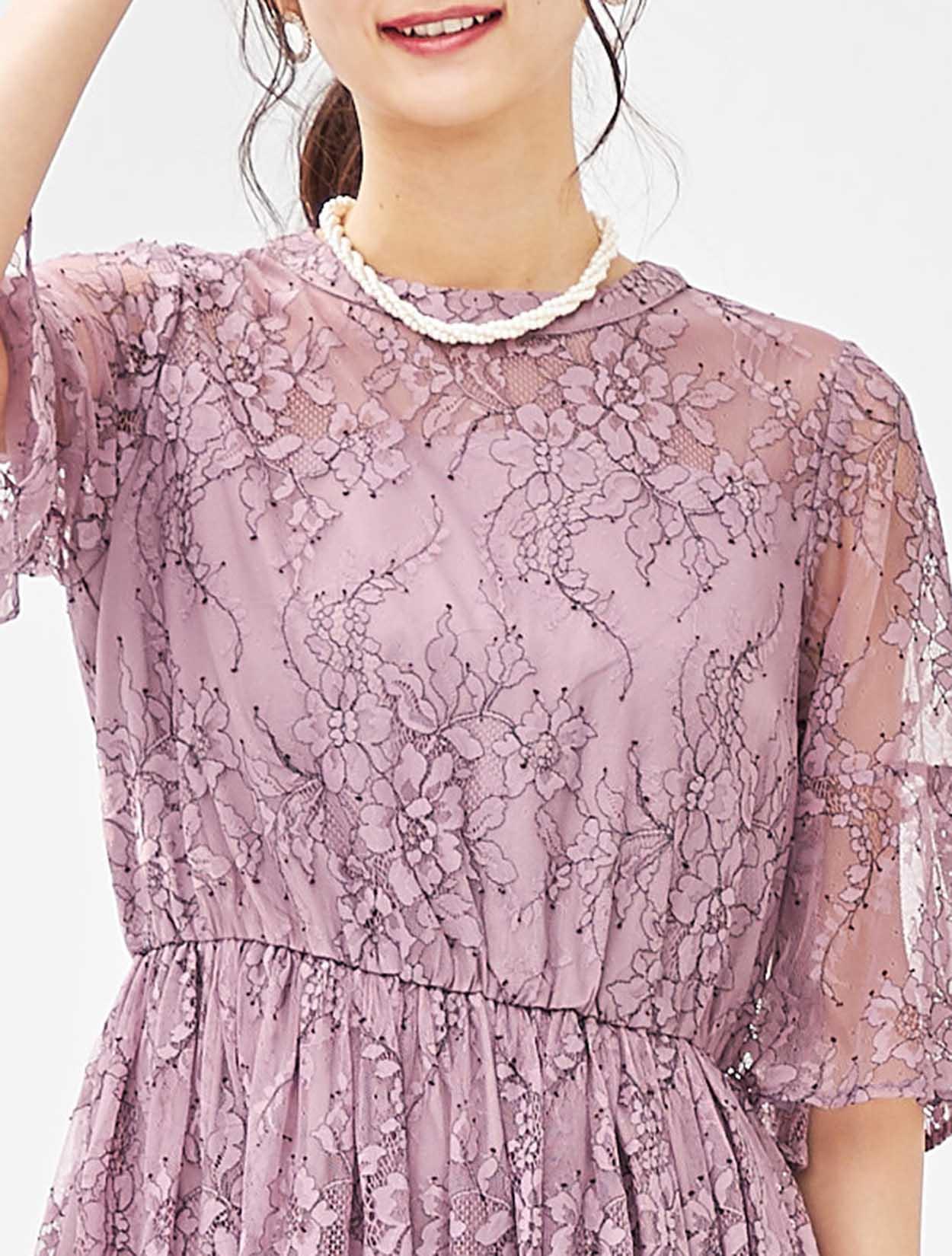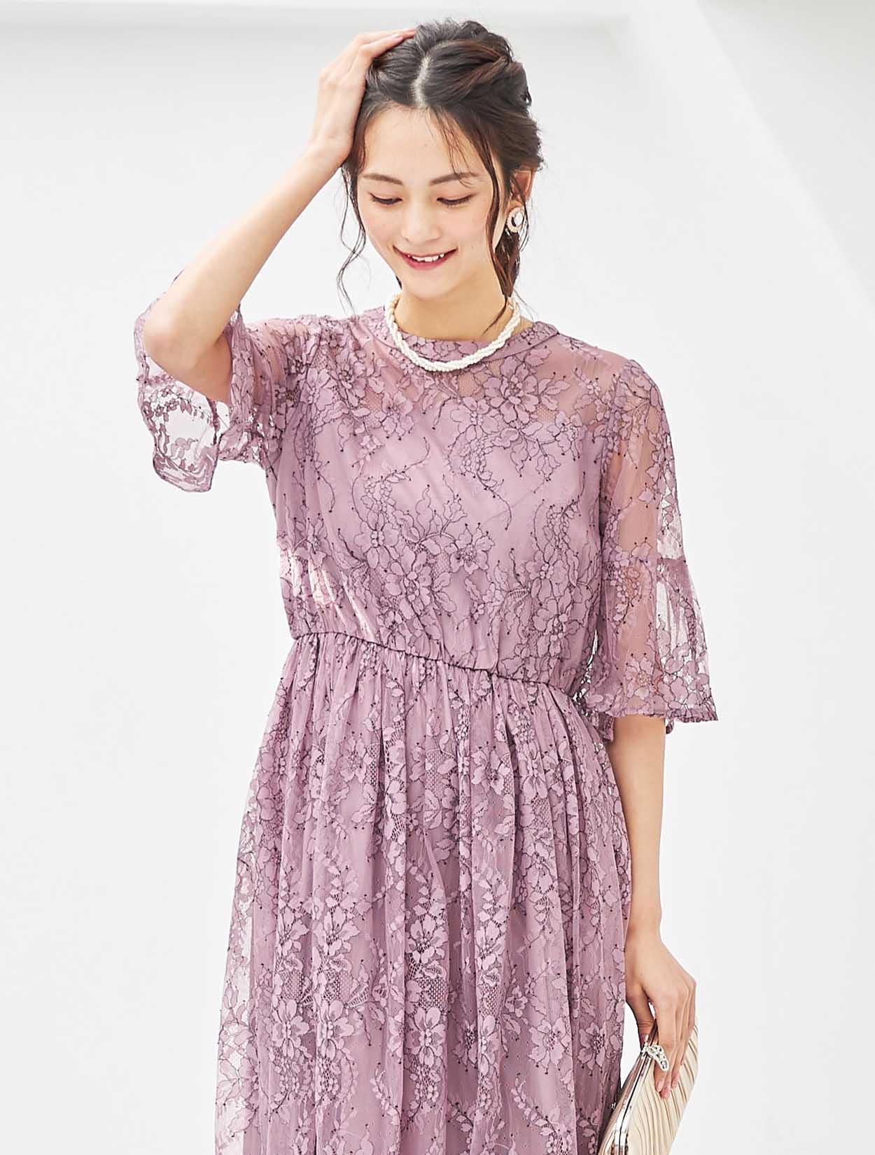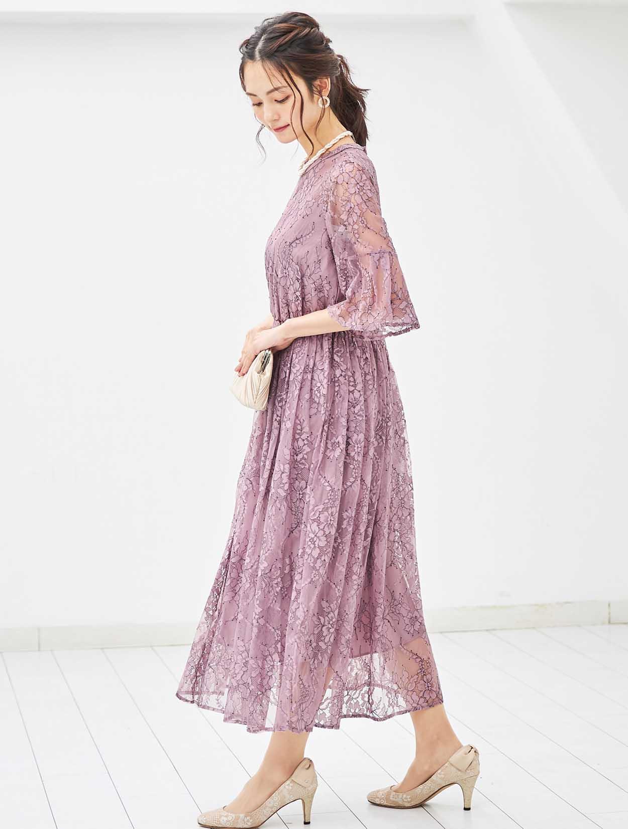 トレンドのレースドレス。立体感のあるレースのフラワー柄がお顔写りをグッと華やかにしてくれます。クルーネックのデザインは、ドレスでも頑張り過ぎない今っぽい着こなしが出来ます。お袖は、二の腕の真ん中ほどから広がるデザインなので、程よく二の腕をカバーしてくれます。トレンドの袖ありドレスは、結婚式でも安心して一枚で着られます。肘下くらいの長さなので、もたつかずお食事などもしやすいです。また、ウエストゴムなので長時間の利用でも楽に着られます。ロングドレスですがスカートの裾がレースで透けているので、足元は軽い印象で長身でなくても着こなしやすいドレスです。