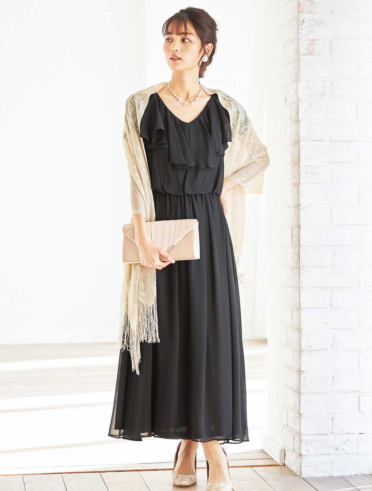 デコルテ全体を包み込むようなラッフルデザインがフェイスラインを華やかに。浅めのVネックがエレガントな大人の女性にぴったりのドレスです。