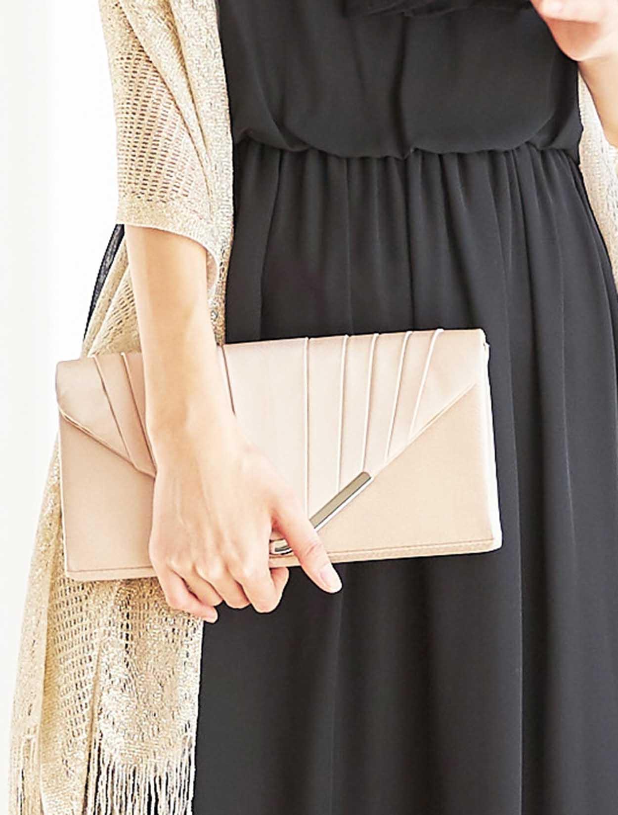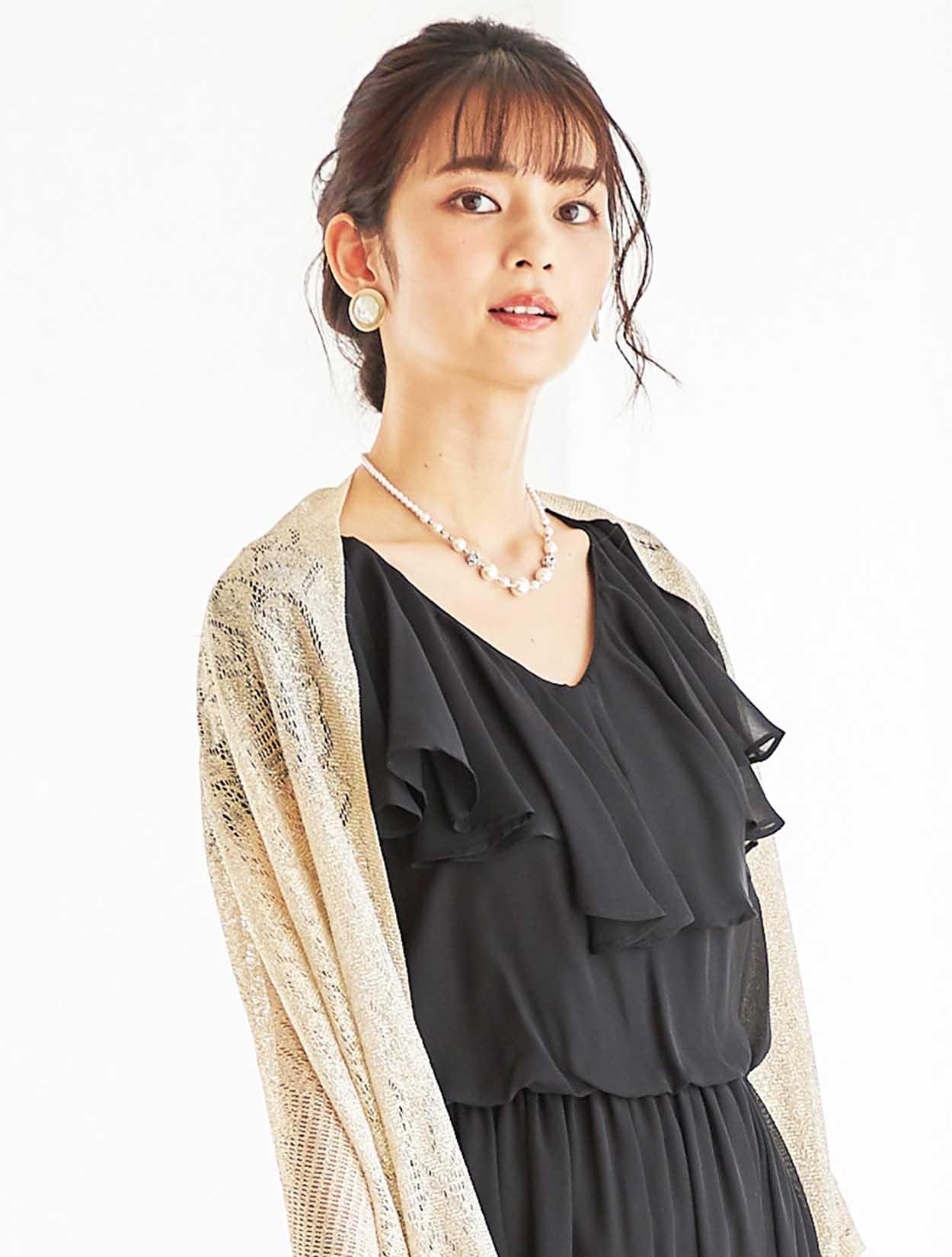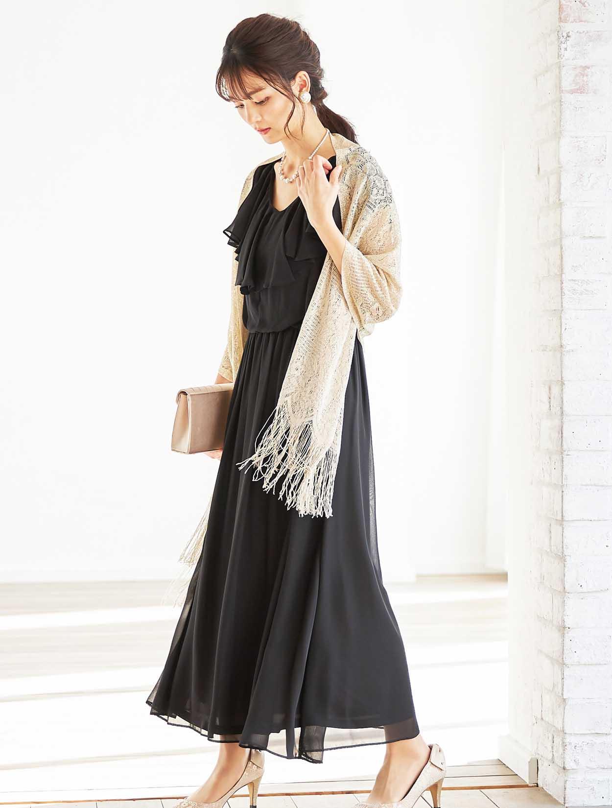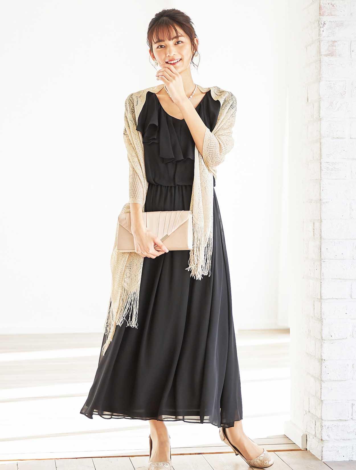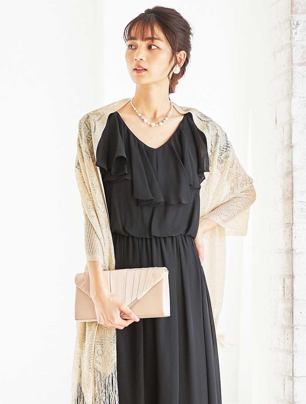 暗くなりがちなブラックのロングドレスも、華やかなゴールドを合わせる事でエレガントな女性の装いに。