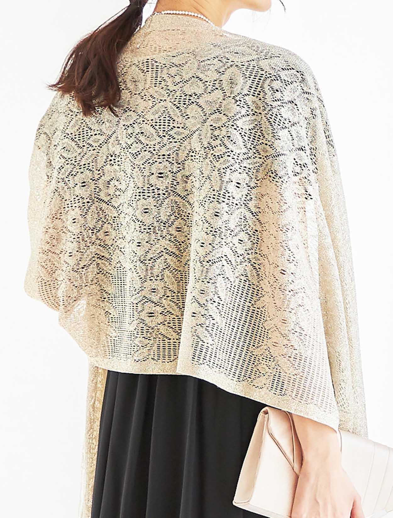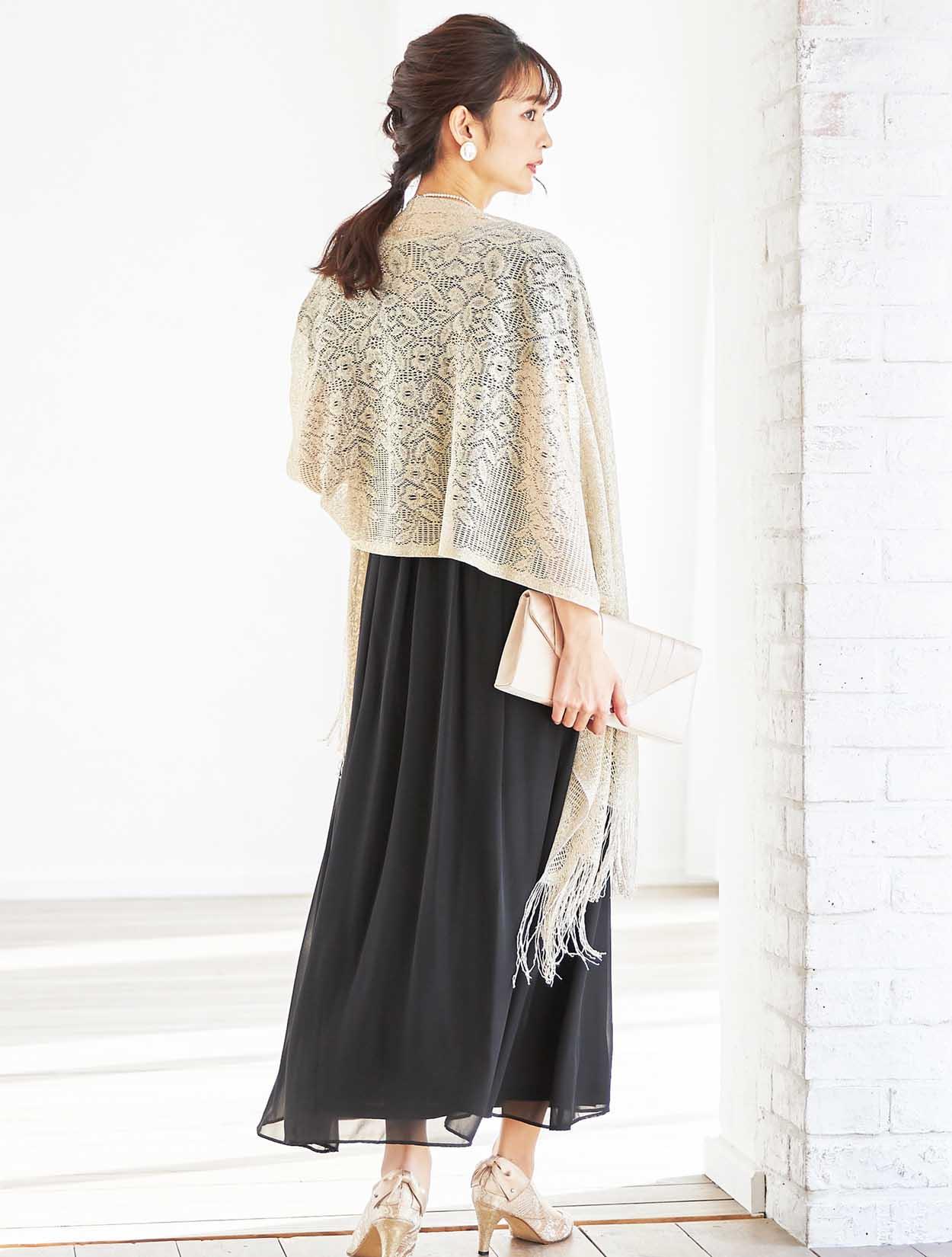 ブラックによく映えるゴールドのショールを合わせたコーディネート。