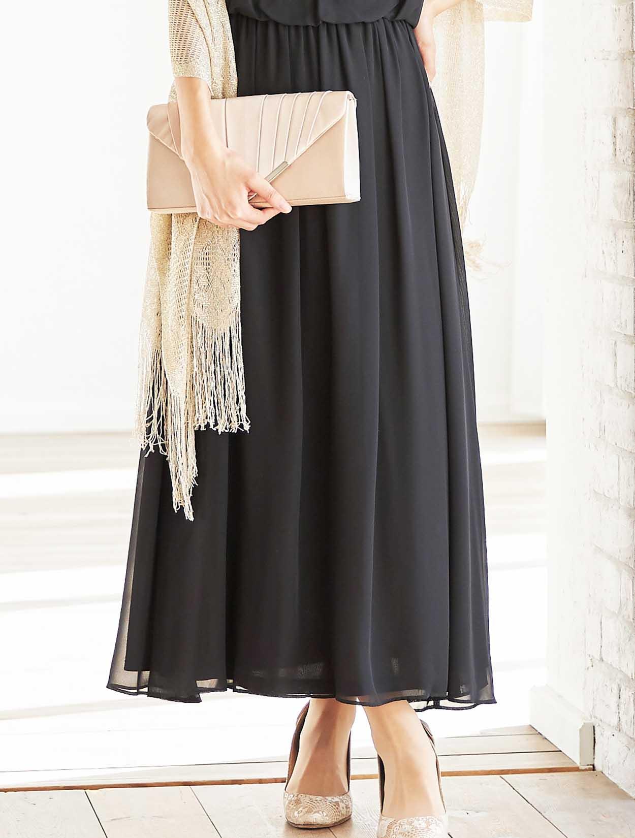 軽くて透け感のあるシフォン生地を使用。生地をたっぷり使ったロングスカートが、動くたびに上品に揺れるエアリー感たっぷりの大人のロングドレス。