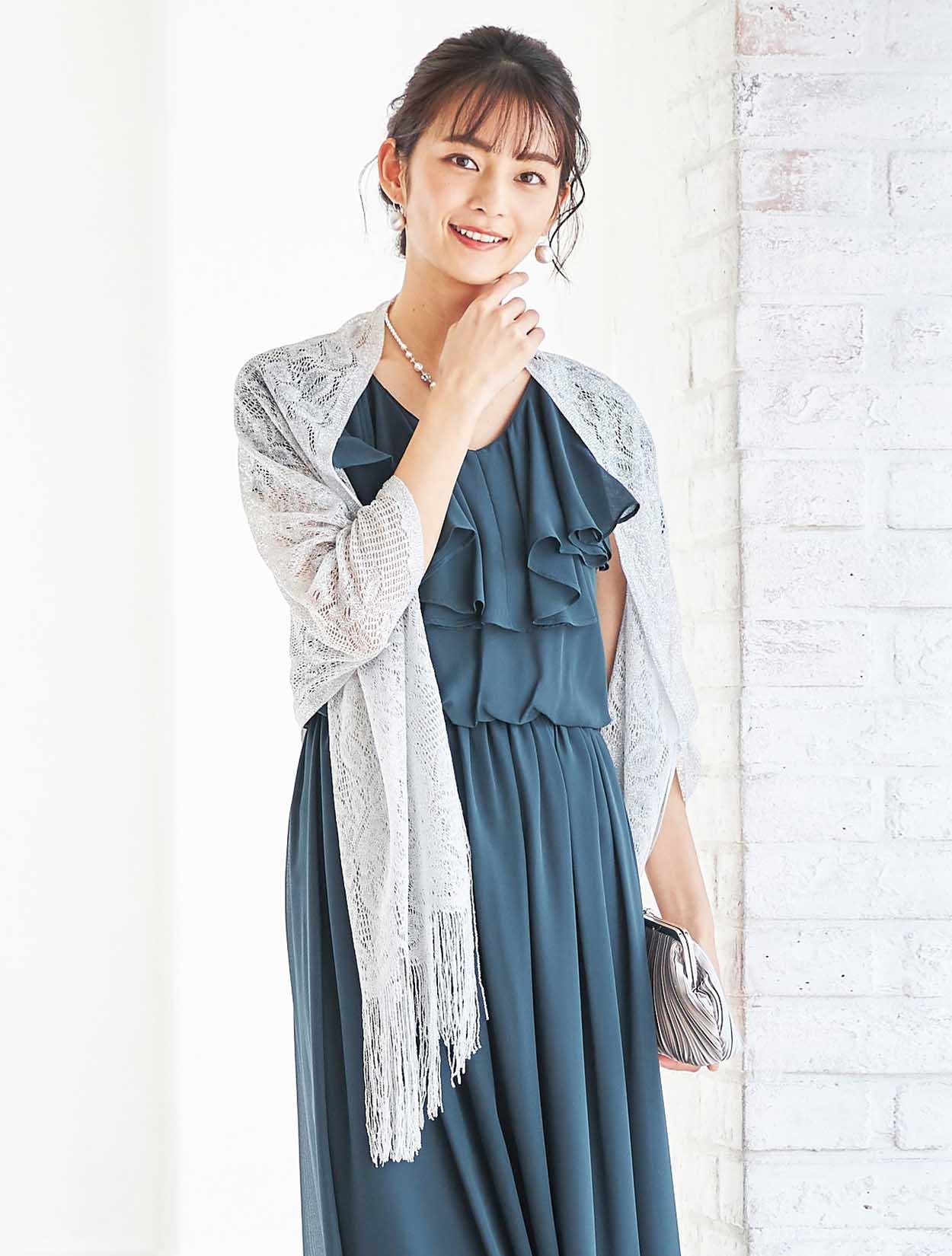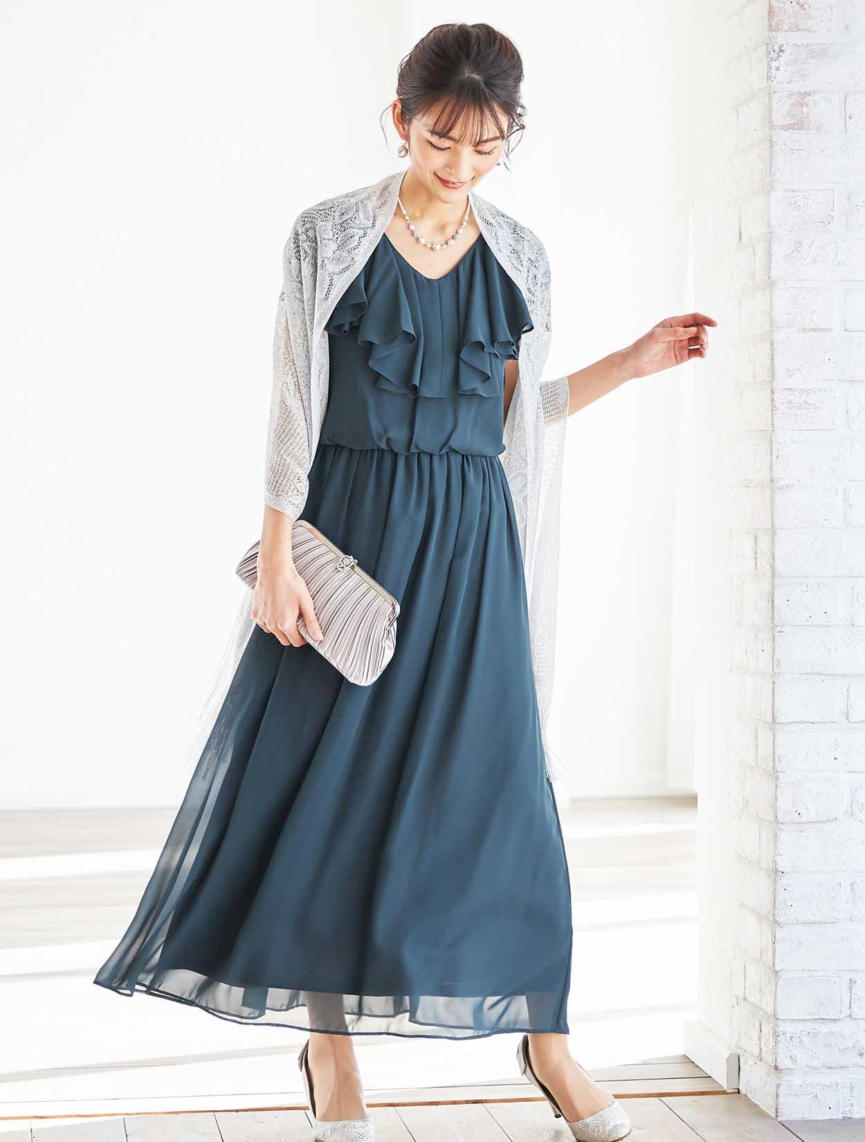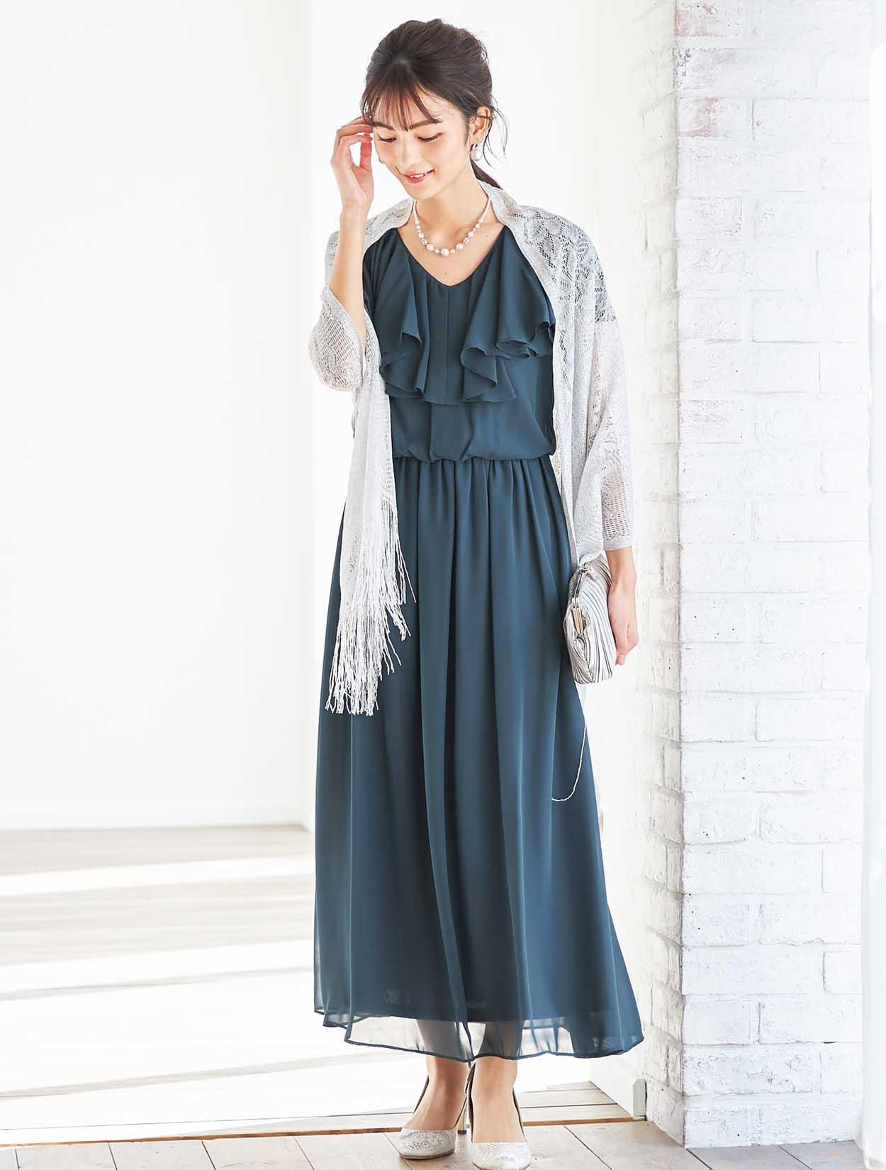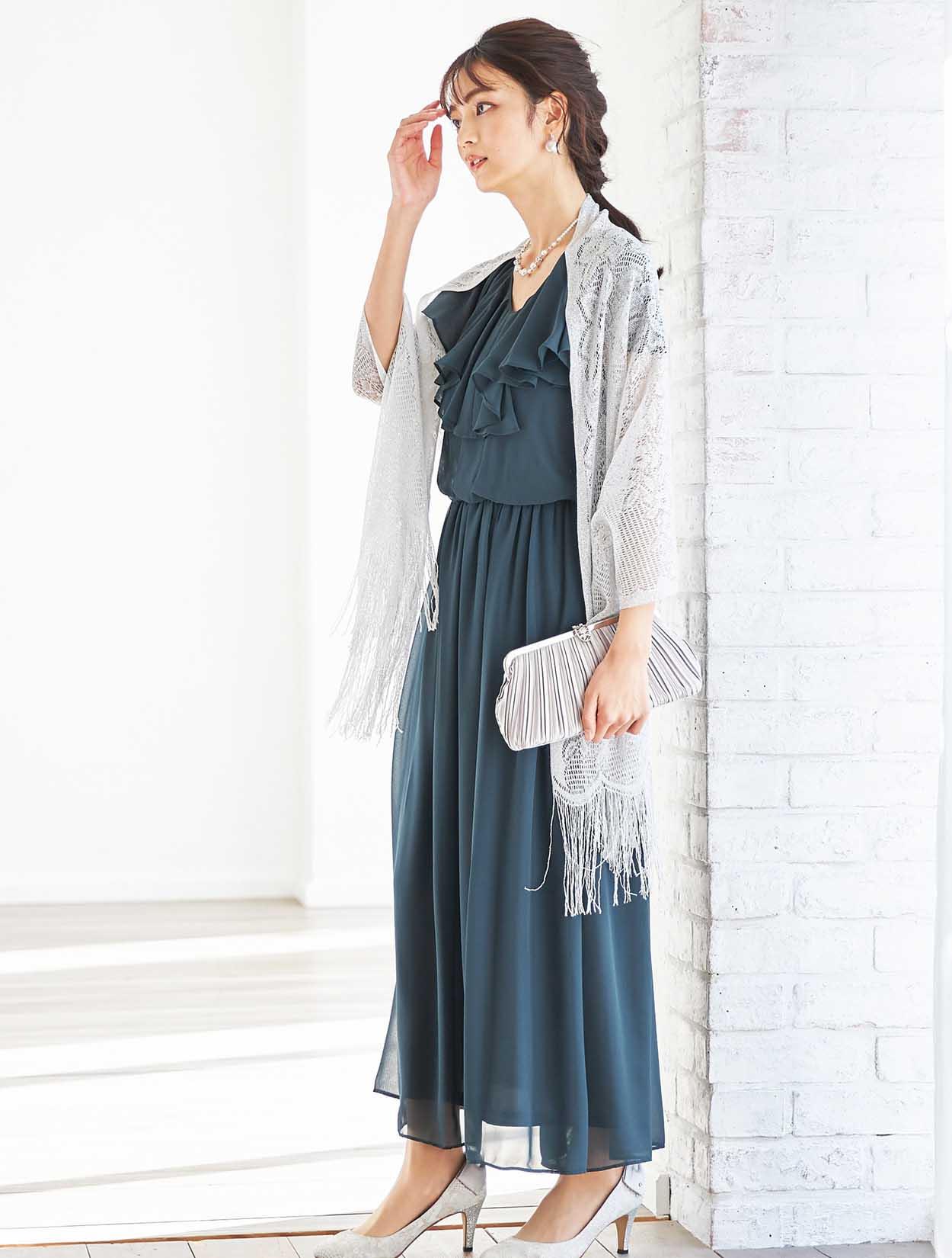 デコルテ全体を包み込むようなラッフルデザインがフェイスラインを華やかに。浅めのVネックがエレガントな大人の女性にぴったりのドレスです。