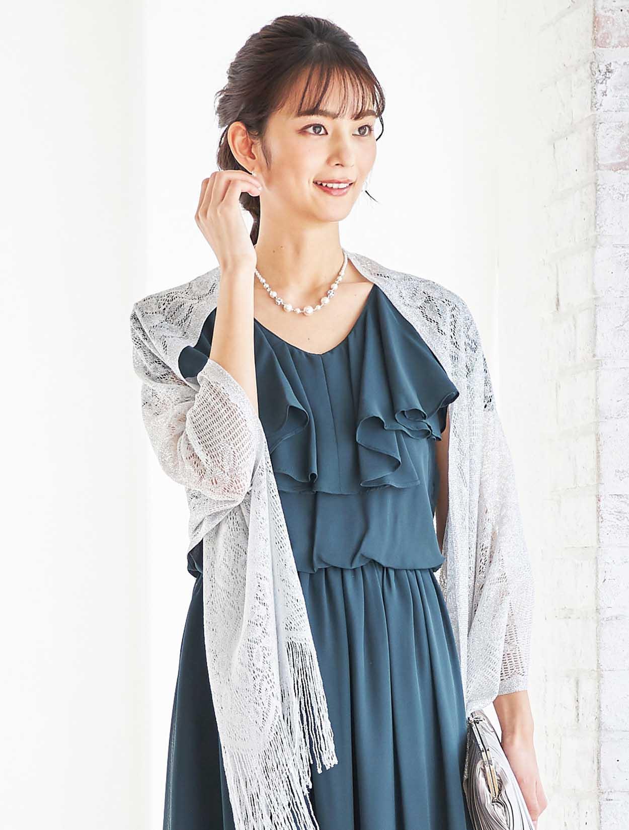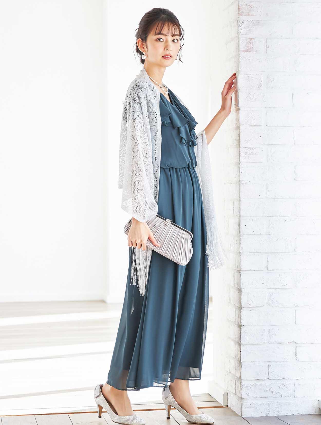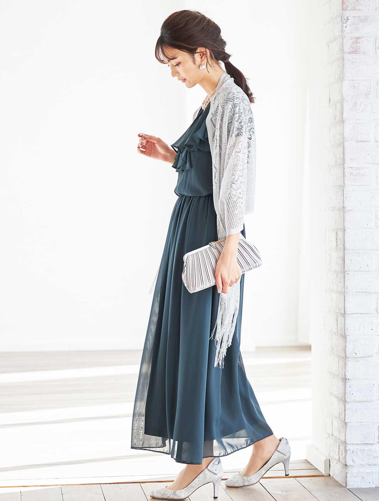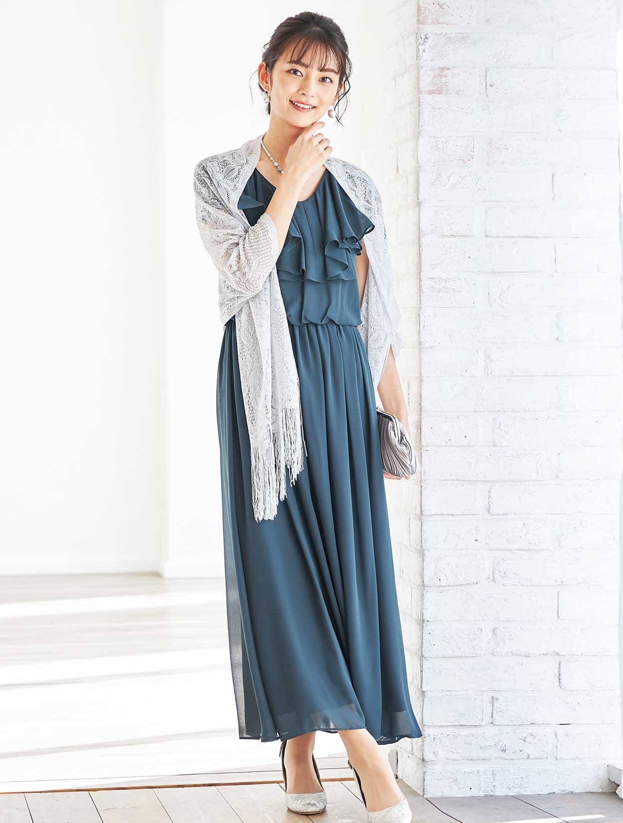デコルテ全体を包み込むようなラッフルデザインがフェイスラインを華やかに。浅めのVネックがエレガントな大人の女性にぴったりのドレスです。