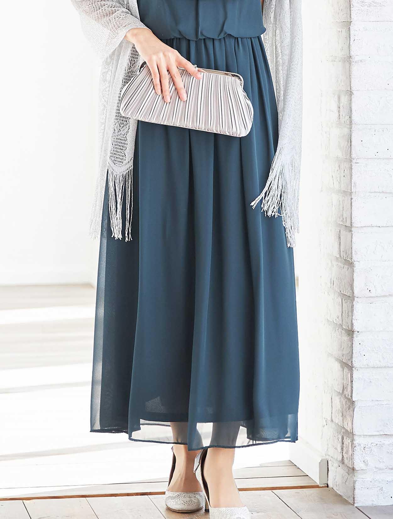 軽くて透け感のあるシフォン生地を使用。生地をたっぷり使ったロングスカートが、動くたびに上品に揺れるエアリー感たっぷりの大人のロングドレス。
