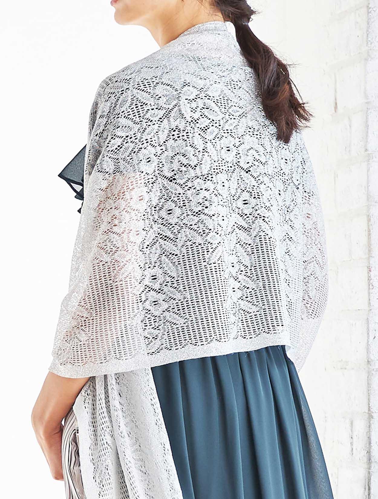 グリーンと相性のいいシルバーのショールを合わせたシャープなコーディネート。