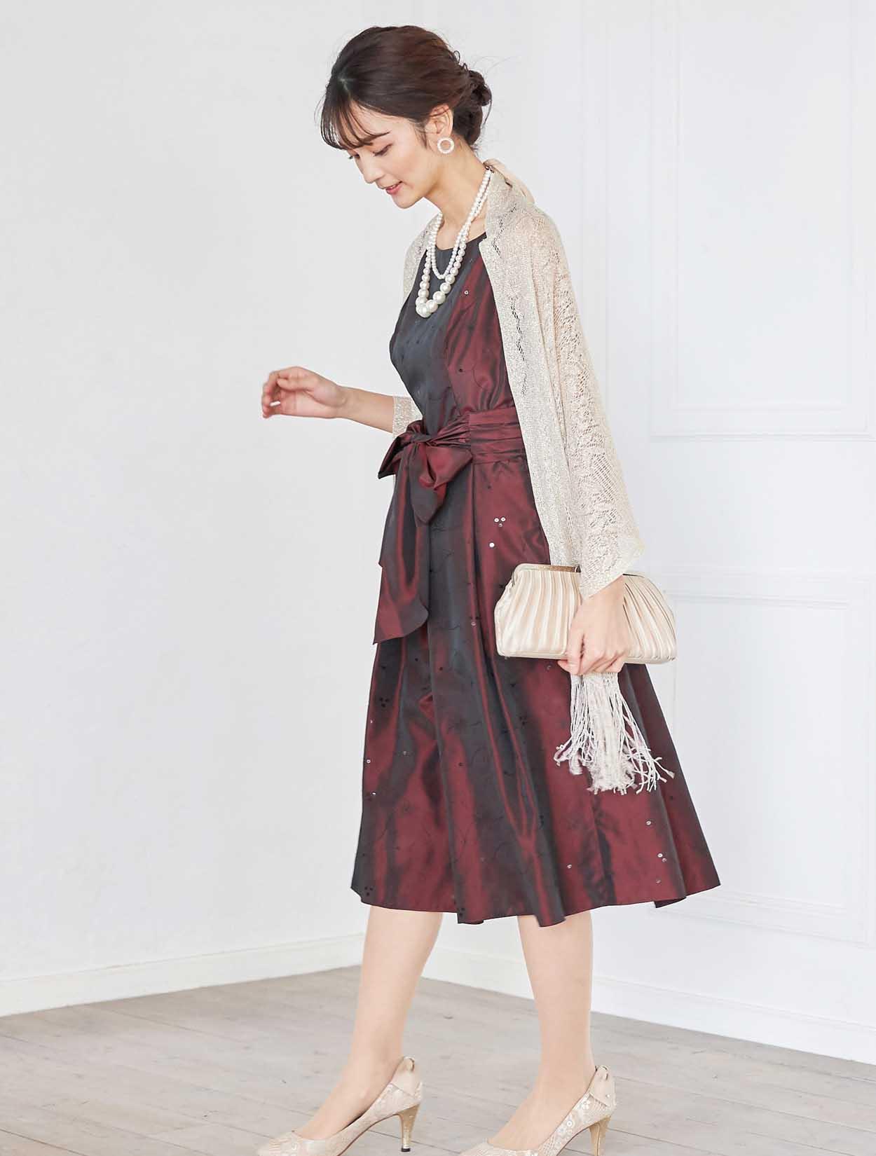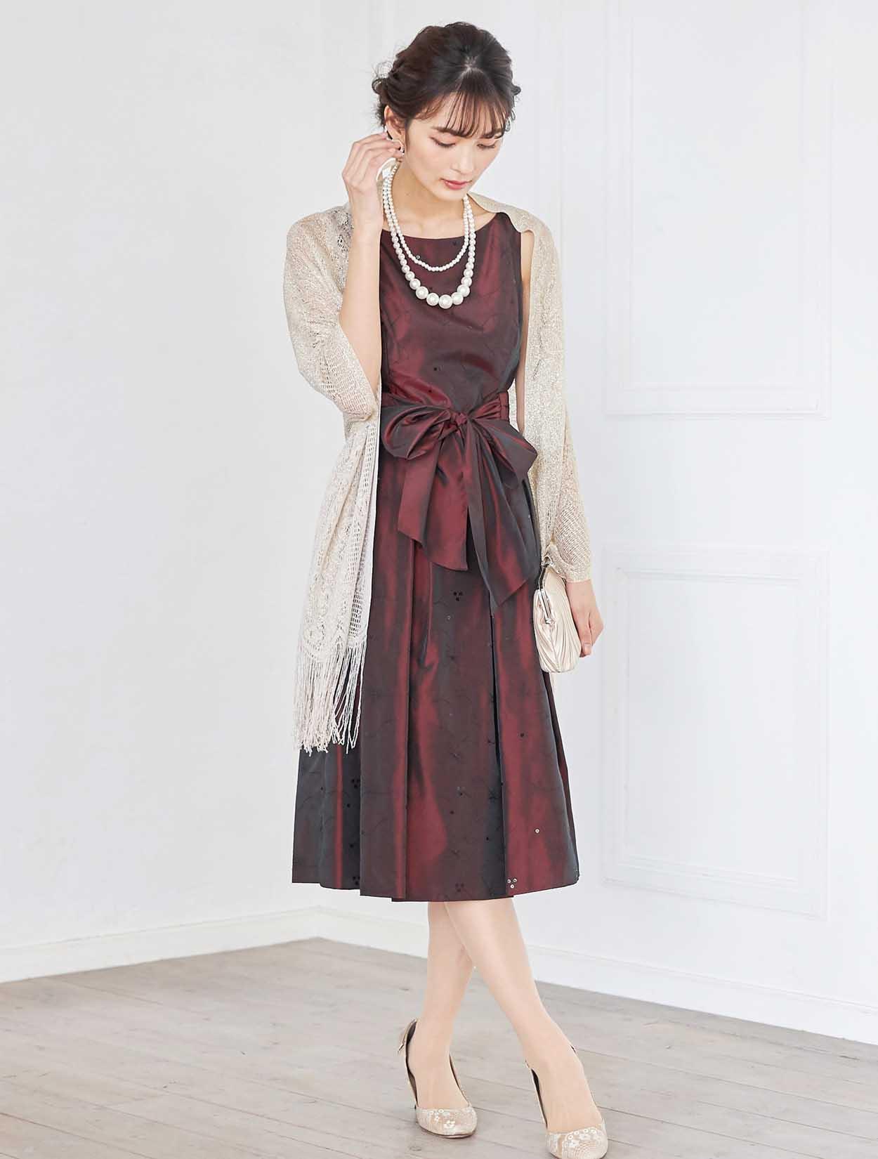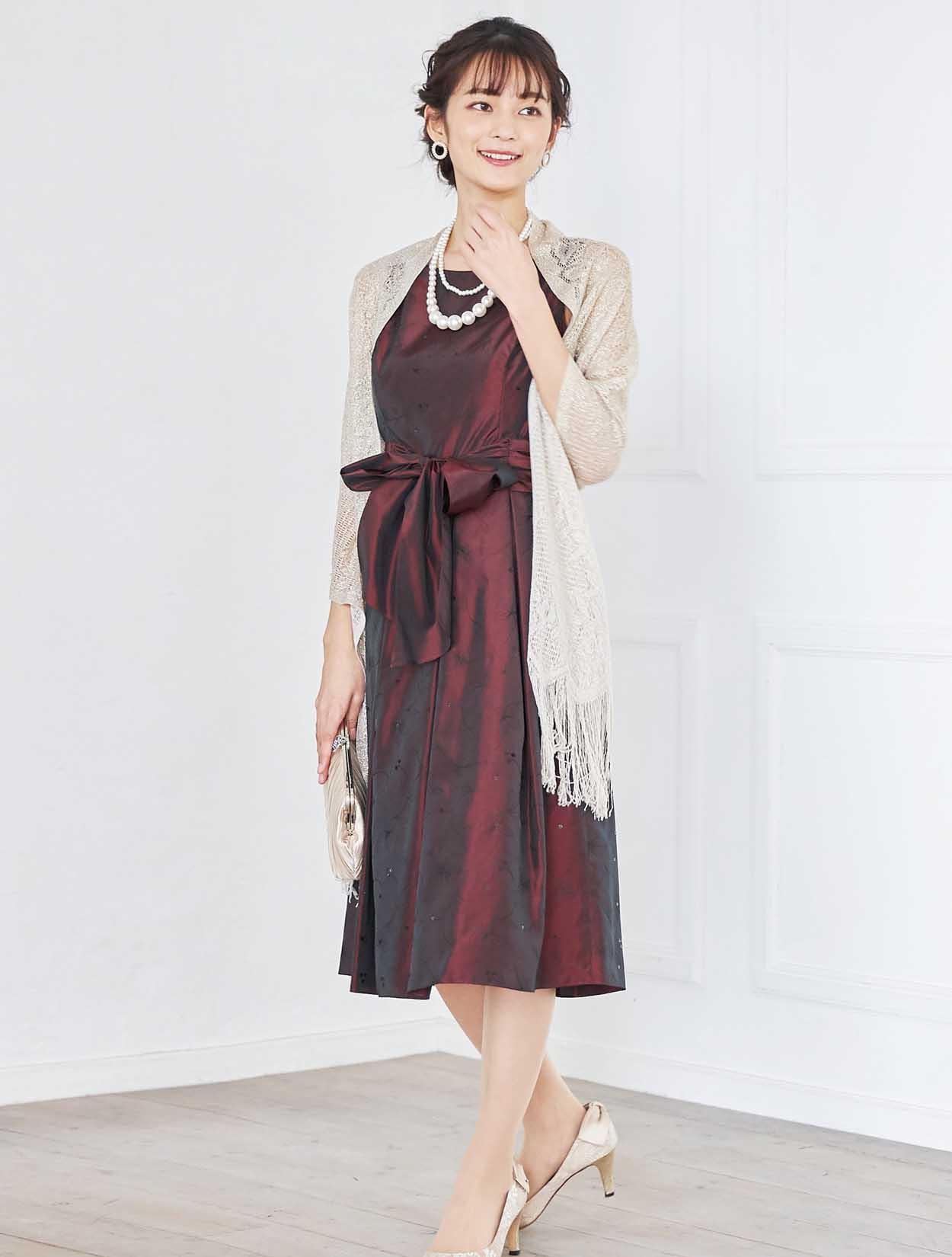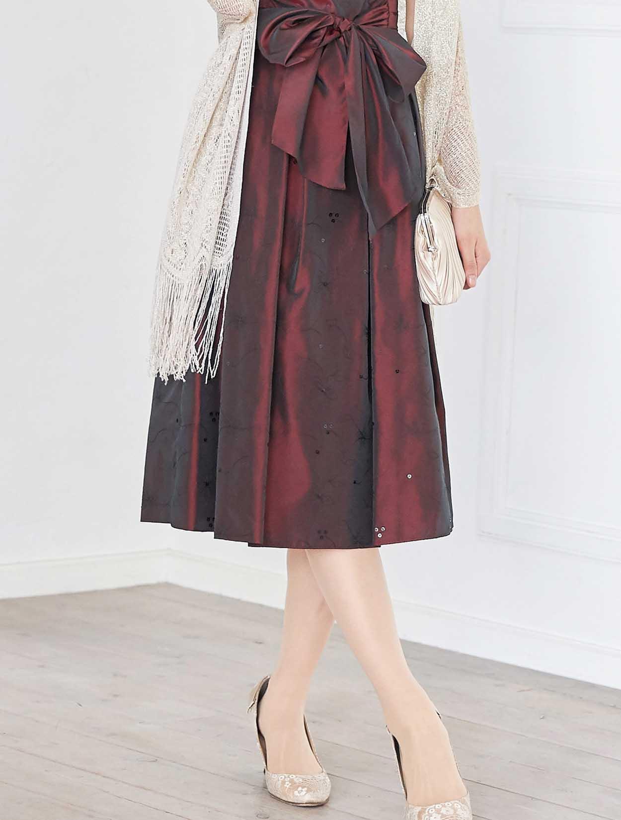 キュッと絞ったウエストからふわっと広がるスカートは、ドレスの定番「フィット&フレア」。ポイントはなんと言ってもスタイルが良く見えること。丈も長過ぎず短過ぎないので、148cm〜168cmほどの方まで幅広く着用可能です。生地はハリと高級感のあるタフタ生地。フレアスカートのふんわり感をキープしてくれるので、小柄な方でも足元が重たく見えません。また、腰回りもうまくカバーしてくれるので、ヒップ周りが気になる方にもおすすめです。ウエストのリボンベルトは、前で結ぶと可愛らしく、後ろで結ぶとスッキリ見えます。ドレス全体の刺繍が華やかで、格式高い会場にも映えます。