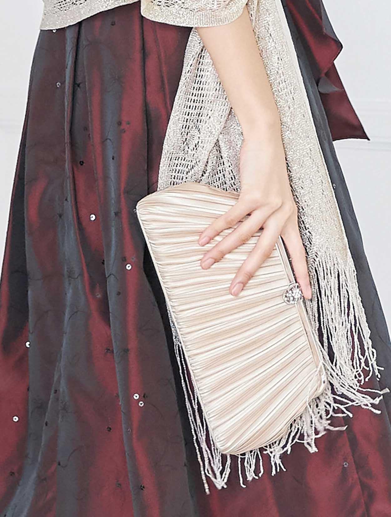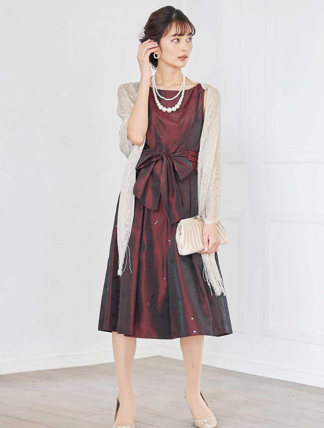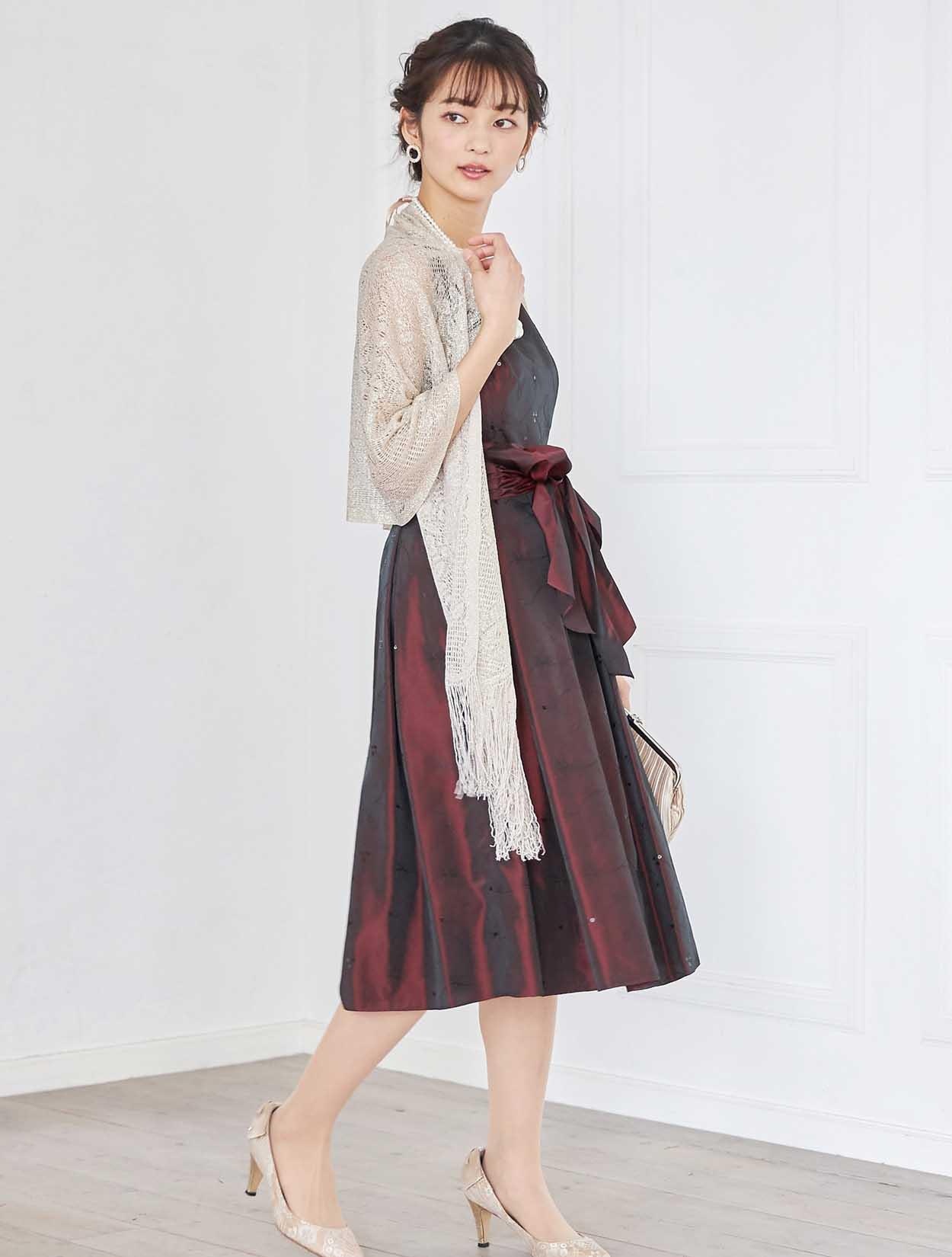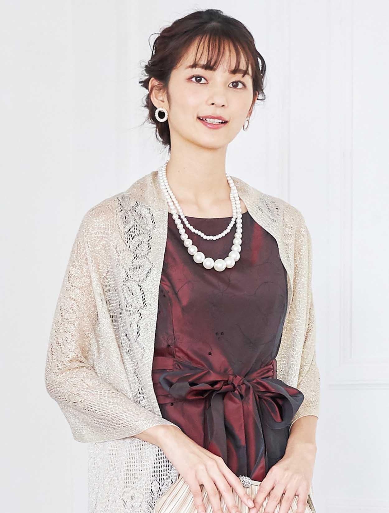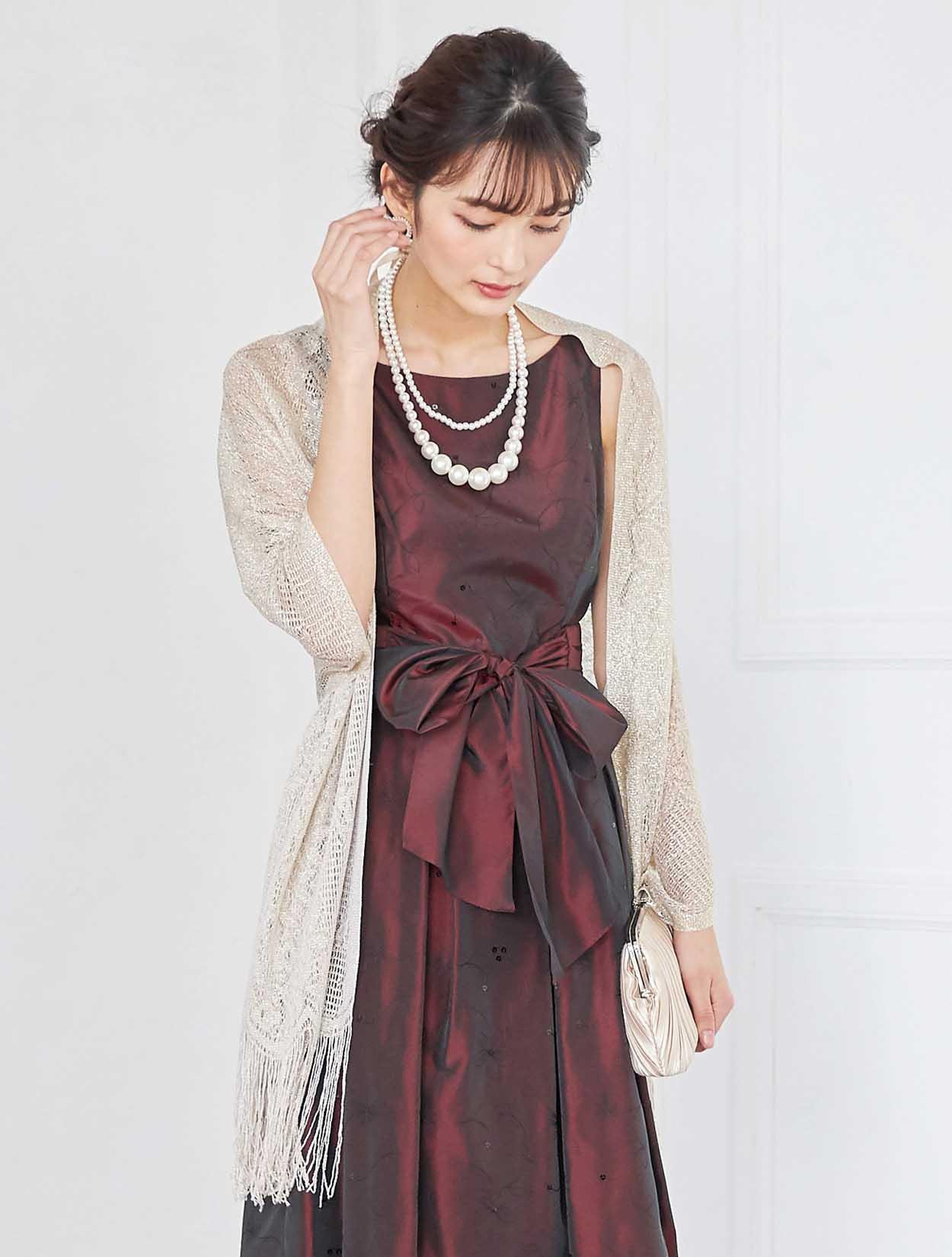 ラメ入りのゴールドのストールで華やかさを演出するコーディネート。ボルドーのドレスは秋冬に人気ですが小物で透け感と柔らかさをプラスし、季節問わずご着用して頂けます。ネックレスは長さ調整が可能です◎