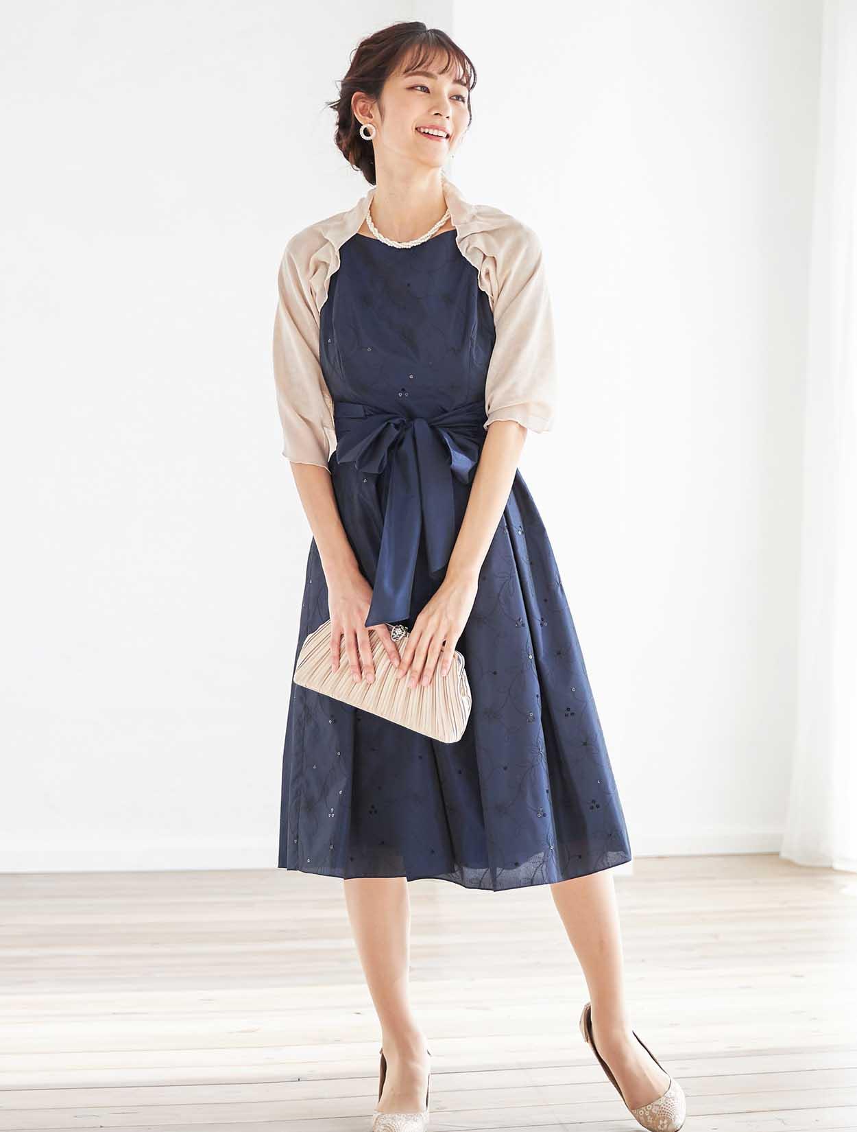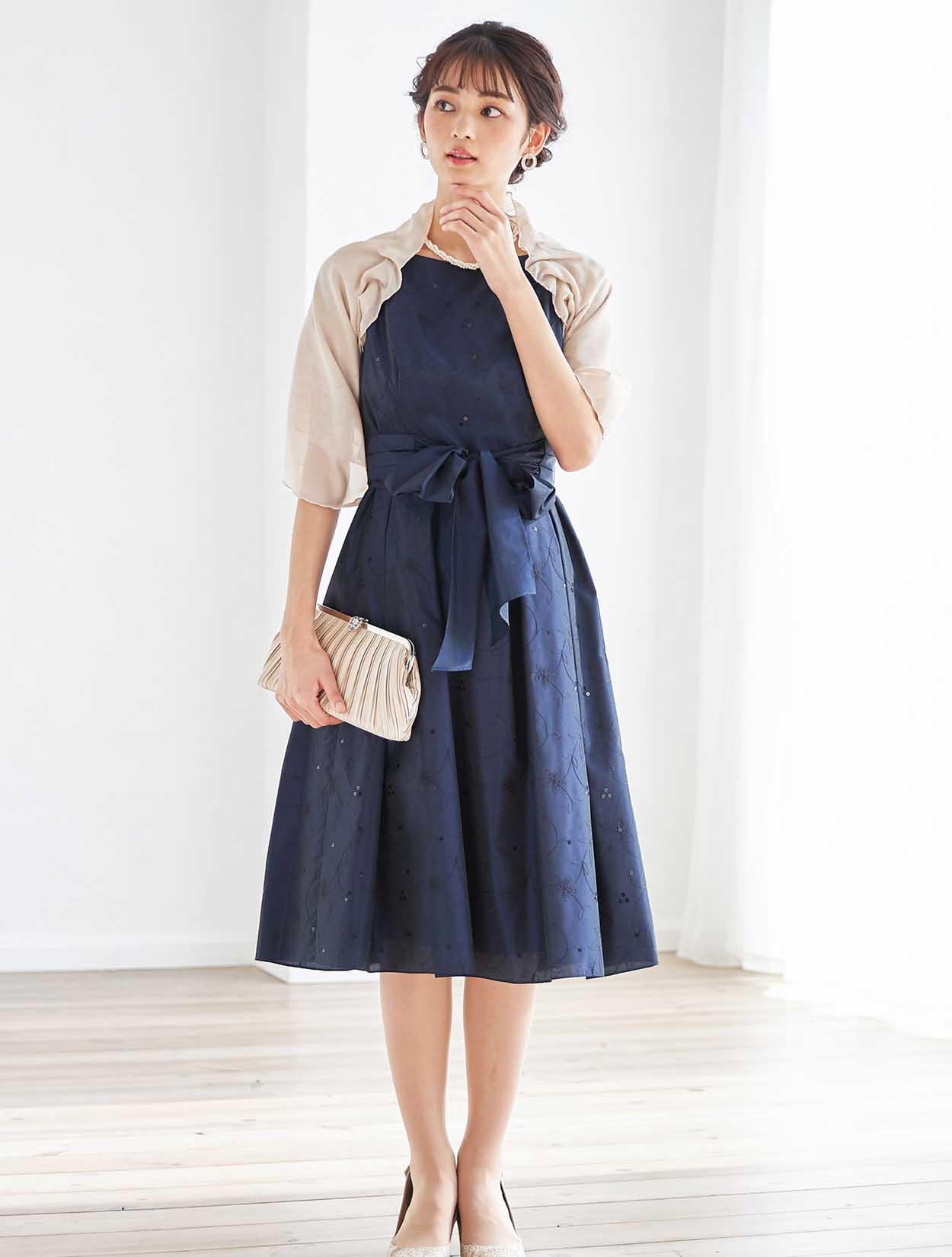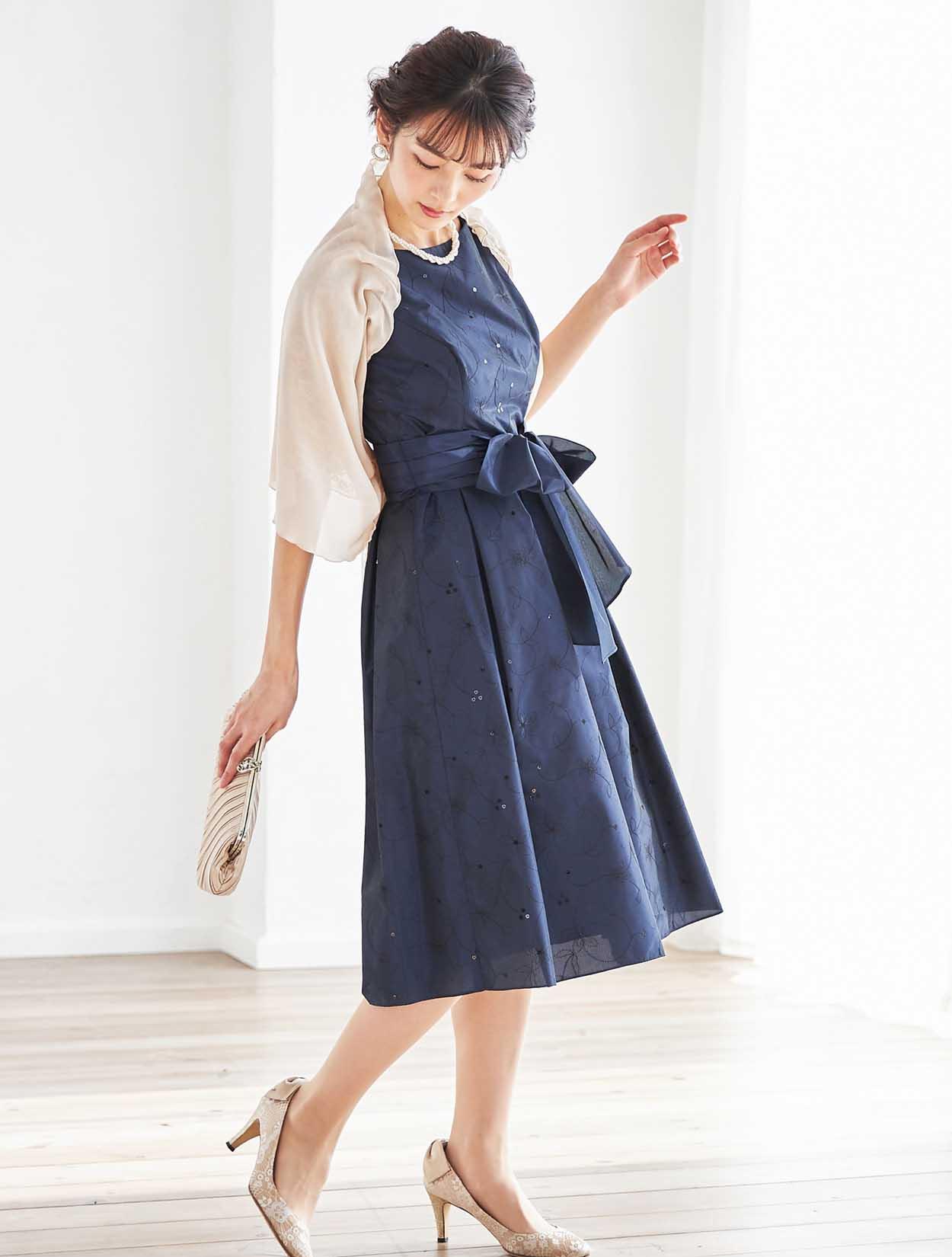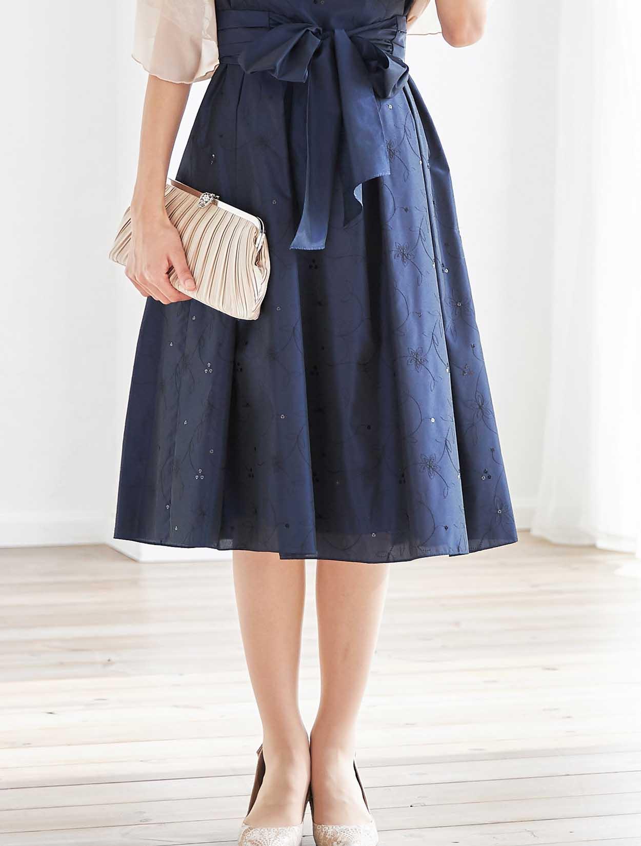 キュッと絞ったウエストからふわっと広がるスカートは、ドレスの定番「フィット&フレア」。ポイントはなんと言ってもスタイルが良く見えること。丈も長過ぎず短過ぎないので、148cm〜168cmほどの方まで幅広く着用可能です。生地はハリと高級感のあるタフタ生地。フレアスカートのふんわり感をキープしてくれるので、小柄な方でも足元が重たく見えません。また、腰回りもうまくカバーしてくれるので、ヒップ周りが気になる方にもおすすめです。ウエストのリボンベルトは、前で結ぶと可愛らしく、後ろで結ぶとスッキリ見えます。ドレス全体の刺繍が華やかで、格式高い会場にも映えます。
