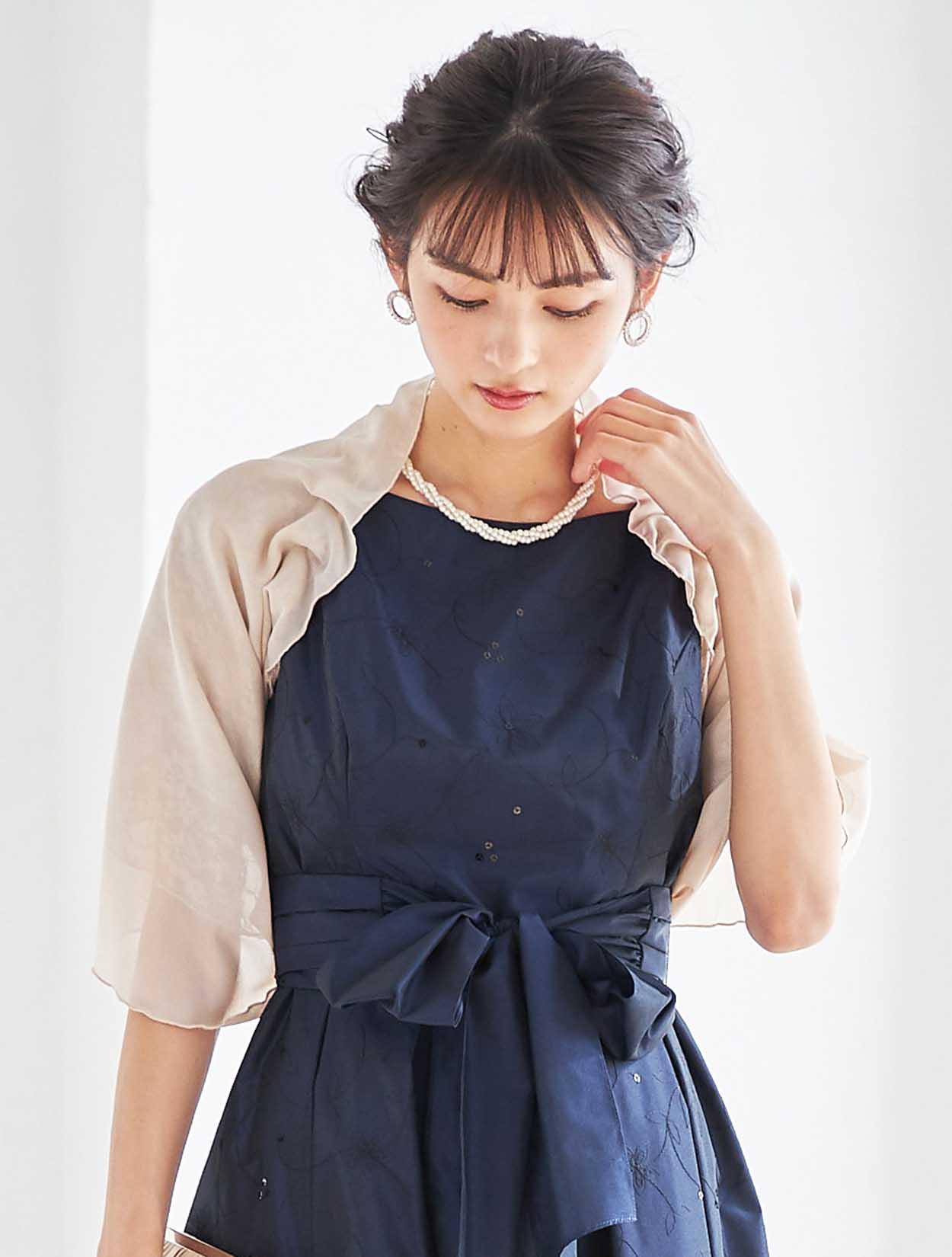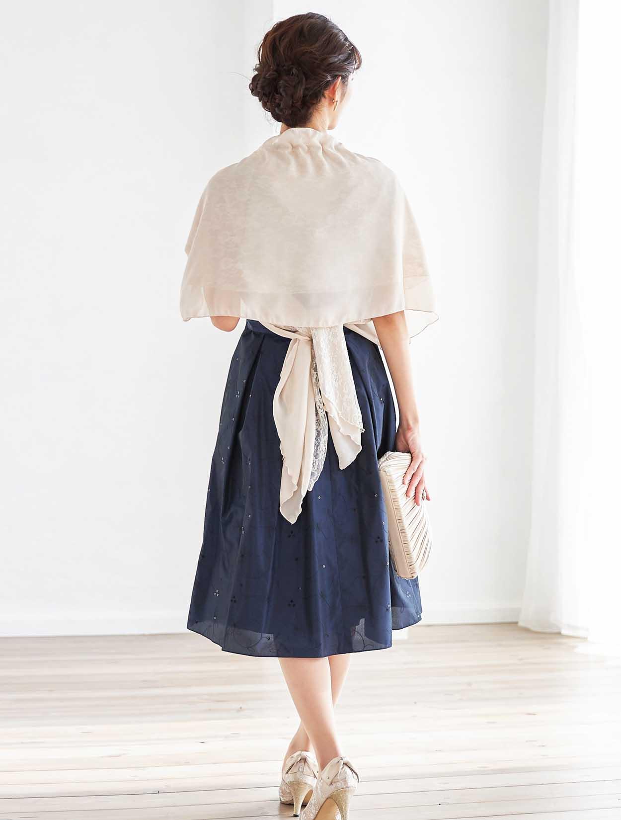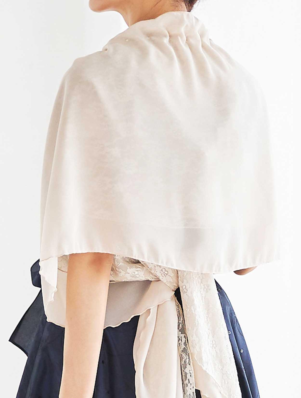 立体感が特徴的なベージュのショールを合わせた、ふんわりやさしいコーディネート。シフォンとラメレースが施されたショールは、嬉しい袖通し付き。肩からずれ落ちる心配もなく安定感抜群!