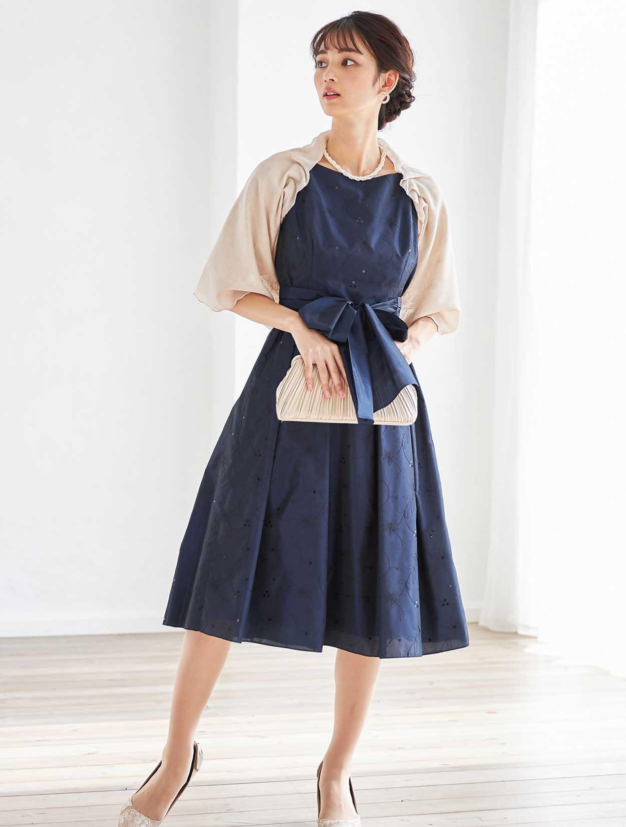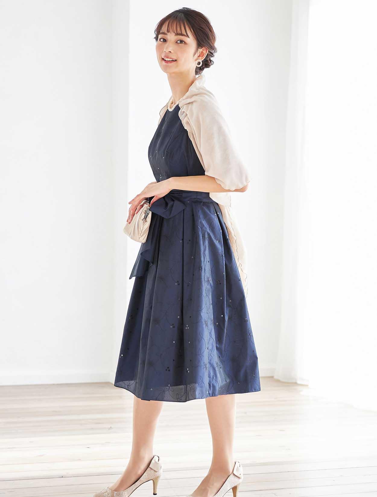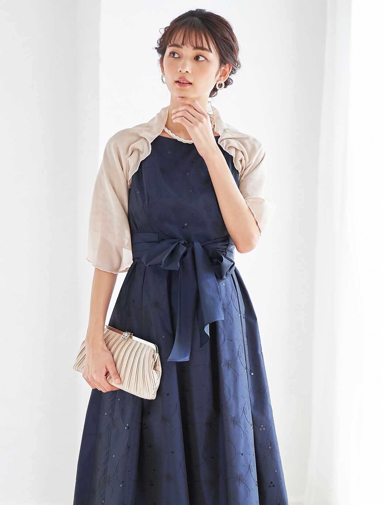 立体感が特徴的なベージュのショールを合わせた、ふんわりやさしいコーディネート。シフォンとラメレースが施されたショールは、嬉しい袖通し付き。肩からずれ落ちる心配もなく安定感抜群!