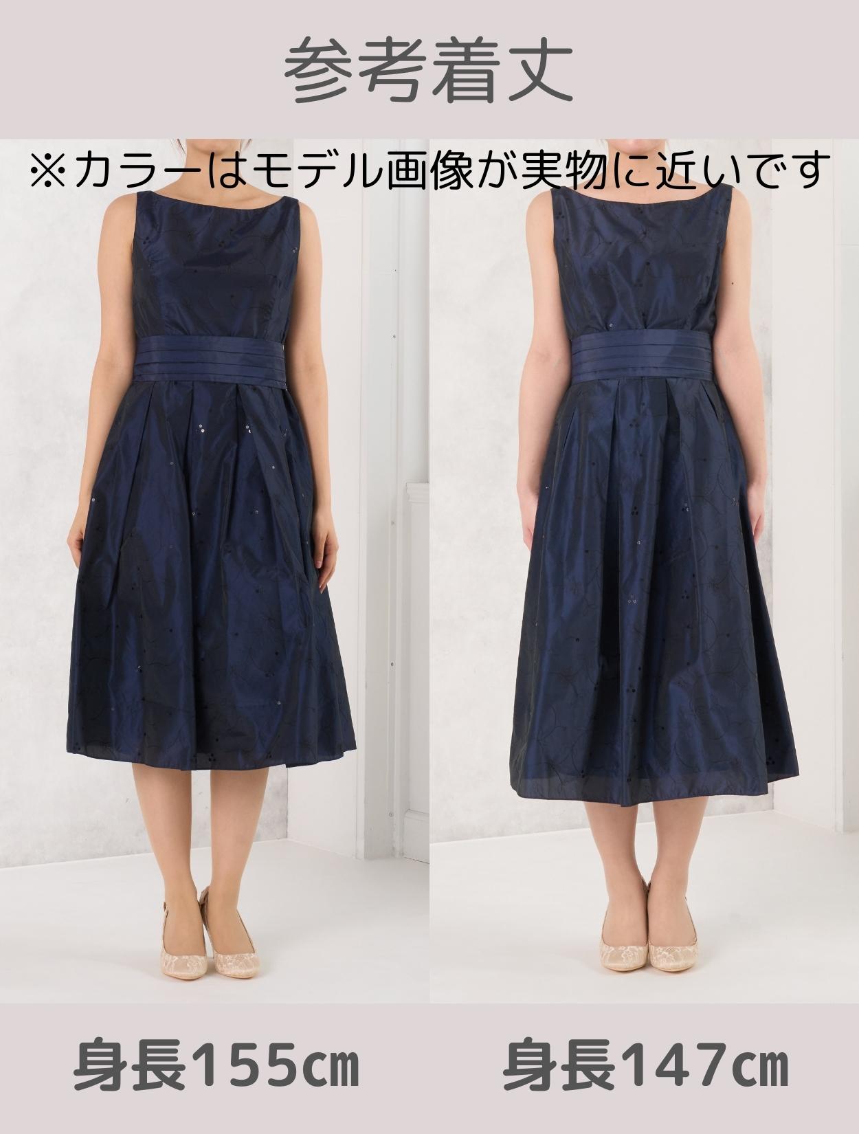 キュッと絞ったウエストからふわっと広がるスカートは、ドレスの定番「フィット&フレア」。ポイントはなんと言ってもスタイルが良く見えること。丈も長過ぎず短過ぎないので、148cm〜168cmほどの方まで幅広く着用可能です。生地はハリと高級感のあるタフタ生地。フレアスカートのふんわり感をキープしてくれるので、小柄な方でも足元が重たく見えません。また、腰回りもうまくカバーしてくれるので、ヒップ周りが気になる方にもおすすめです。ウエストのリボンベルトは、前で結ぶと可愛らしく、後ろで結ぶとスッキリ見えます。ドレス全体の刺繍が華やかで、格式高い会場にも映えます。