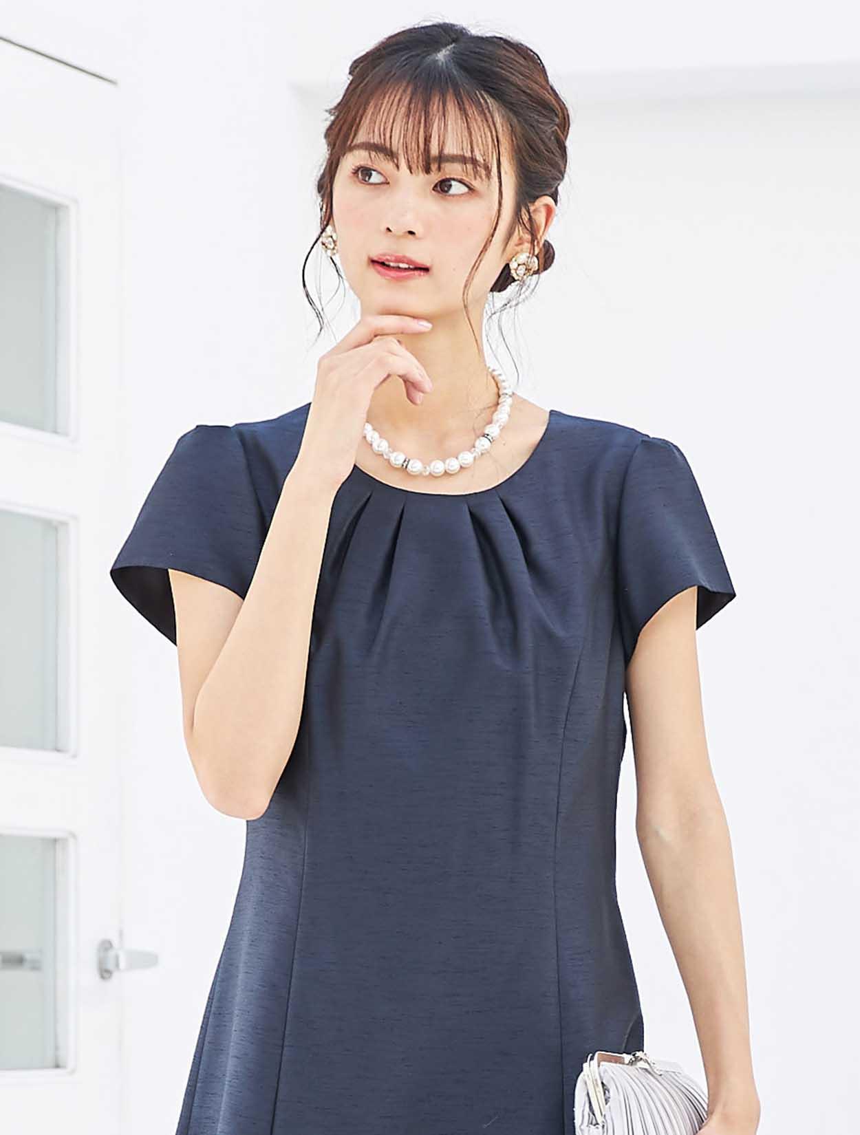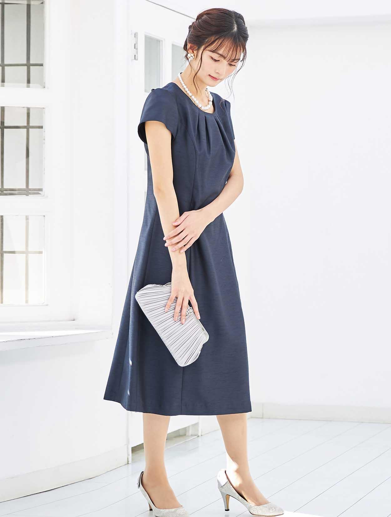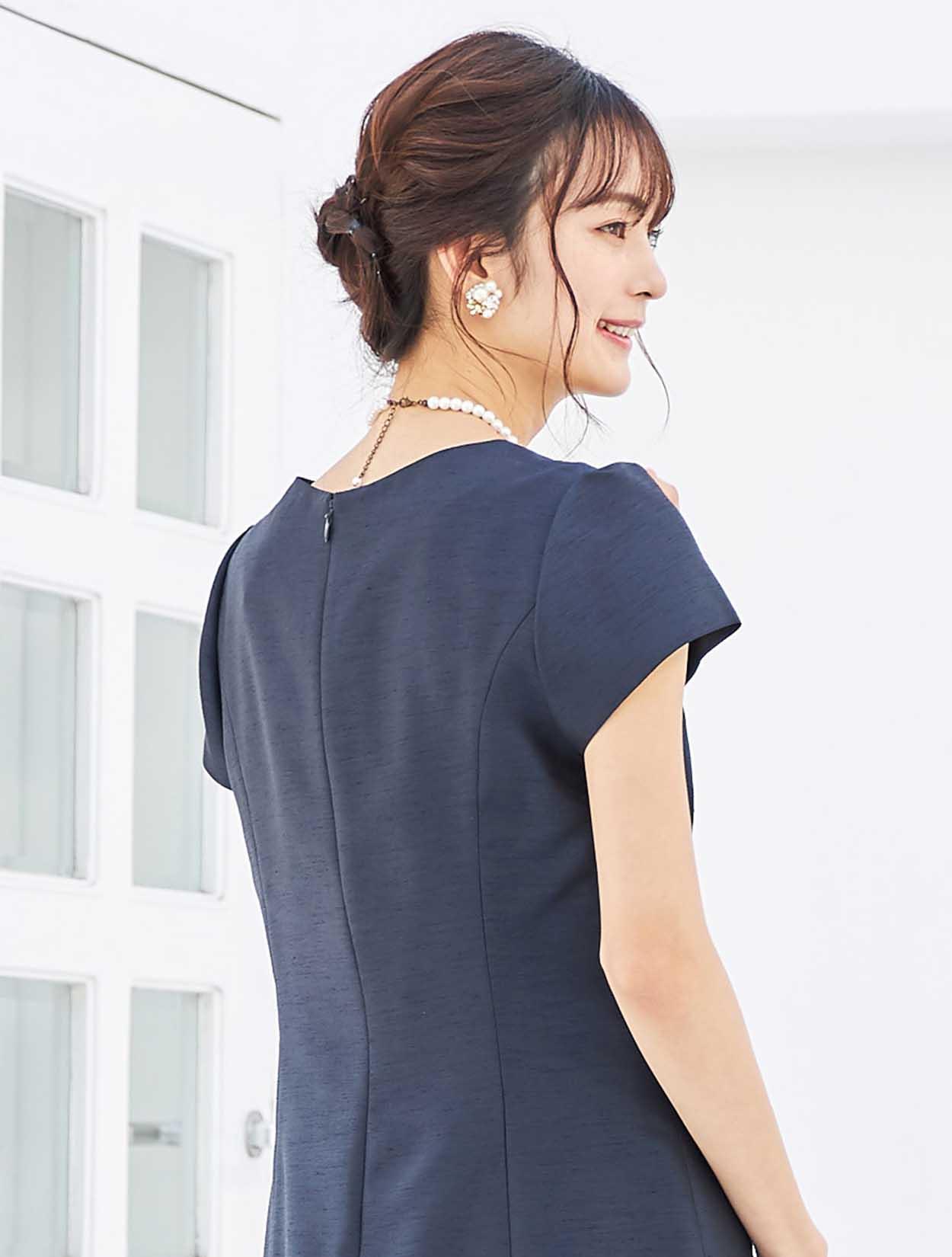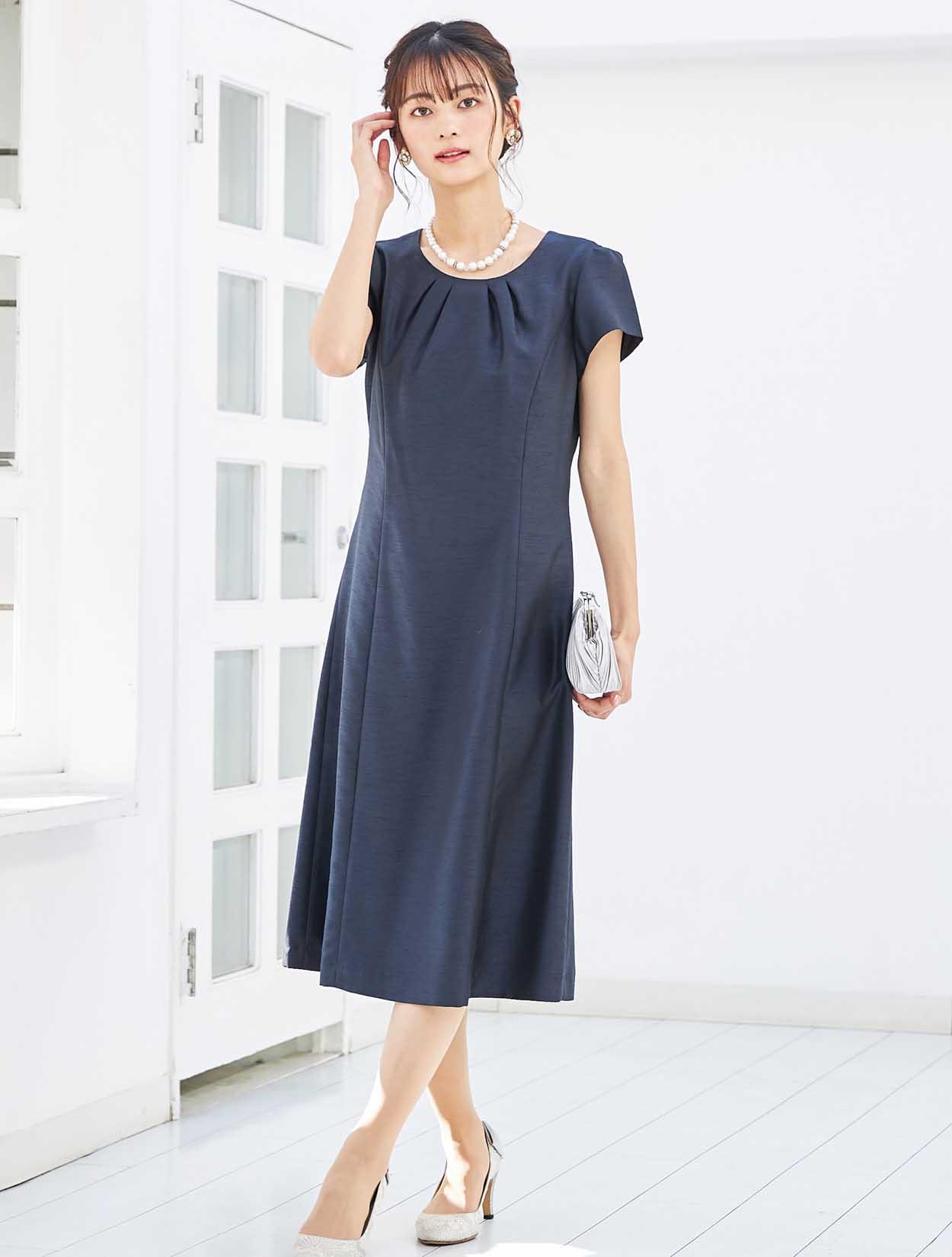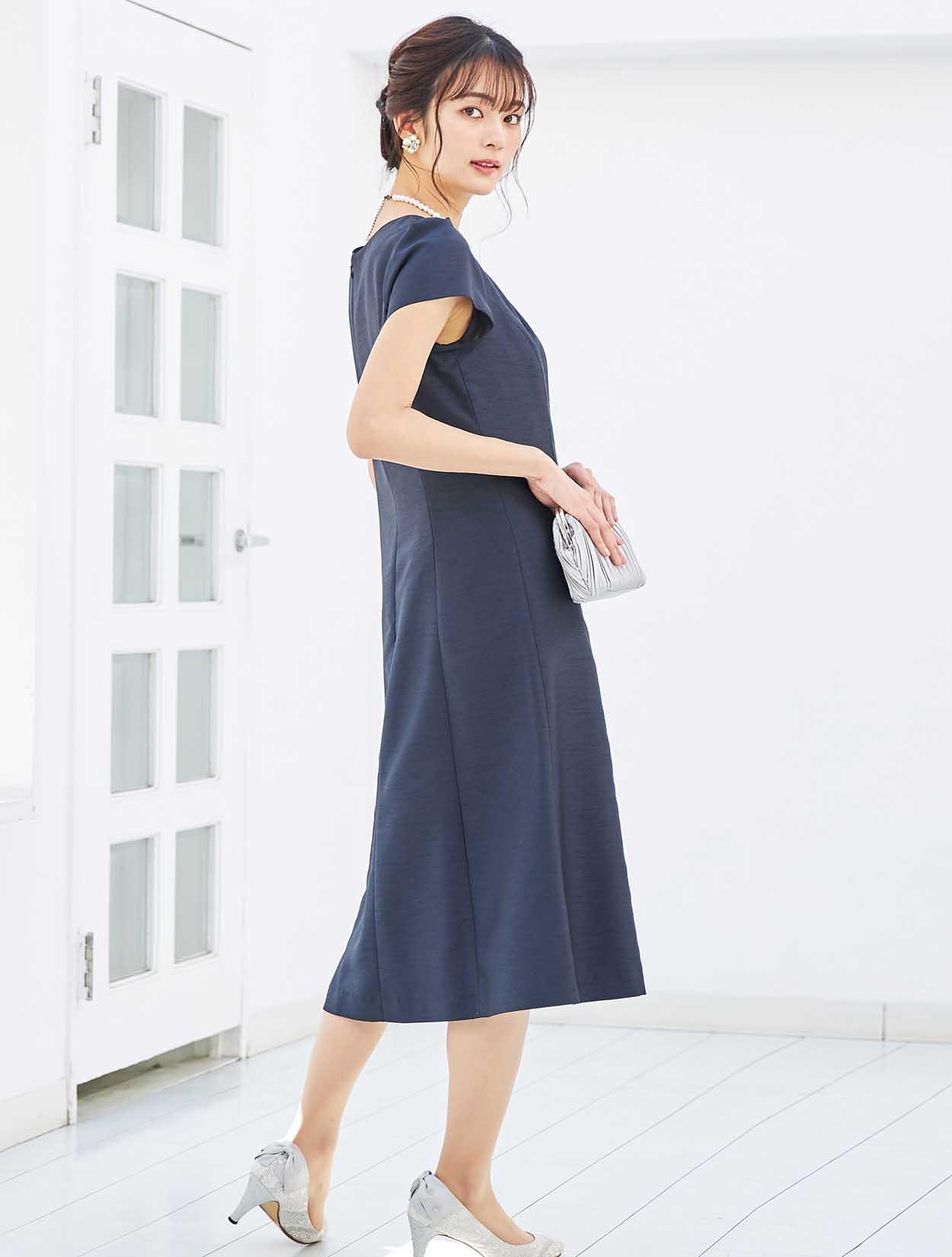 流れる様な緩やかなドレスラインは、身体のラインを拾い過ぎないスッキリした印象。安心のミディ丈でエレガントかつ上品な着こなしを実現。