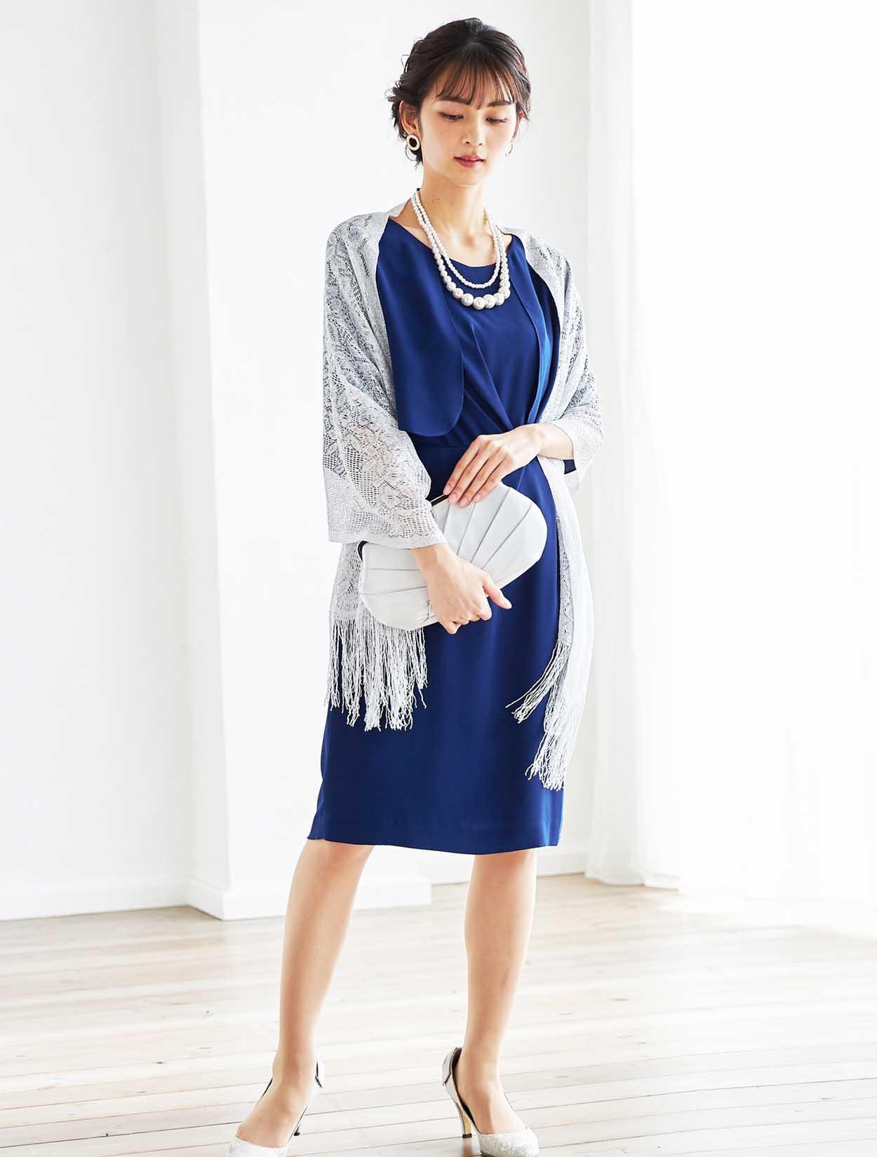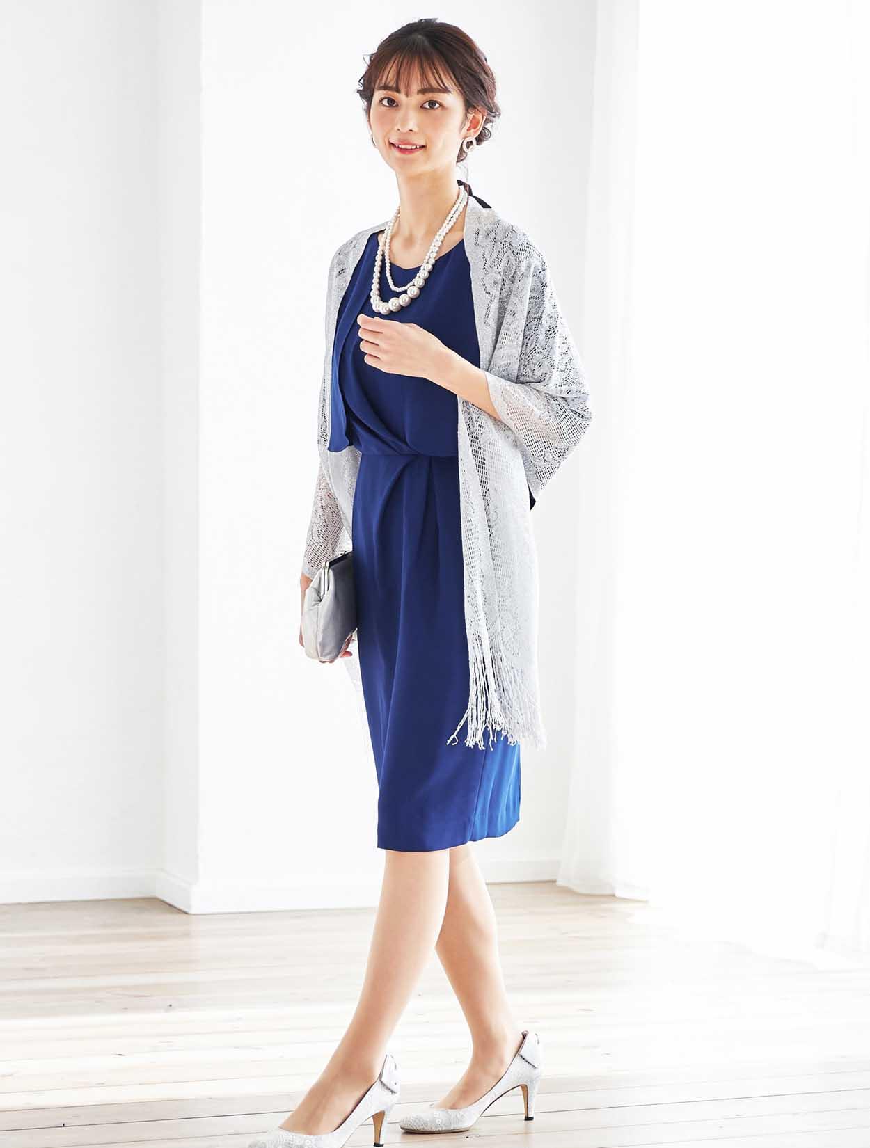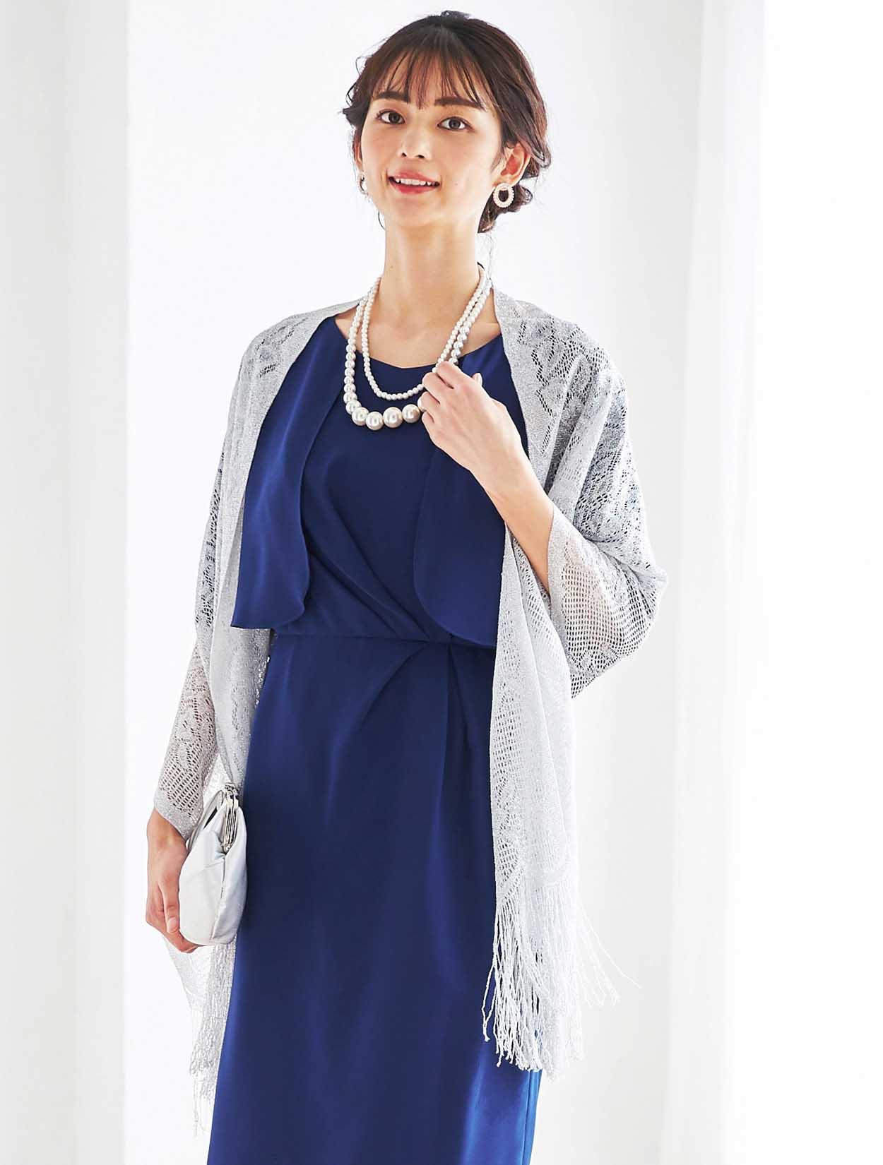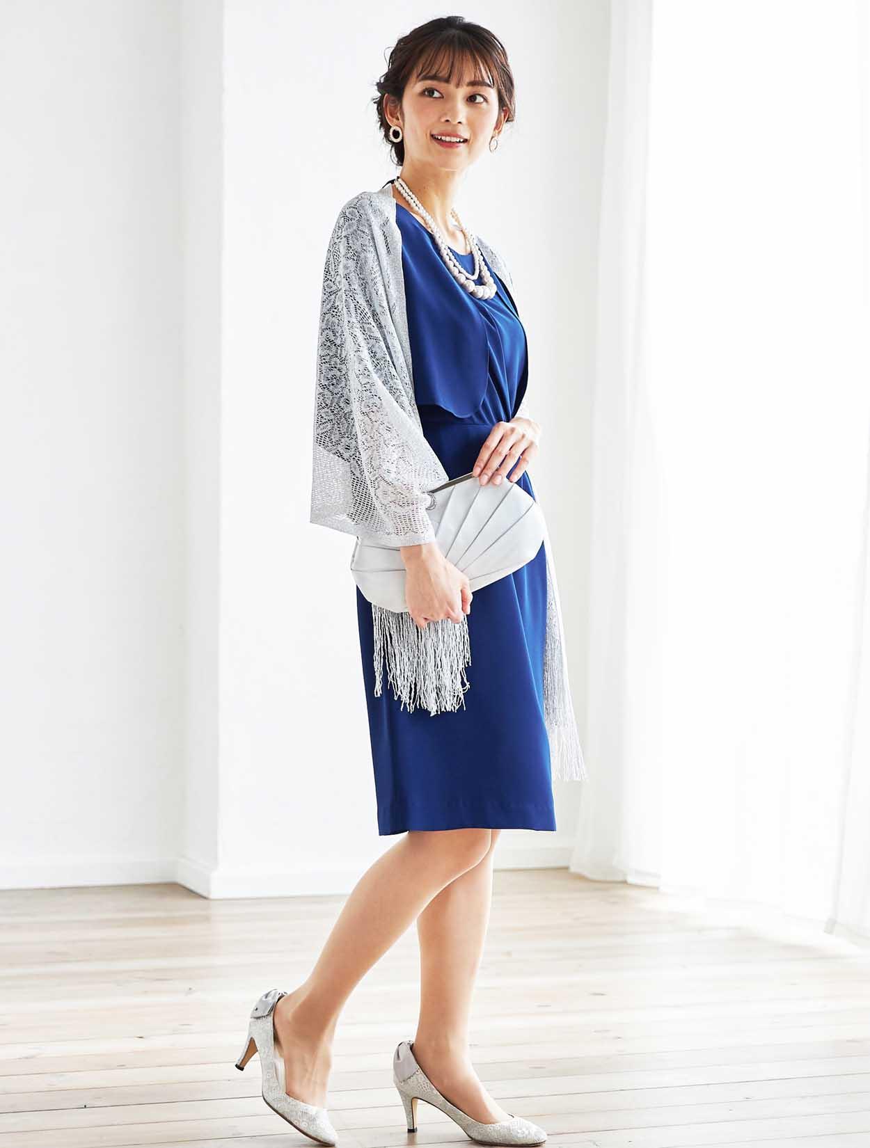 鮮やかなブルーのドレスにシルバーのストールを合わせ写真映えする華やかなコーディネートになっています。