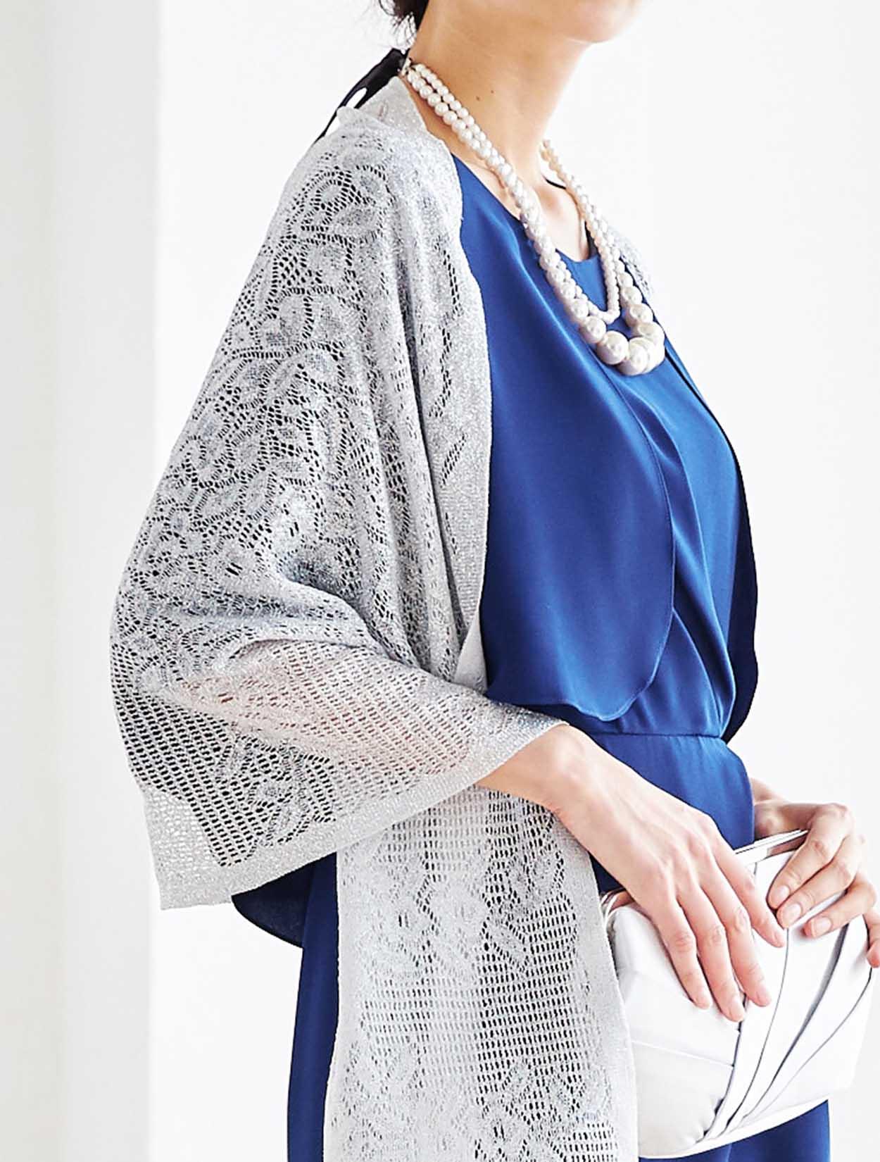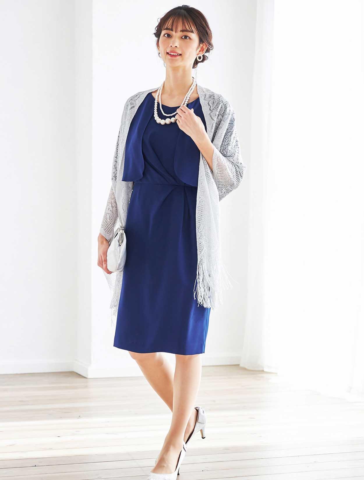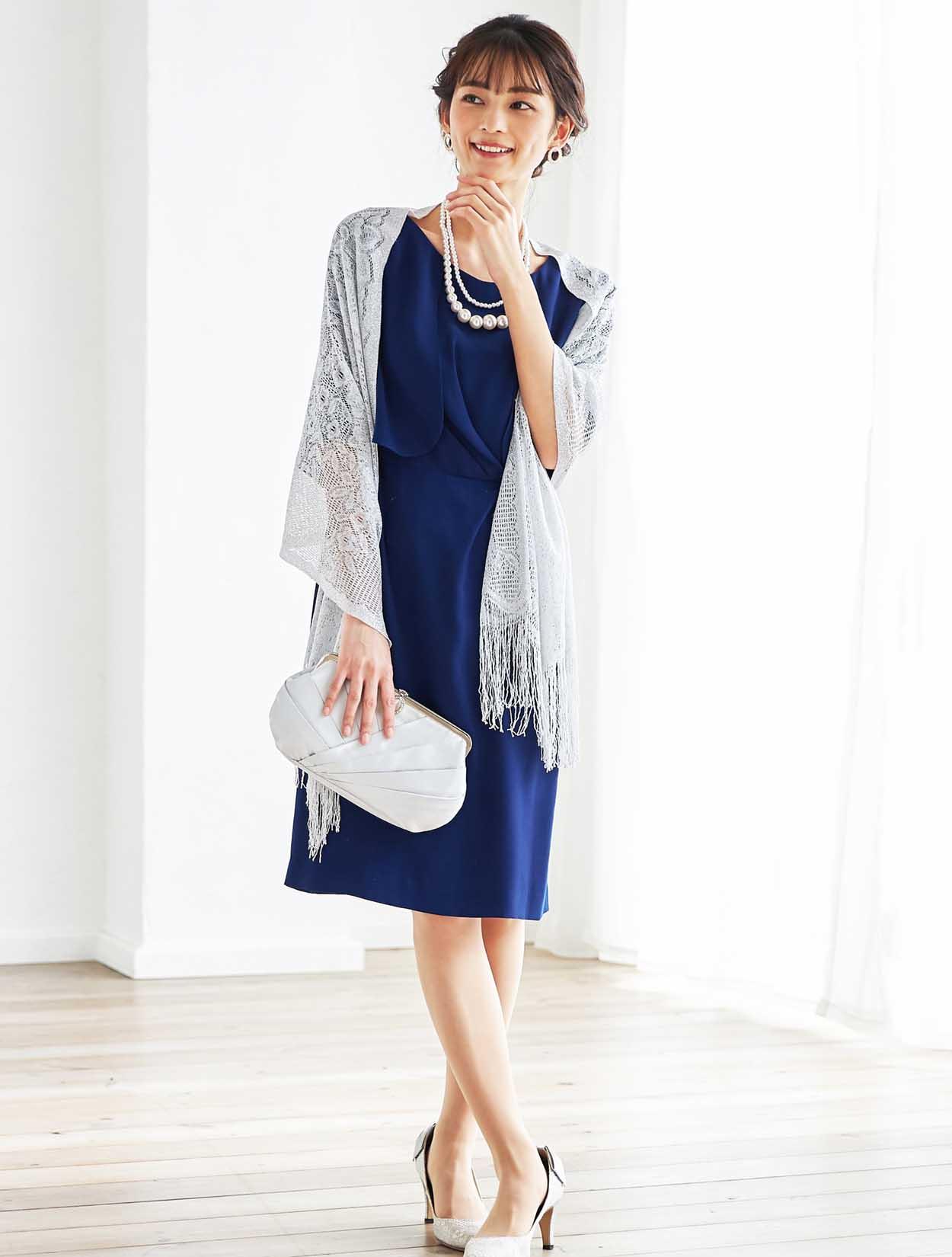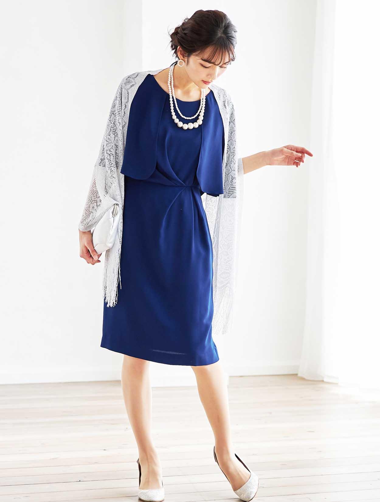 鮮やかなブルーのドレスにシルバーのストールを合わせ写真映えする華やかなコーディネートになっています。