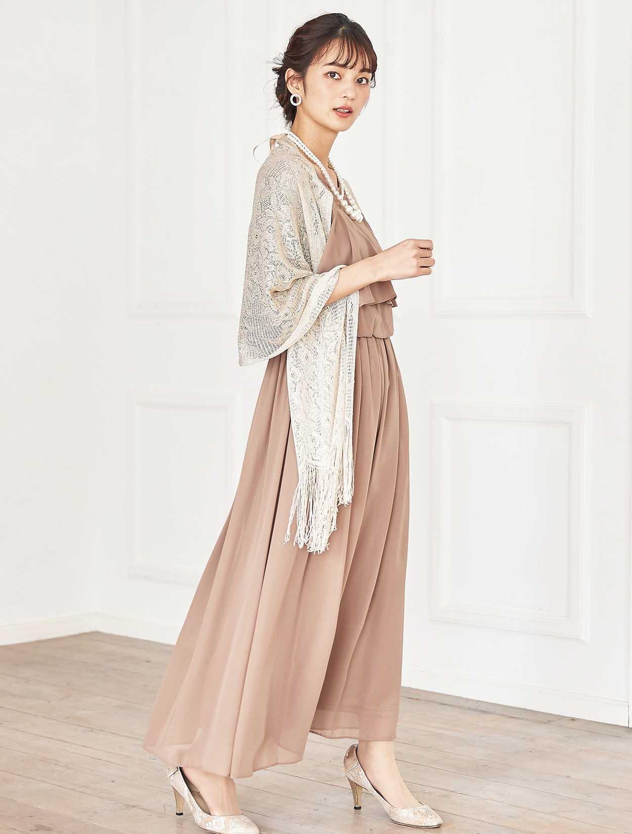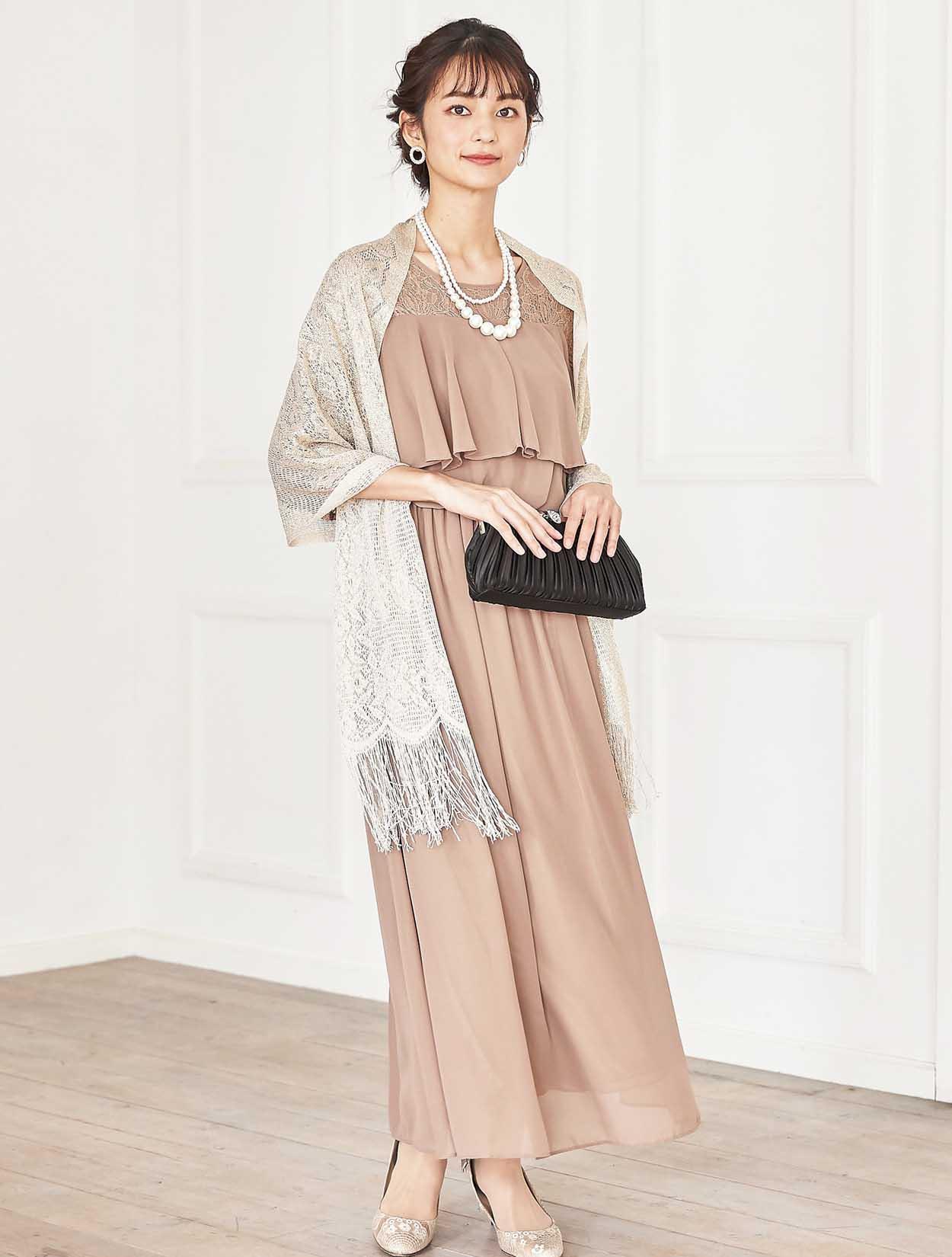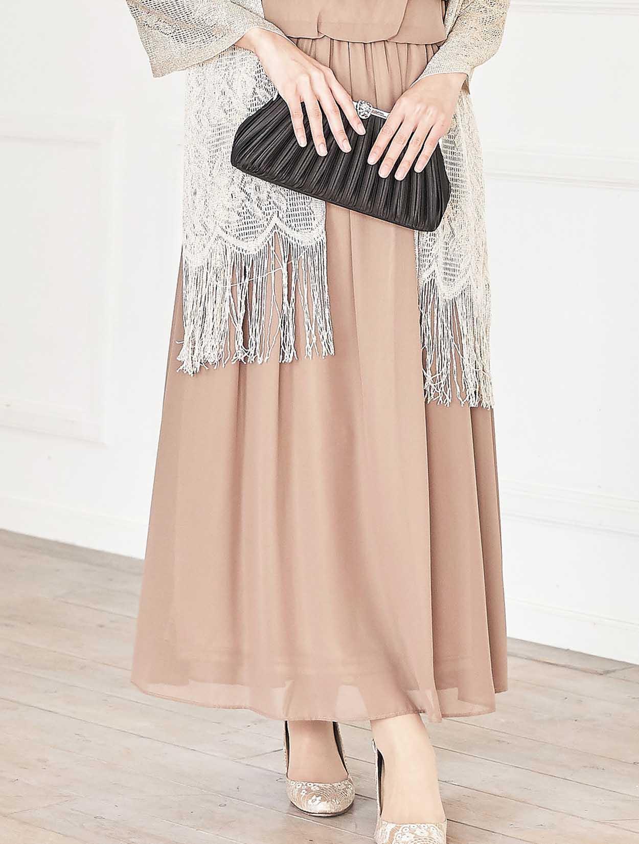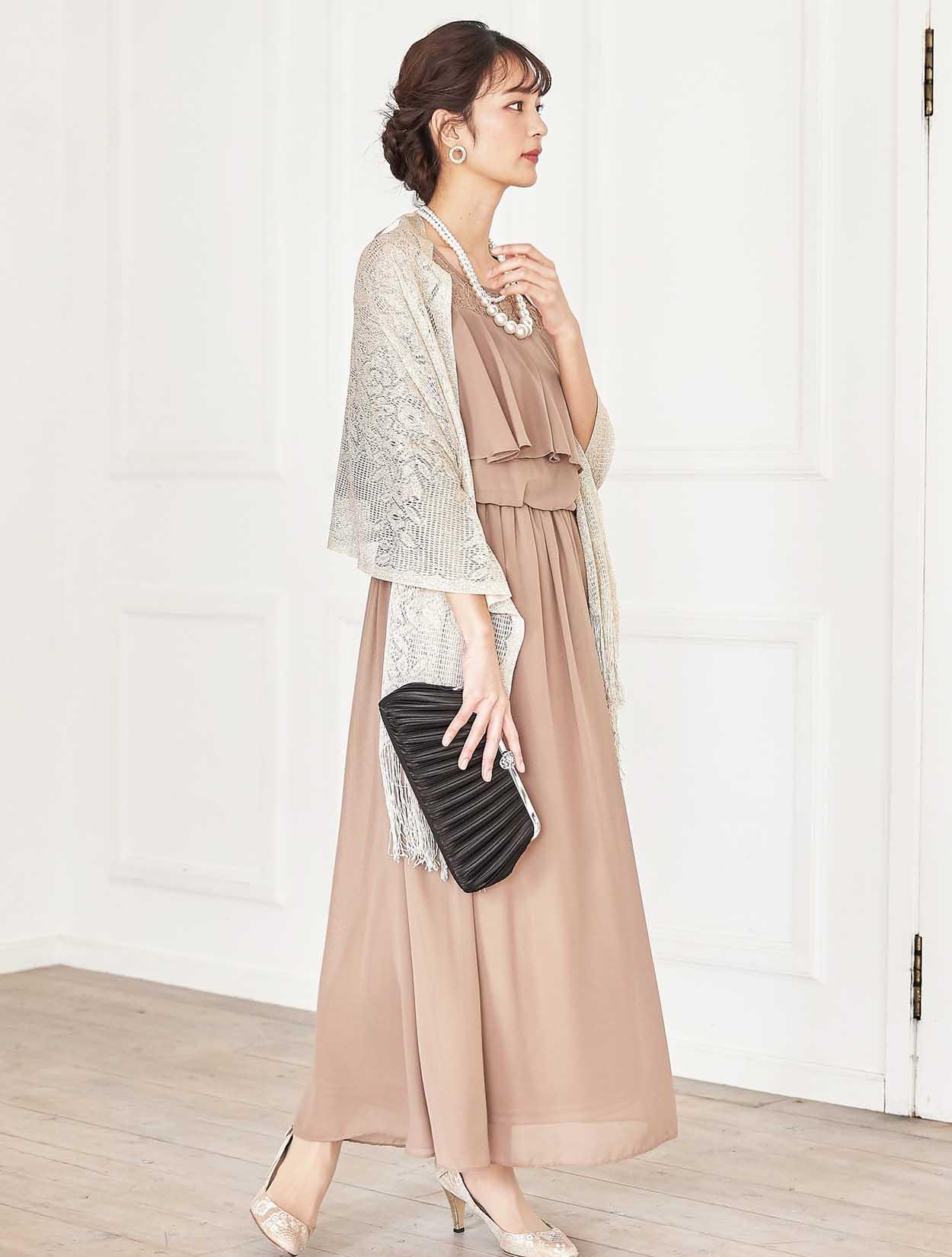 ライトな着心地に透け感のあるシフォン生地と上品なレースを使用。ロングドレスでもエアリーで軽さのあるシルエットです。