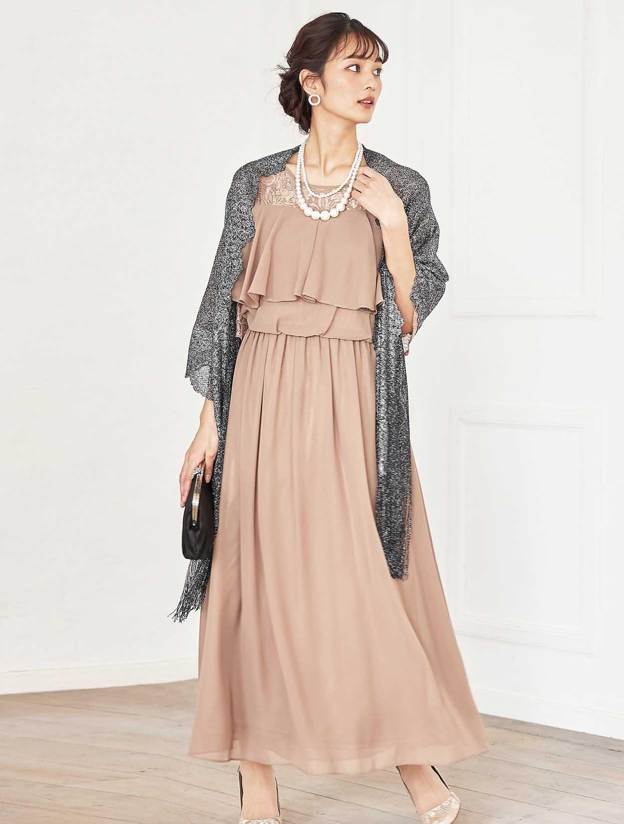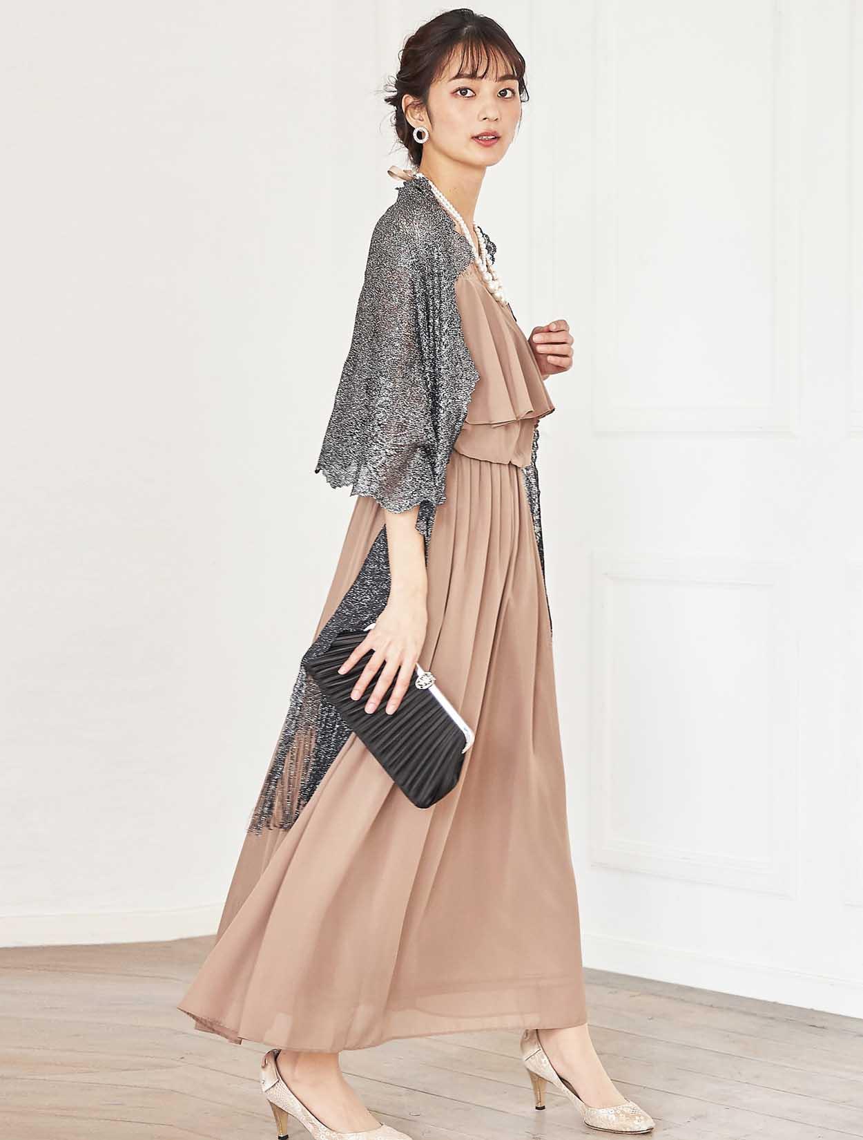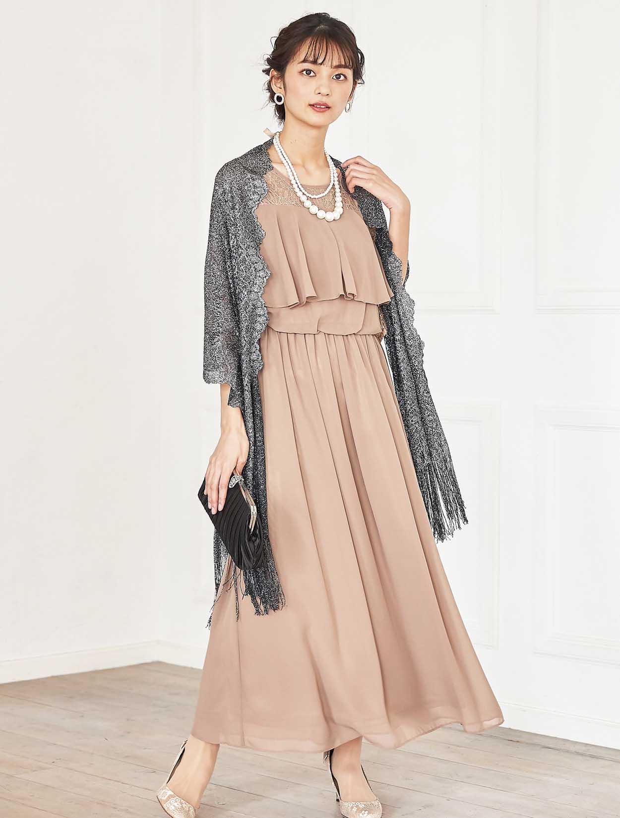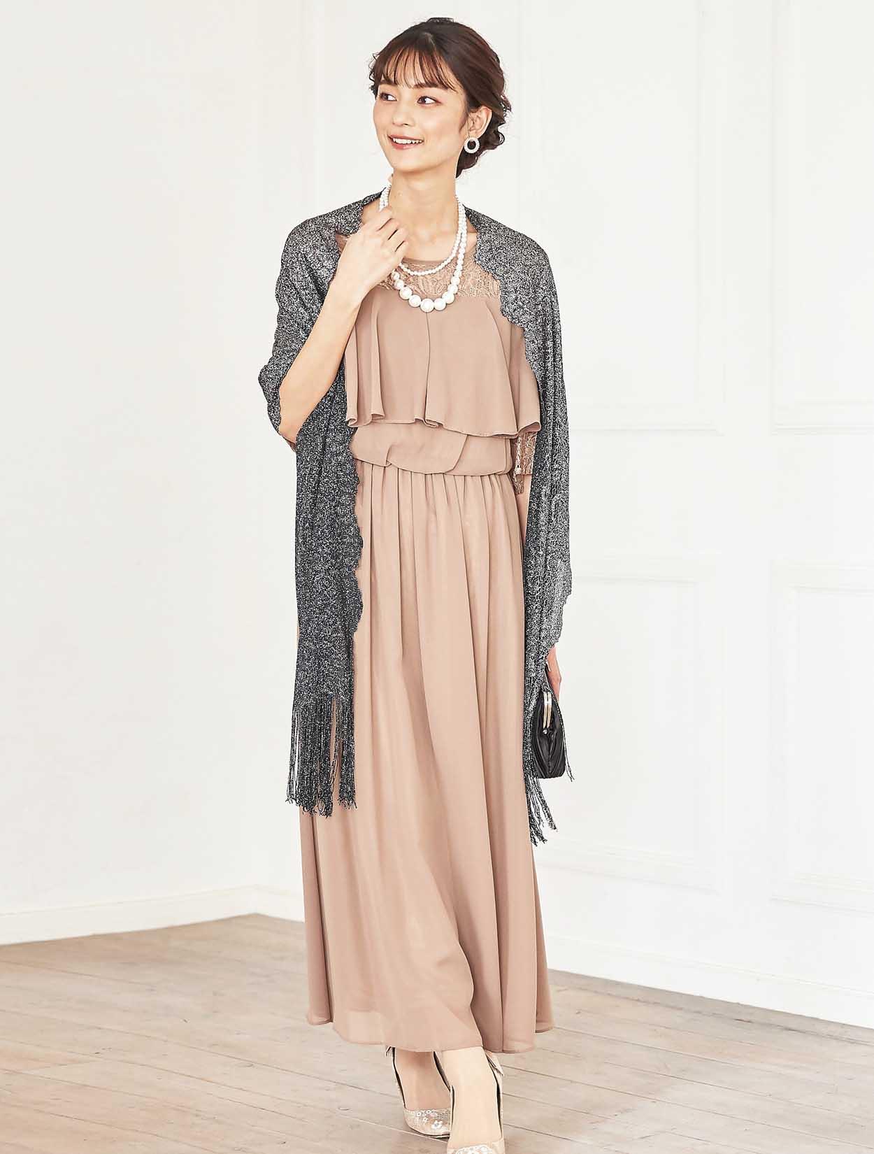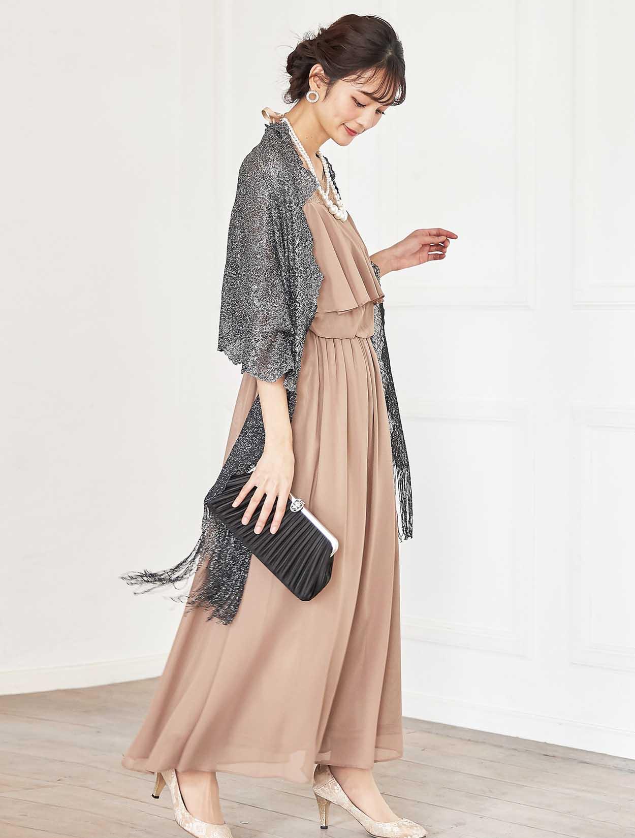女性らしいベージュのドレスにブラックのショールを合わせた、クールなコーディネート。