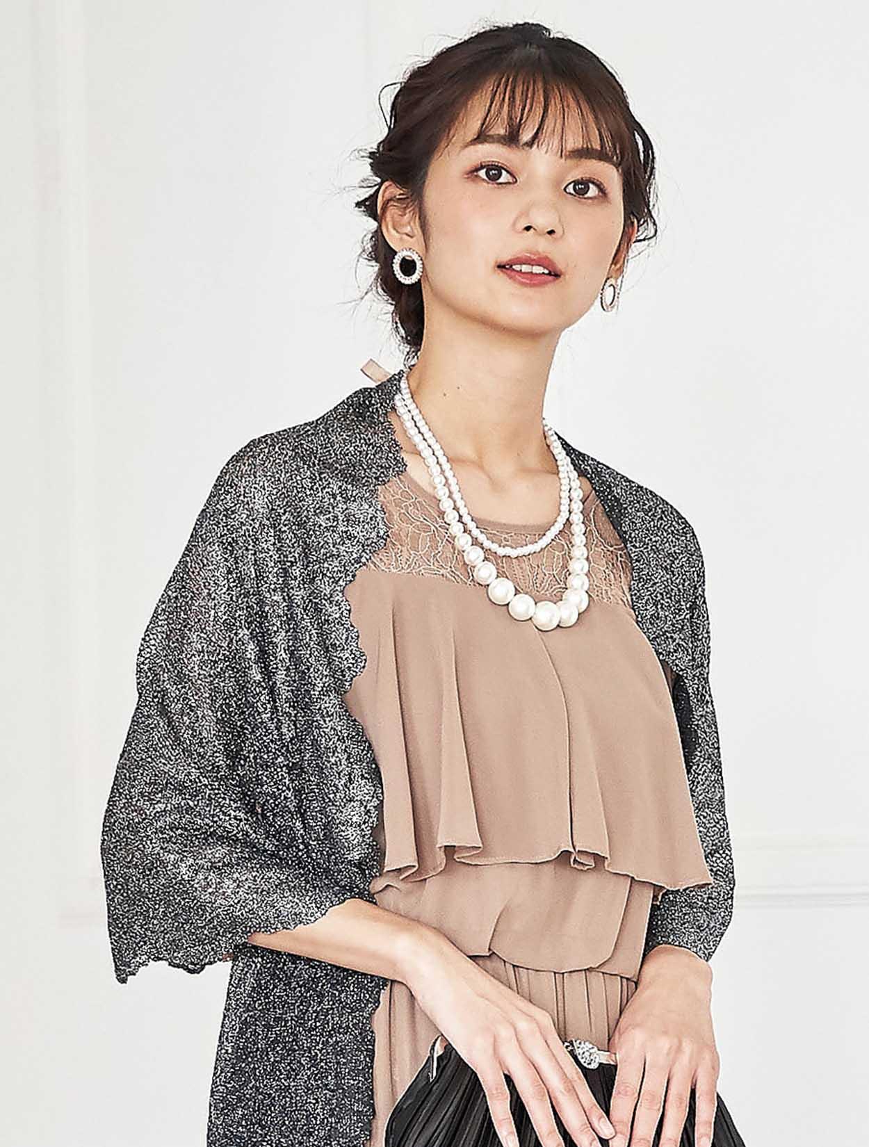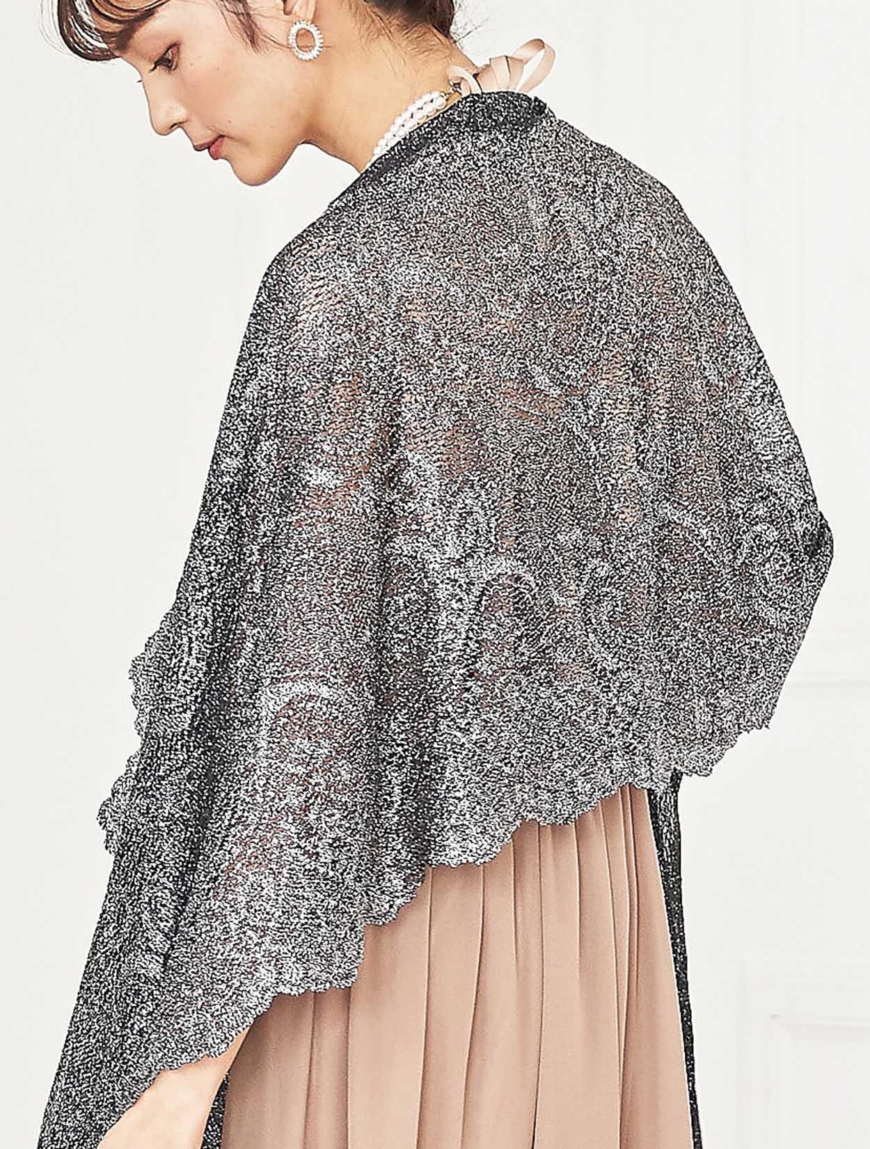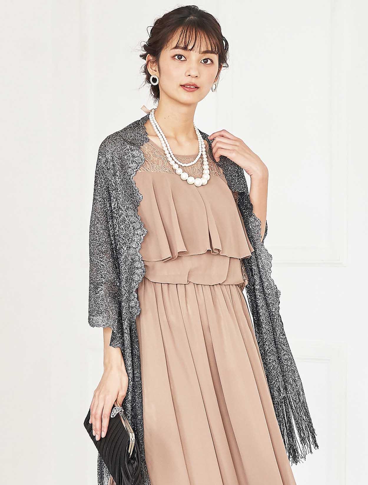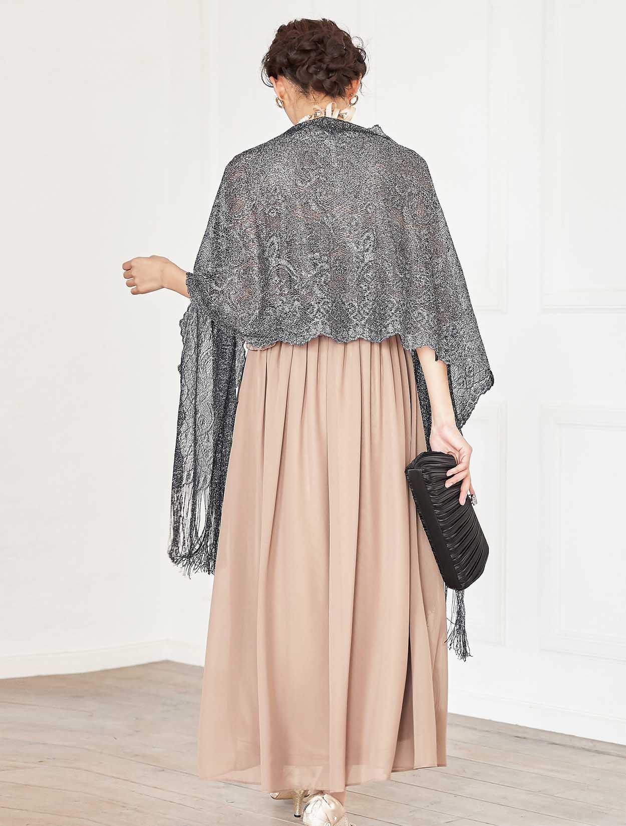 ラメ入りのショールとデコルテ部分のレースが華やかさを演出してくれます。