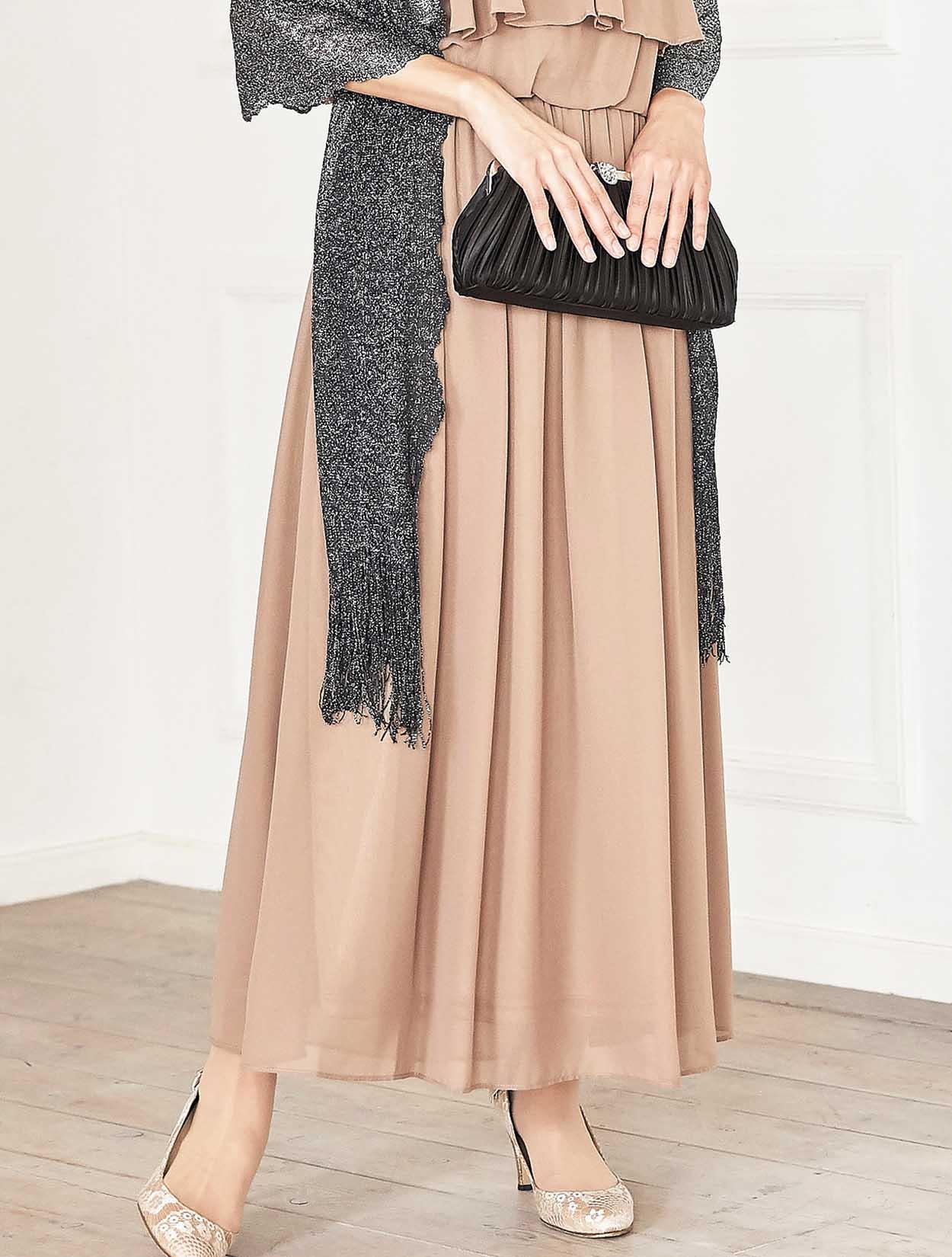 ライトな着心地に透け感のあるシフォン生地と上品なレースを使用。ロングドレスでもエアリーで軽さのあるシルエットです。