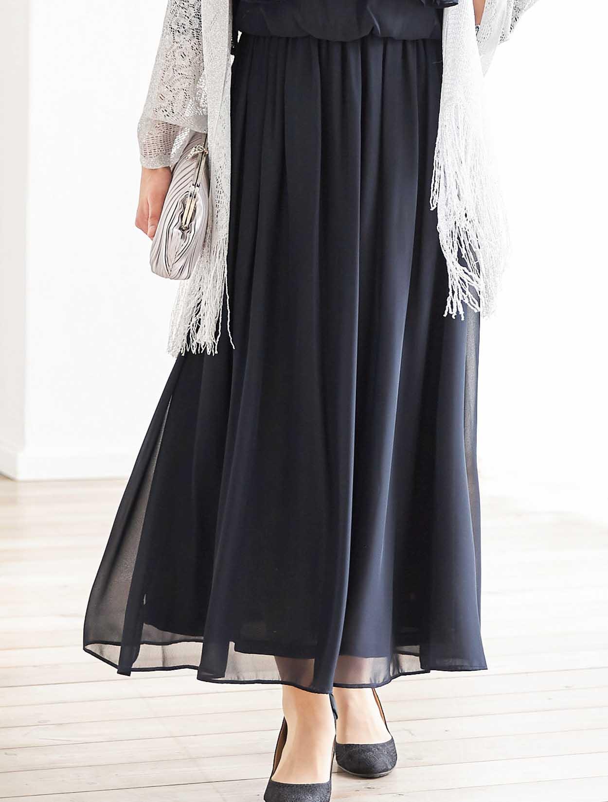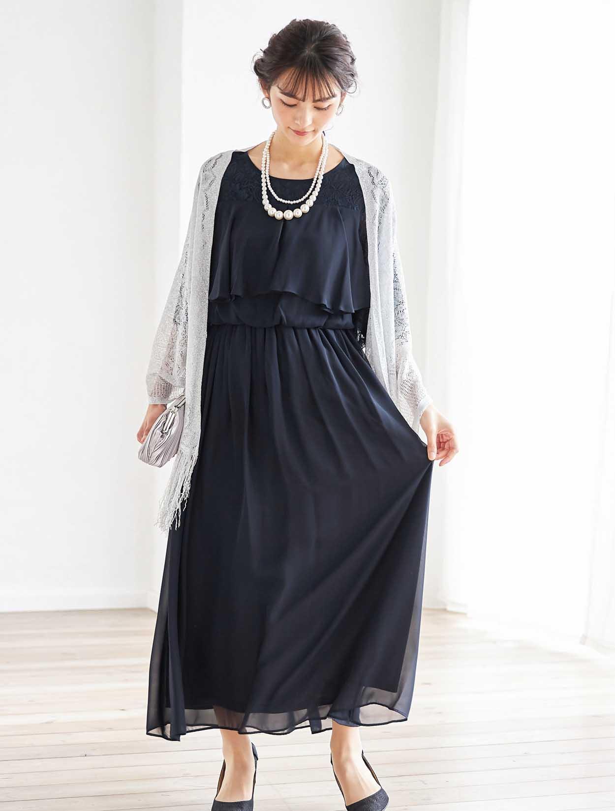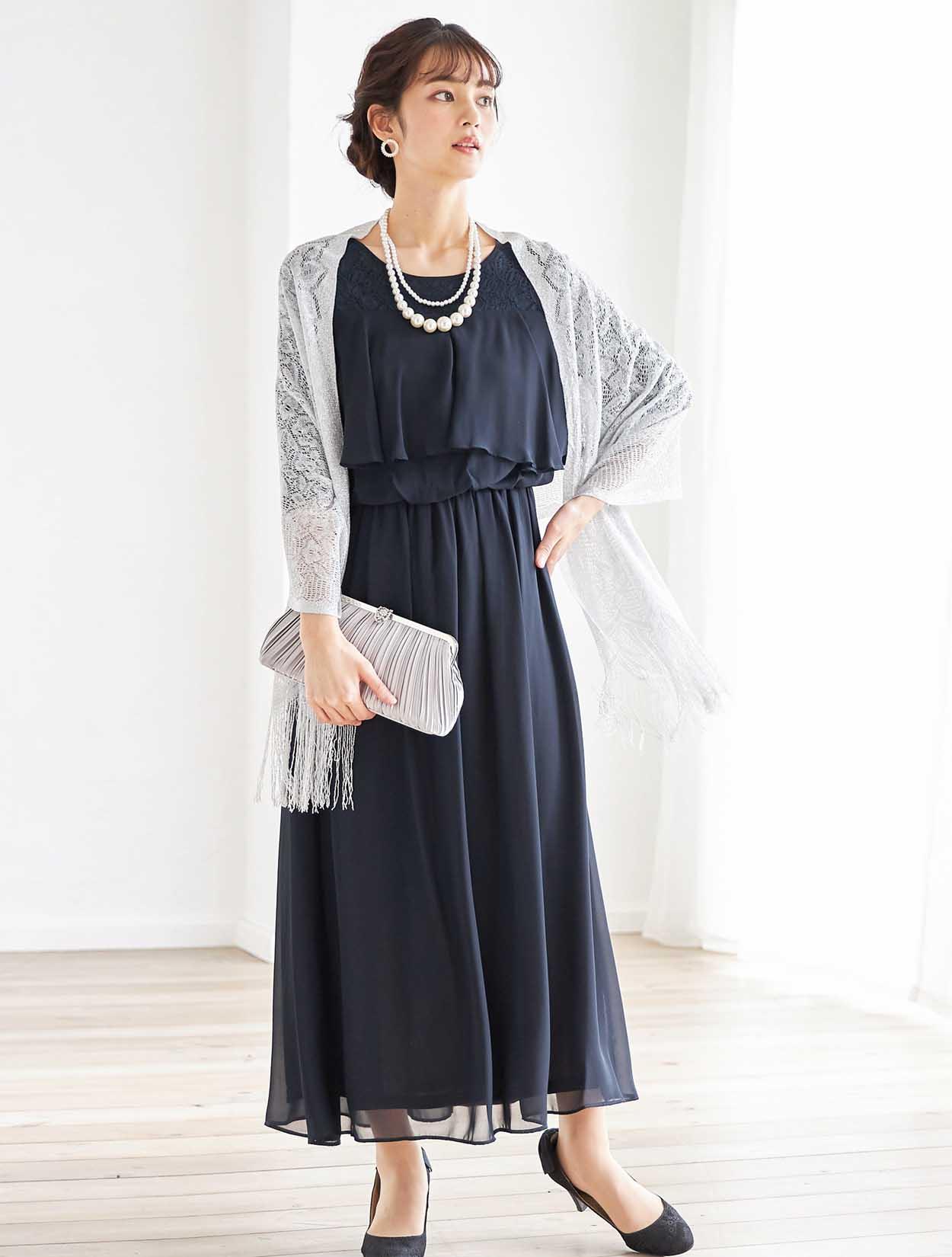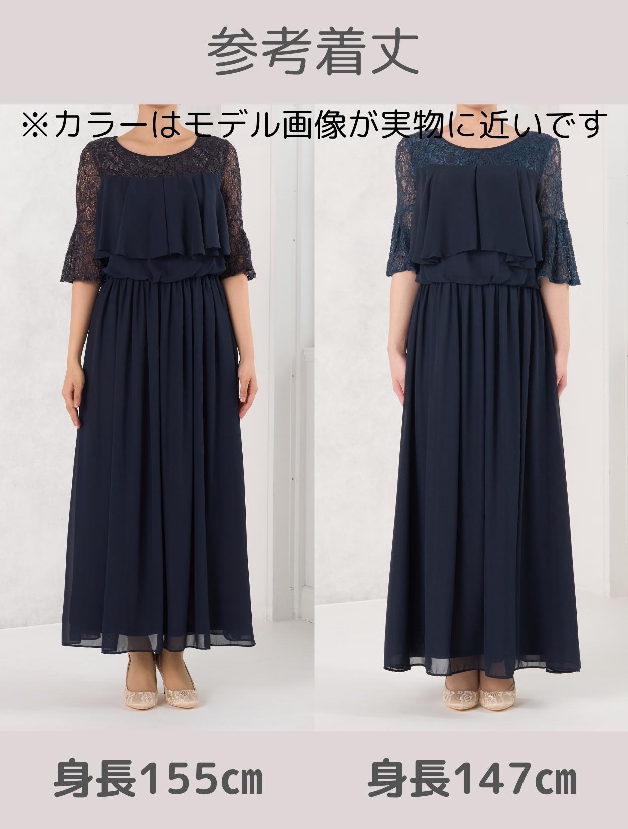 ライトな着心地に透け感のあるシフォン生地と上品なレースを使用。ロングドレスでもエアリーで軽さのあるシルエットです。