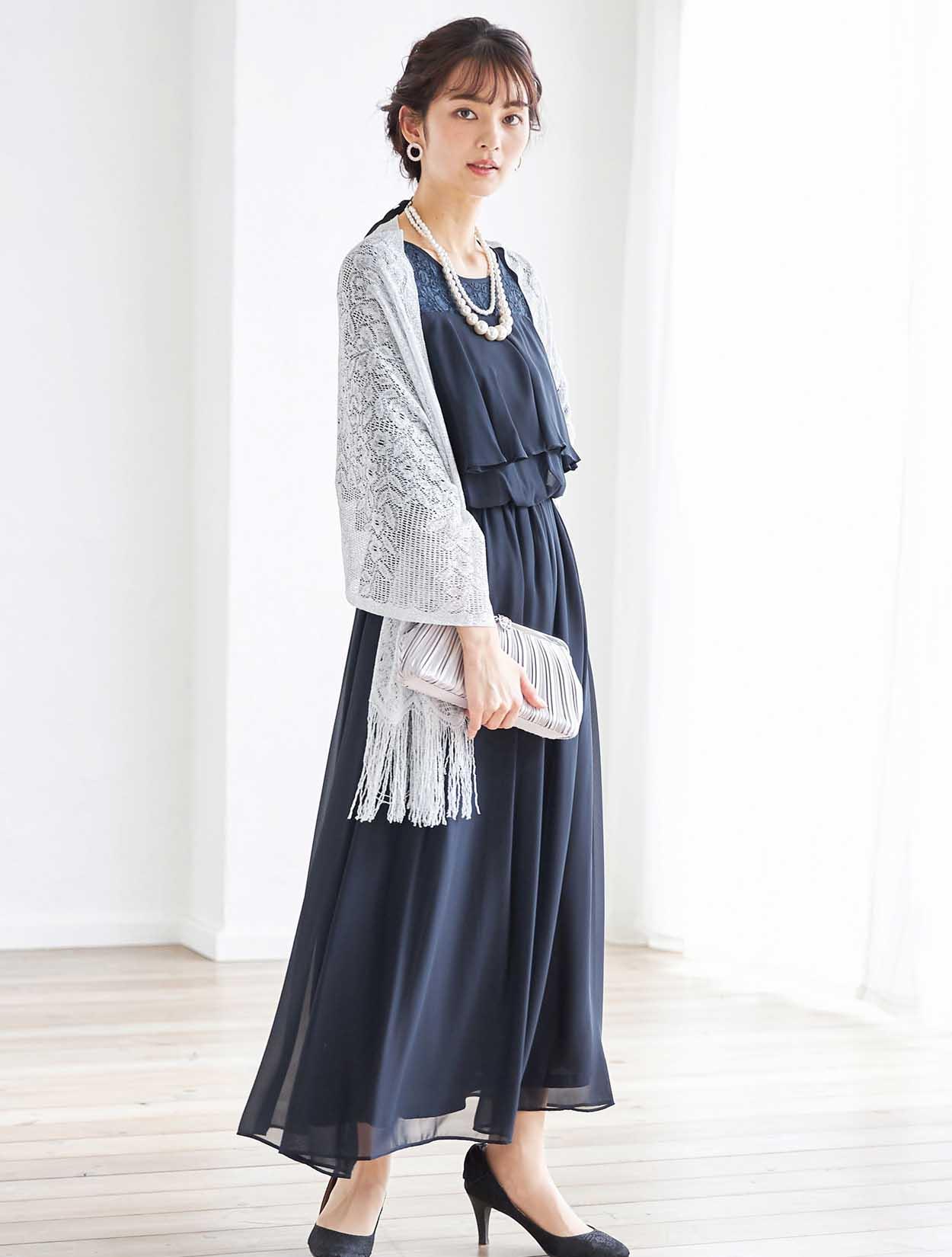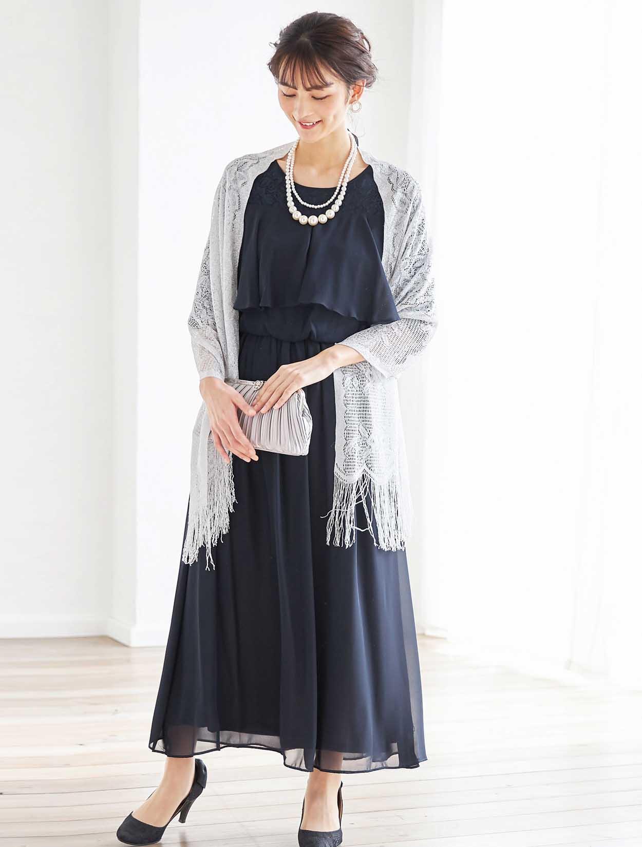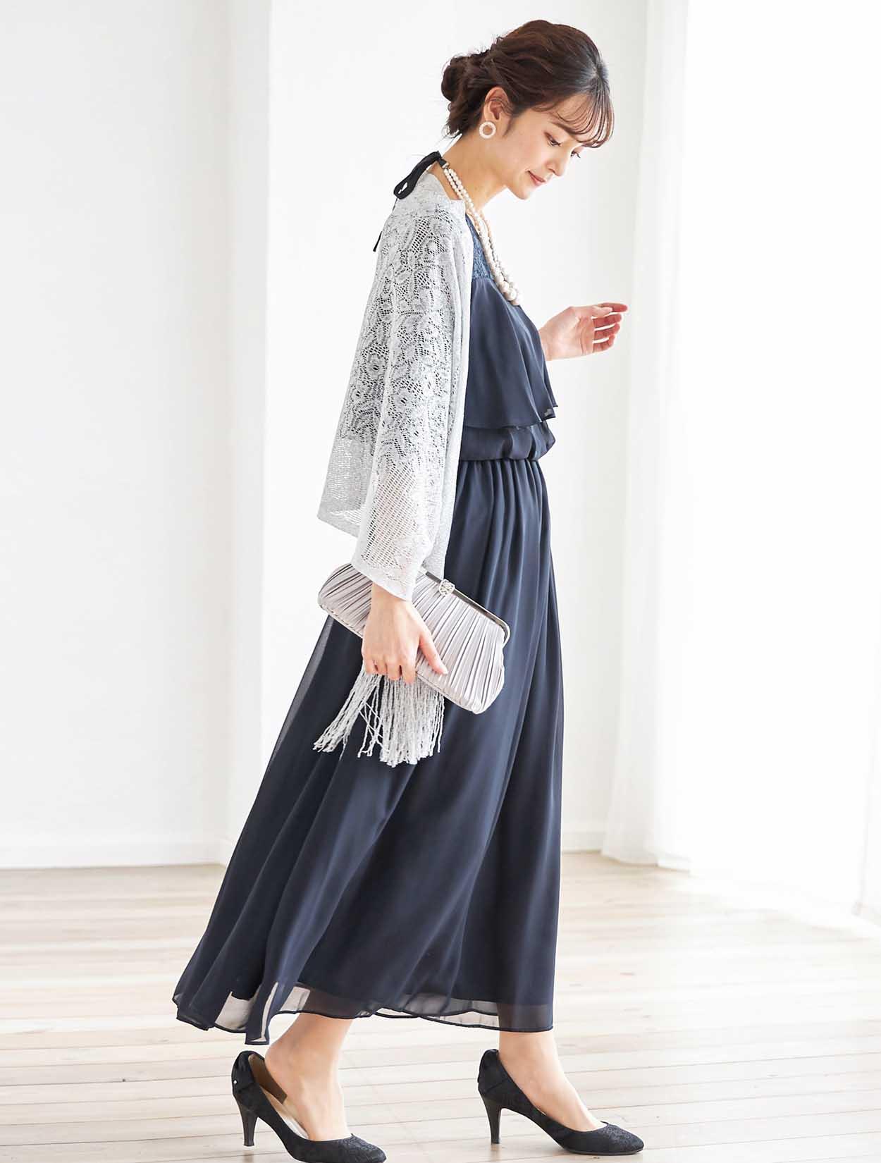 着心地の良いネイビードレスに華やかさのあるシルバーの小物でまとめた上品なコーディネート。