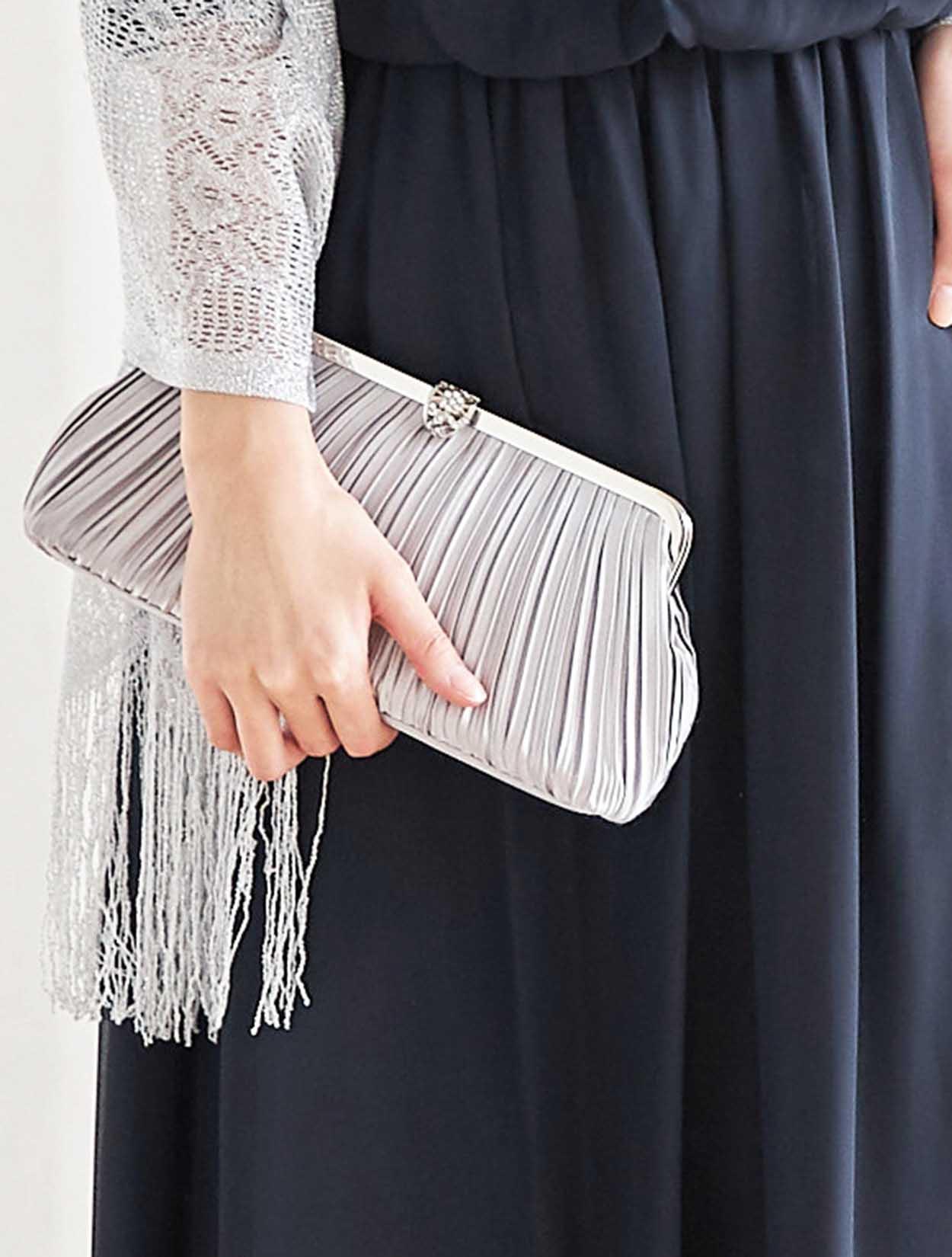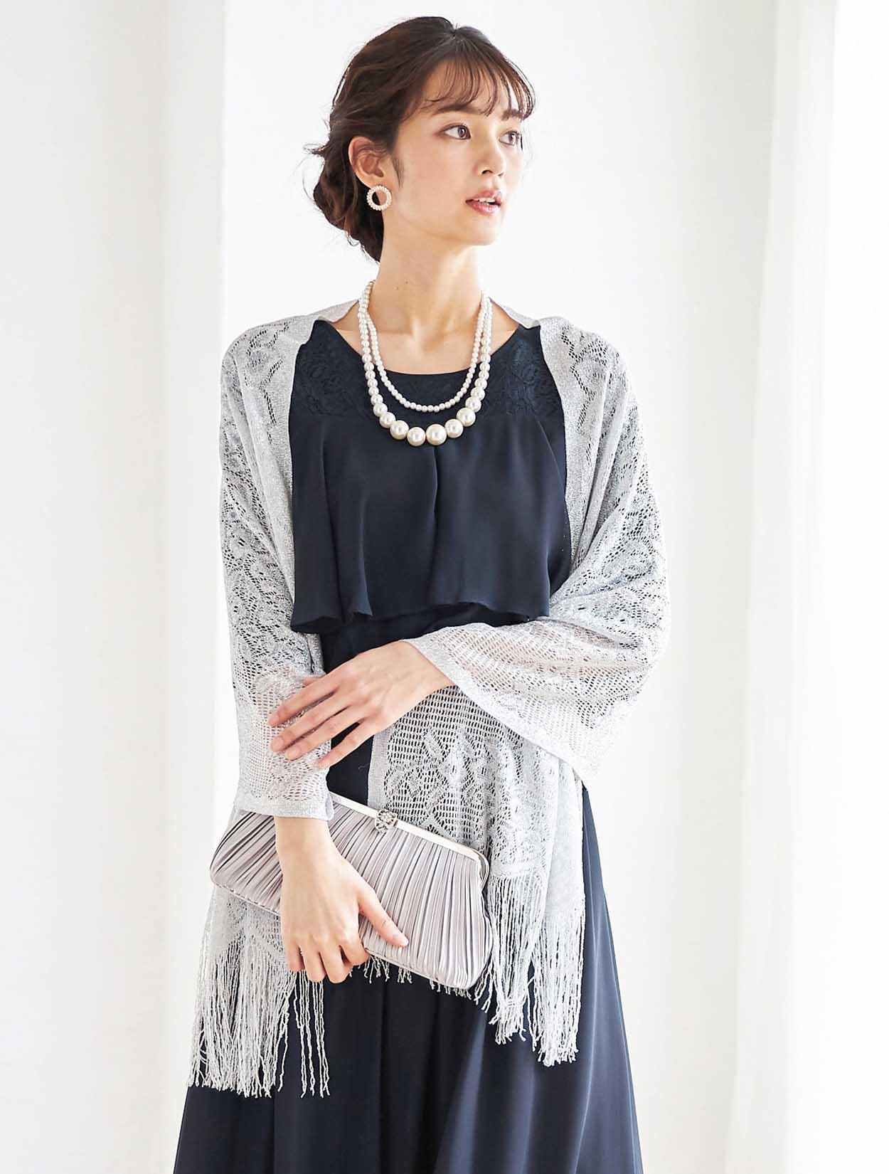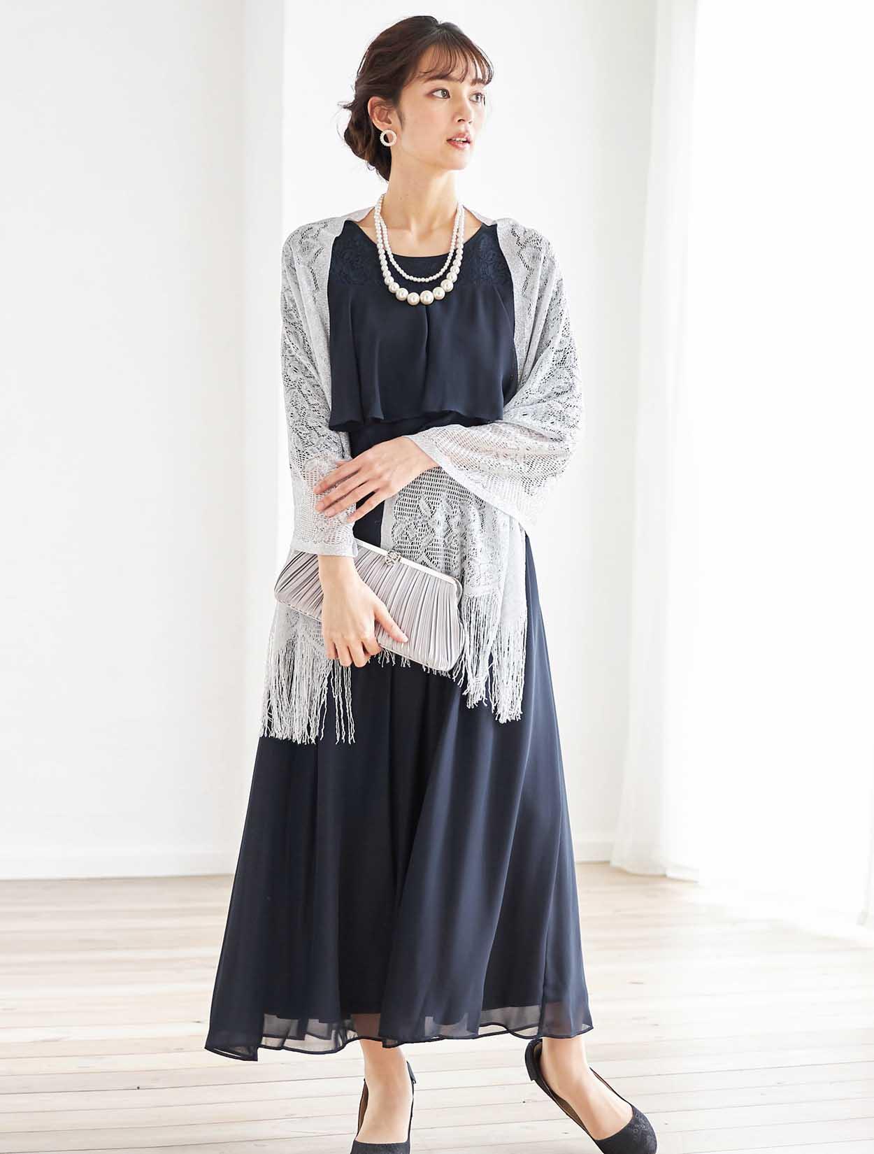 着心地の良いネイビードレスに華やかさのあるシルバーの小物でまとめた上品なコーディネート。