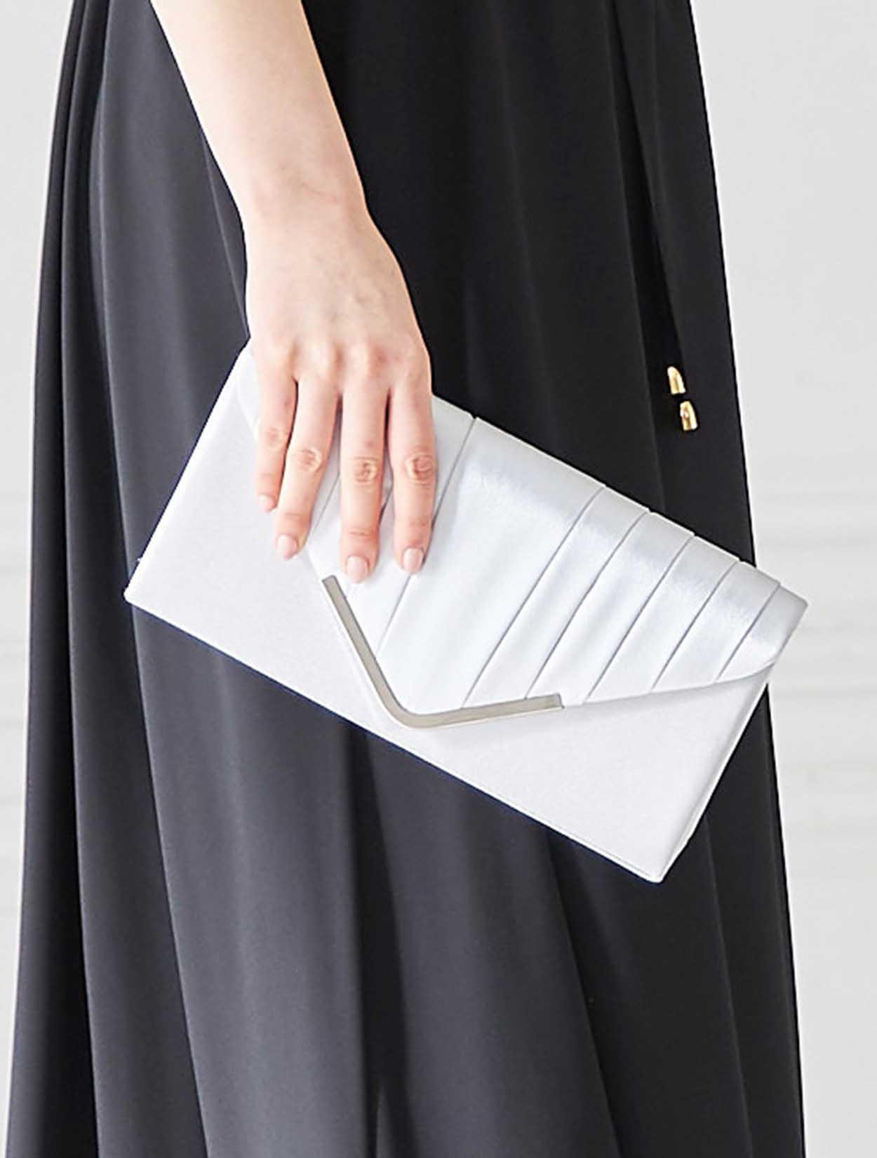 ブラックのロングドレスとシルバー系カラーを合わせたコーディネート。スッキリとしたノーカラージャケットにシンプルなサテンバッグが落ち着いた女性らしい印象です。