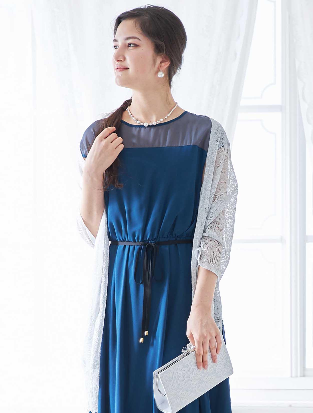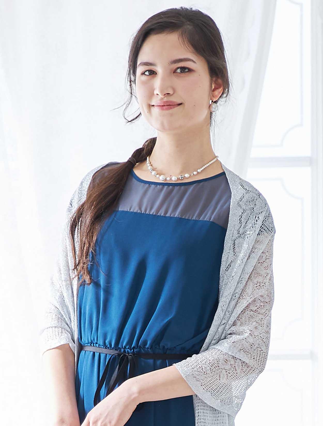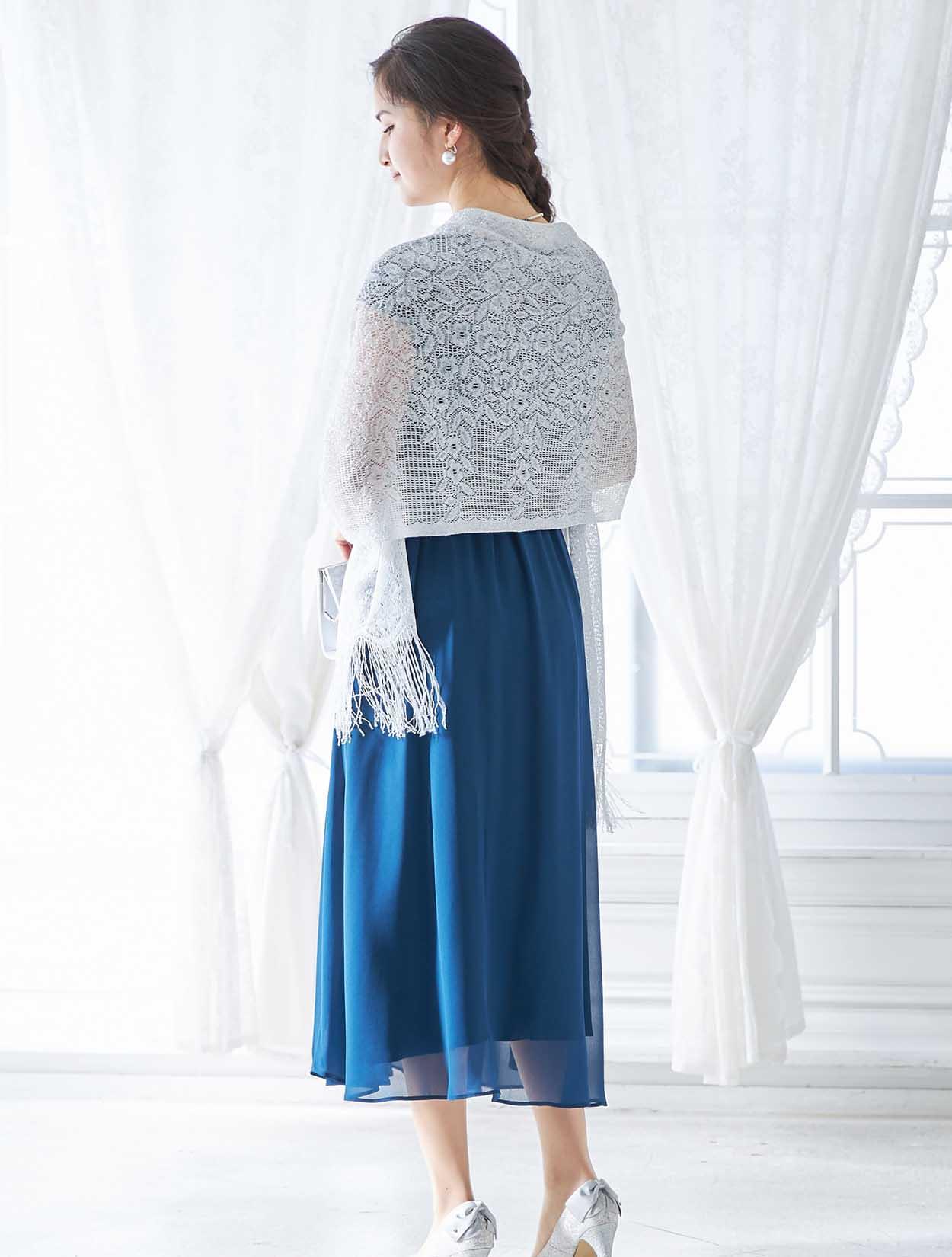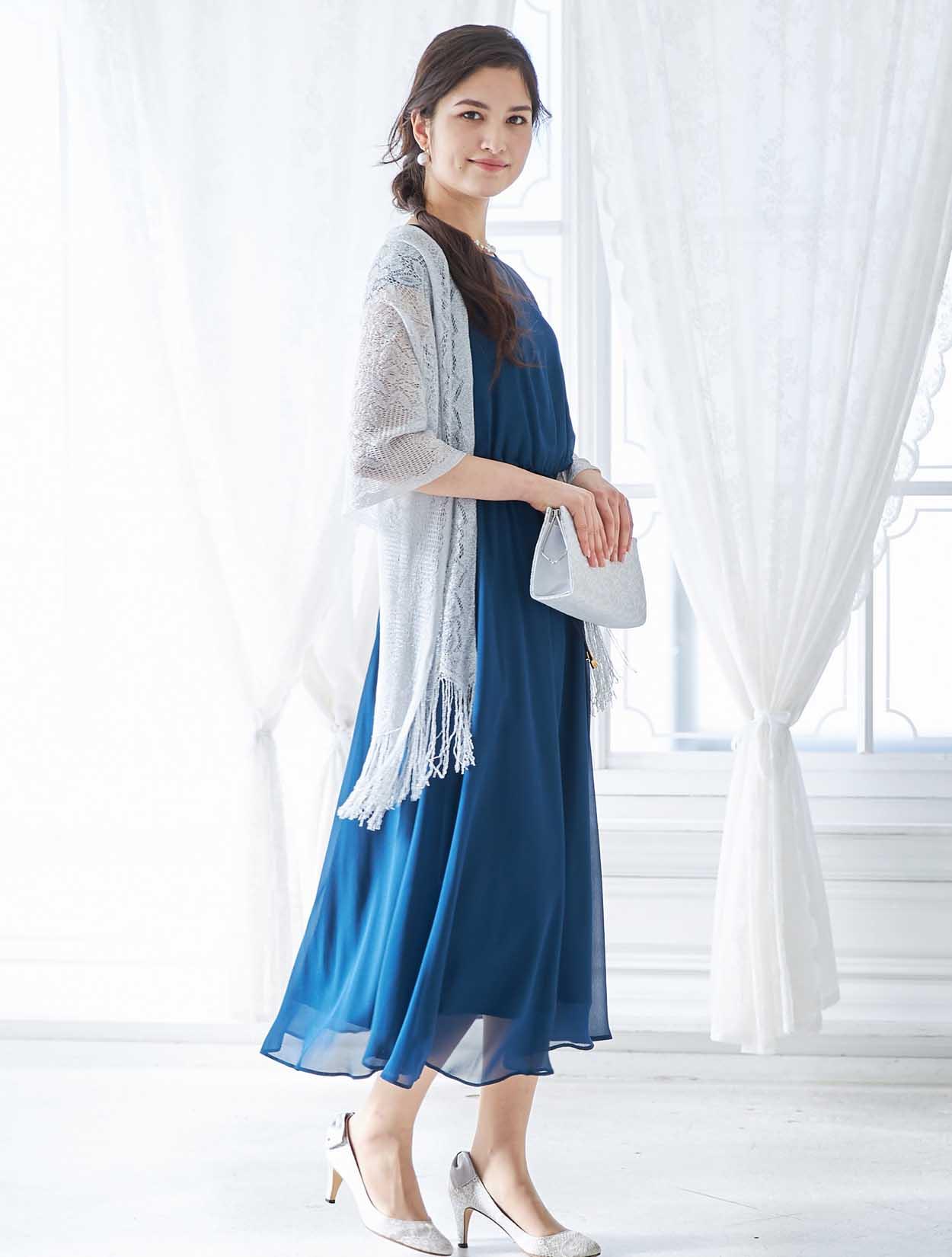 ブルーのドレスに映えるシルバーが爽やかで印象的なコーディネートです。ショールの繊細なラメ感がロング丈のドレッシーな雰囲気にぴったりな大人のスタイリング。