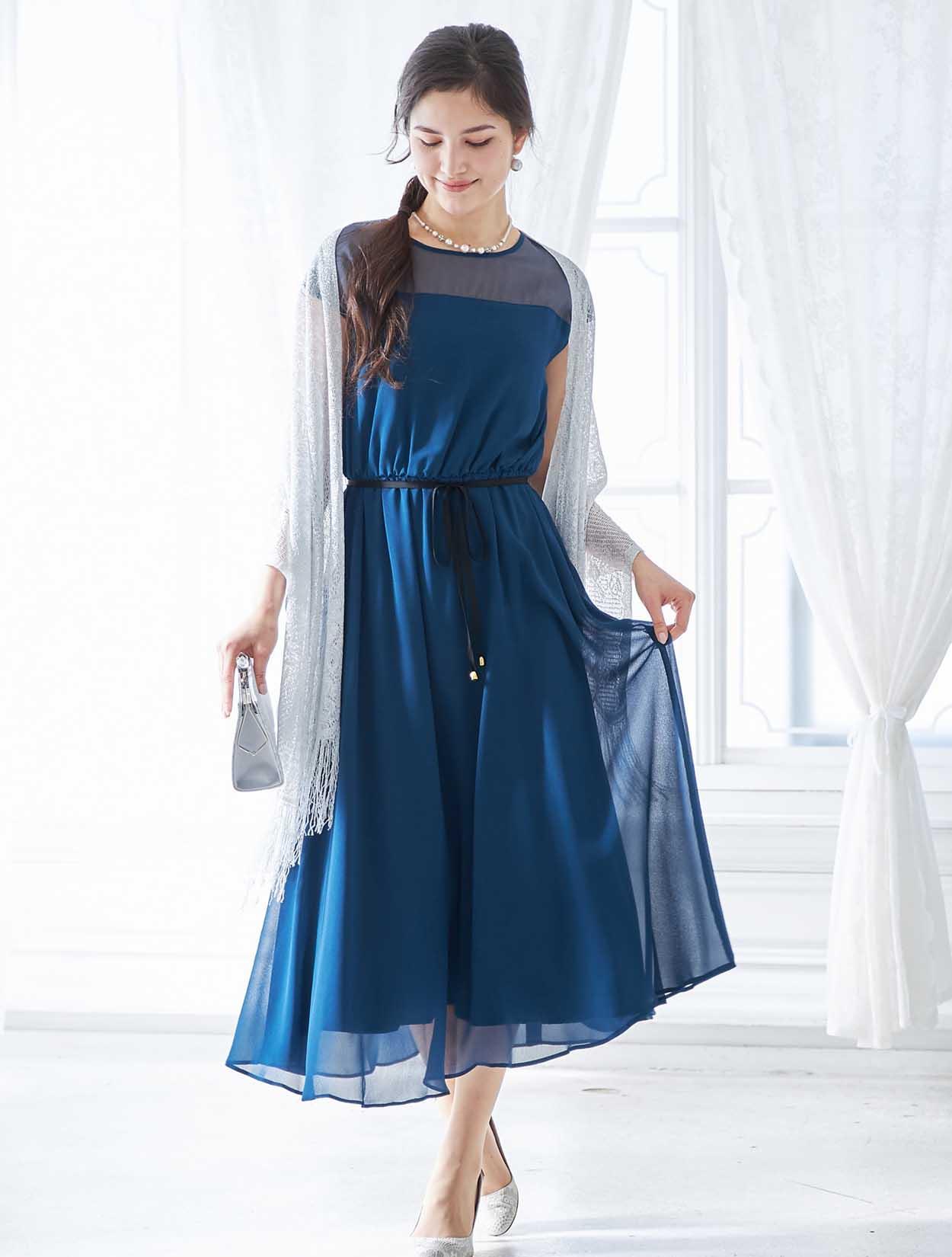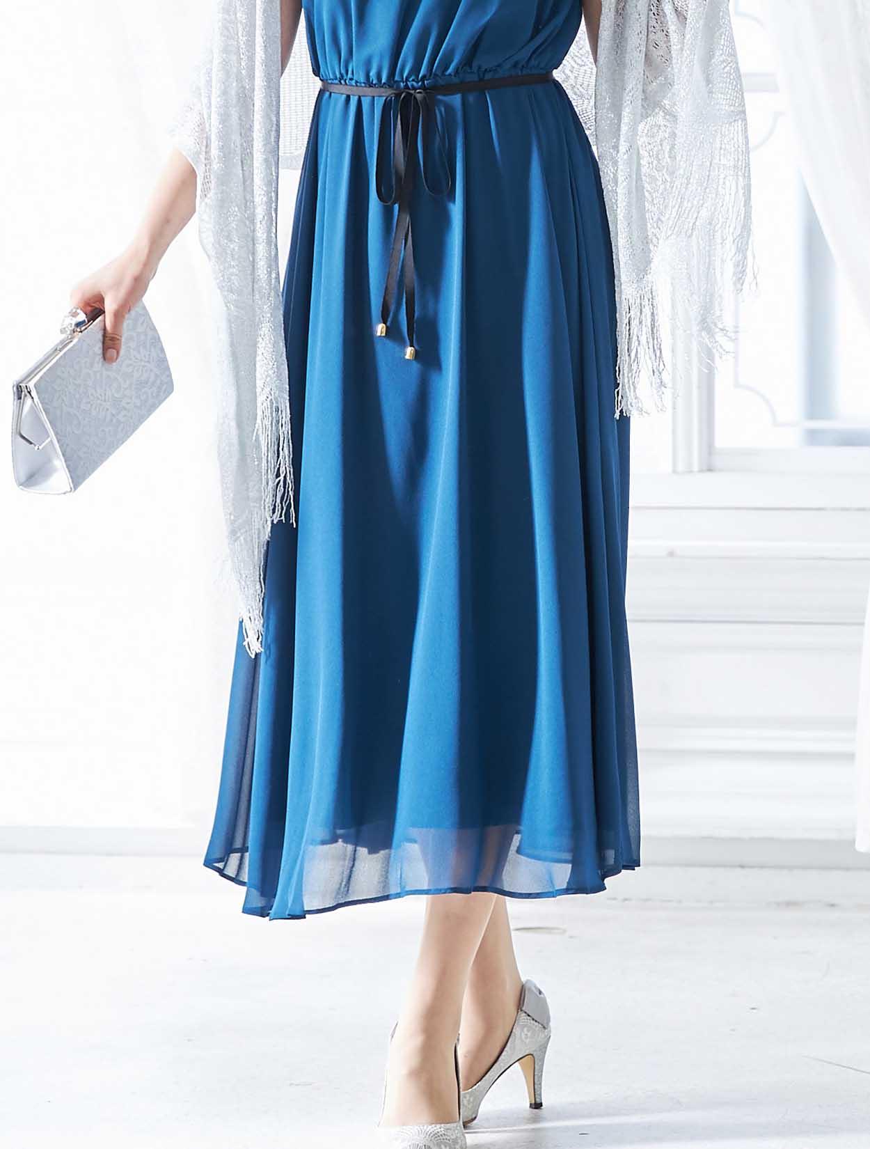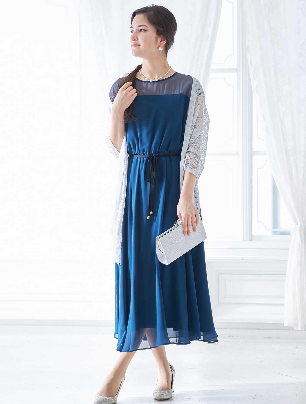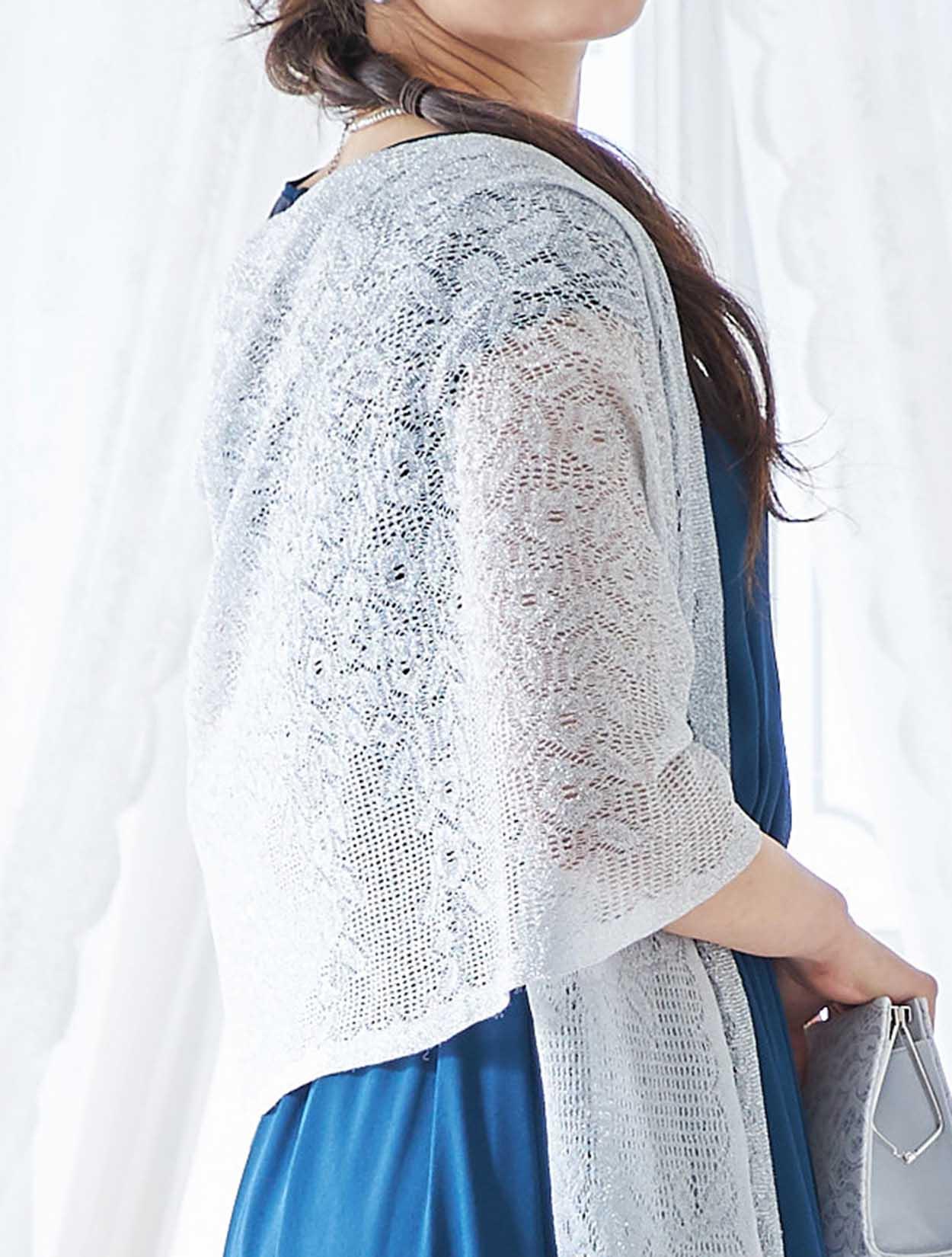 ブルーのドレスに映えるシルバーが爽やかで印象的なコーディネートです。ショールの繊細なラメ感がロング丈のドレッシーな雰囲気にぴったりな大人のスタイリング。